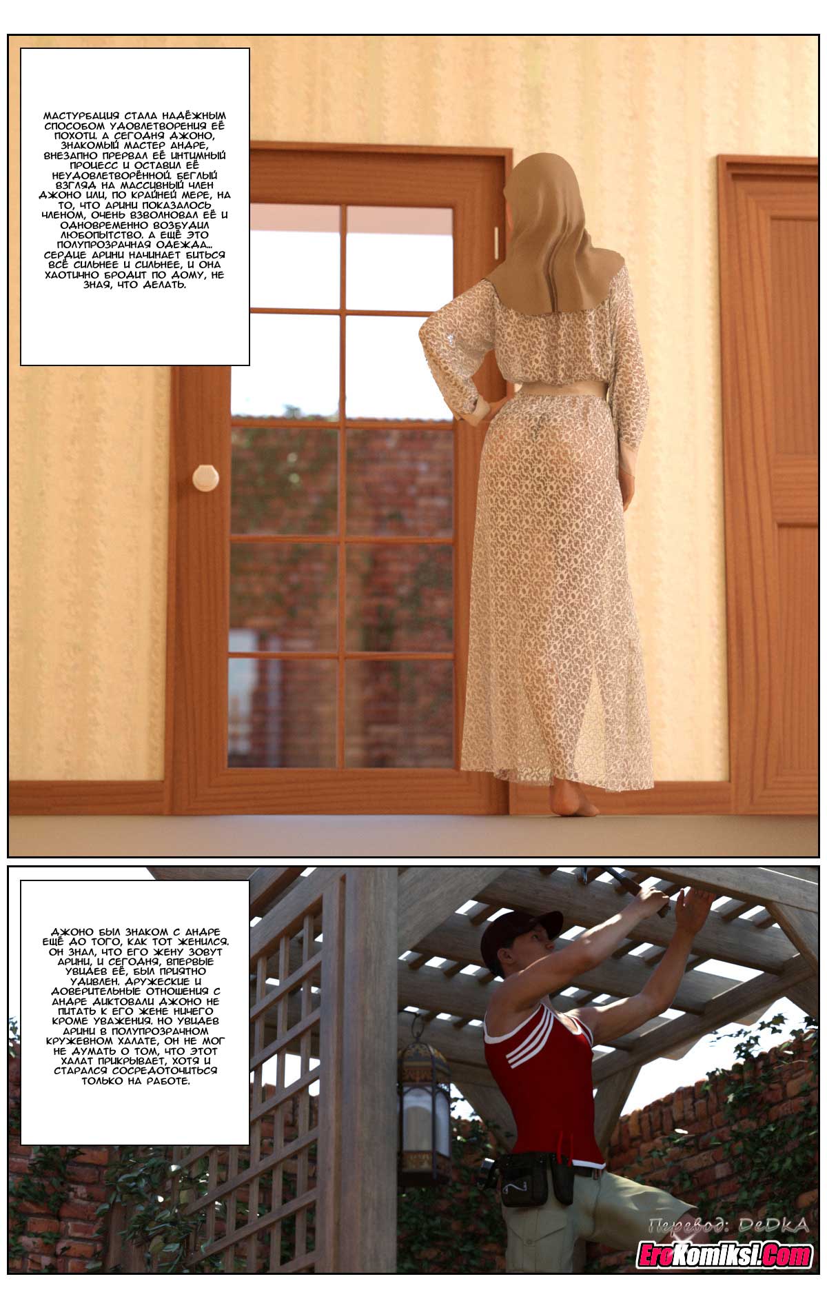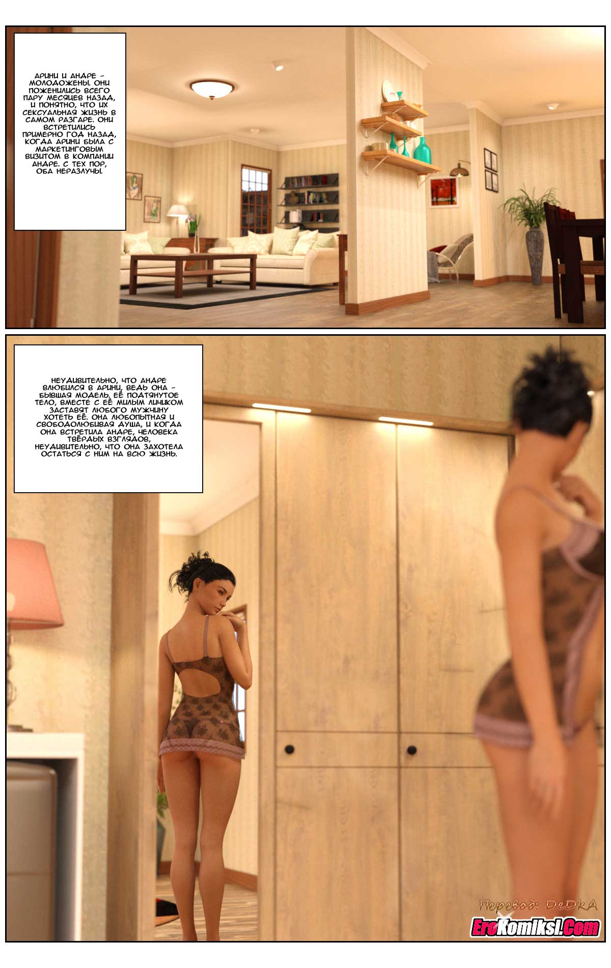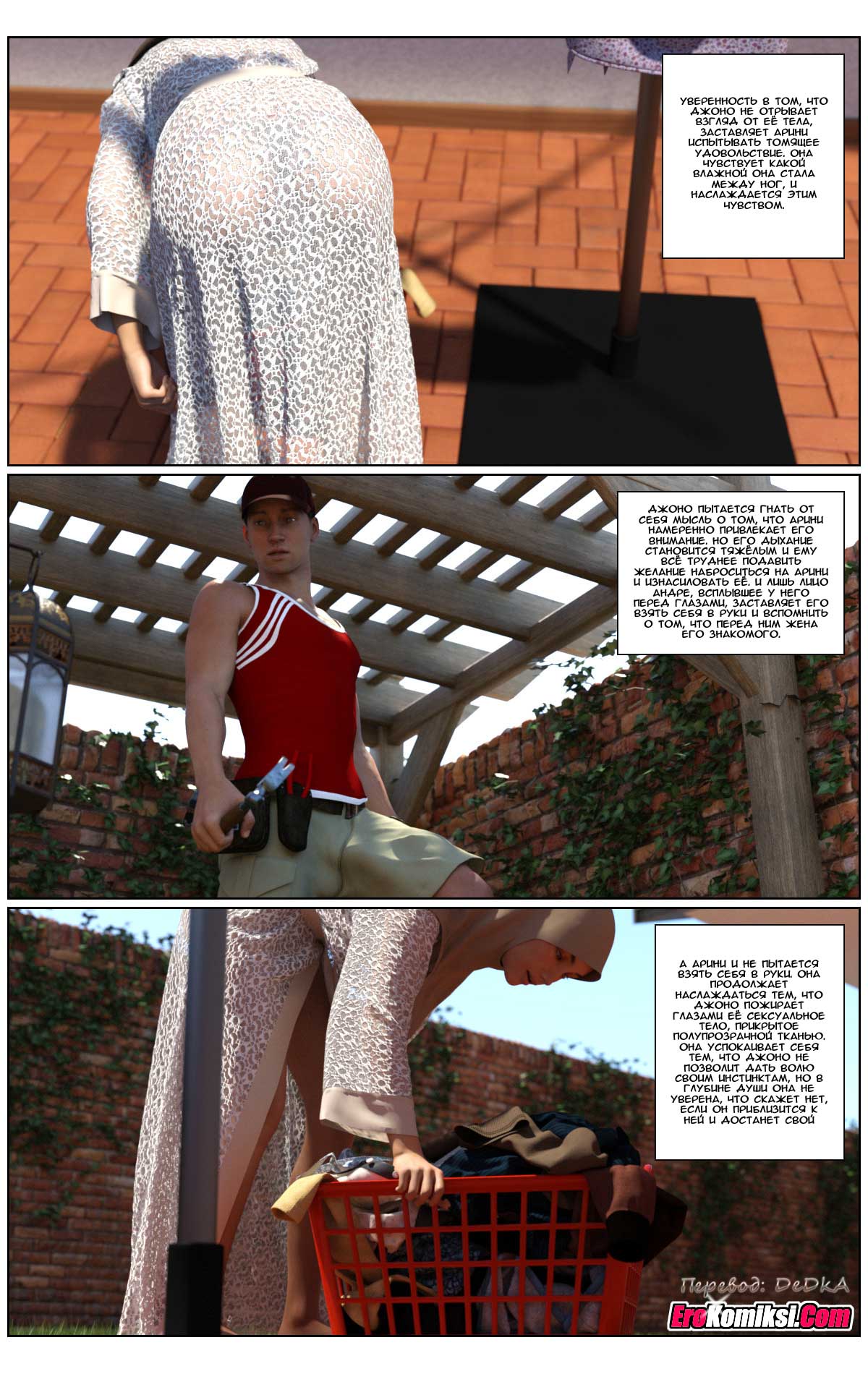 Арини, молодая красавица, бывшая модель и Андре, молодой, успешный и состоятельный бизнесмен однажды встретились, чтобы больше никогда не расставаться. Их брак был похож на сказку. Особенно, и это естественно, это касалось секса, которым они занимались при каждом удобном случае. Но однажды подруга Арини рассказала ей о своей счастливой сексуальной жизни, указав при этом размеры мужского достоинства её мужа. После этого Арини стала сомневаться в полноте своего счастья, ведь размеры мужского достоинства её любимого Андре, мягко говоря, не дотягивали до описанного подругой образца. А тут ещё мастер, пришедший чинить веранду, явился в таких тесных шортах, что сквозь них отчётливо просматривались очертания настоящего женского счастья и сомнения Арини усилились ещё больше…