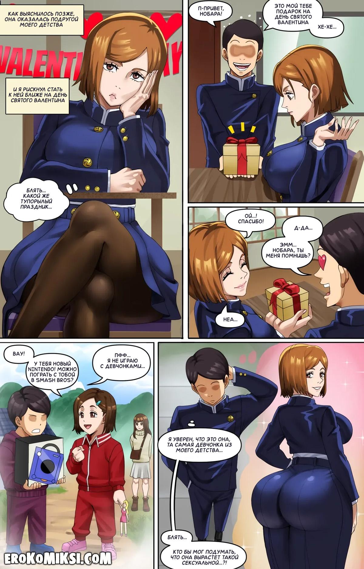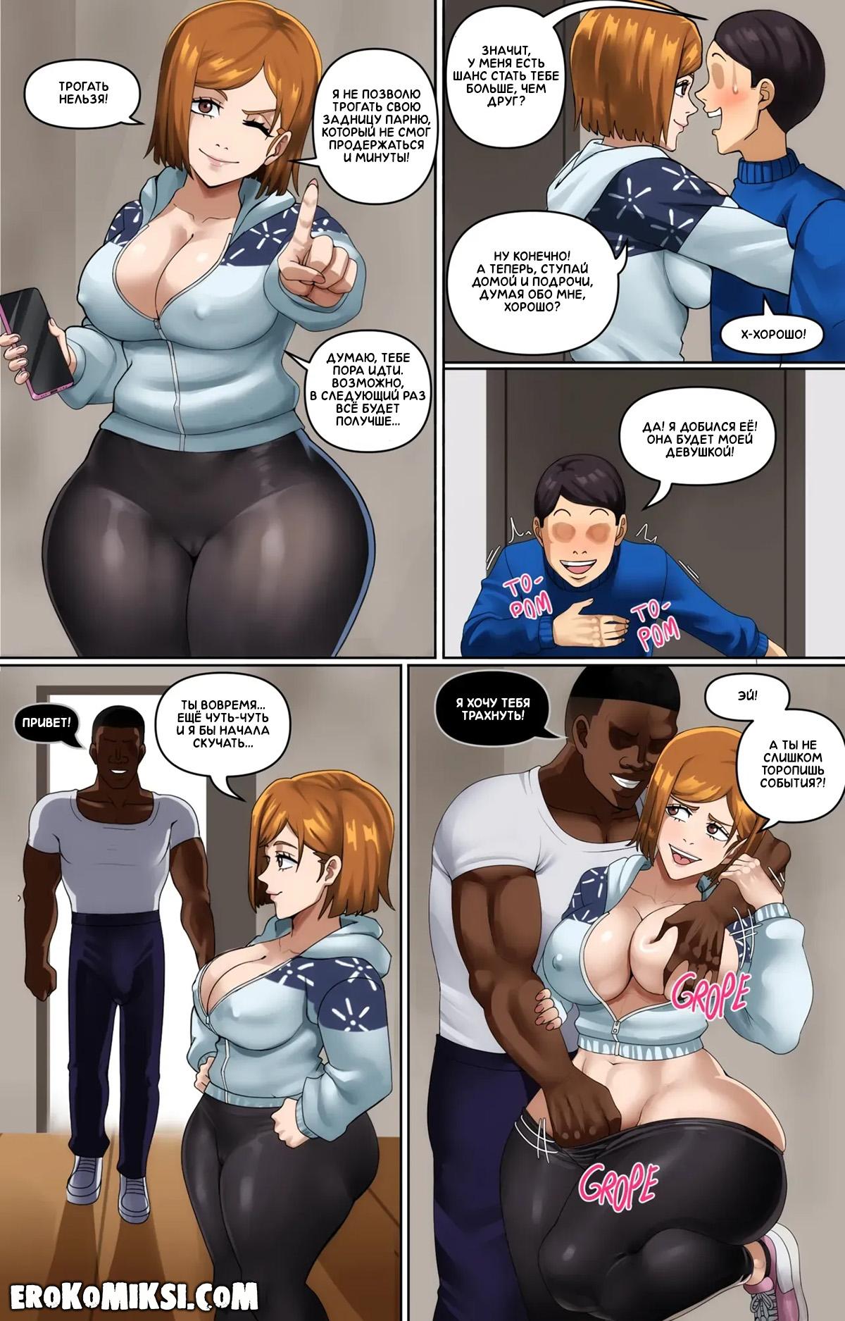Порно комикс Магическая битва. Второе свидание. Парнишка влюбляется в Нобару, которая в итоге соглашается пойти с ним на свидание, но как только видит его маленький член, то сильно расстраивается и отправляется на следующие свидание с негром, у которого оказывается огромный член…