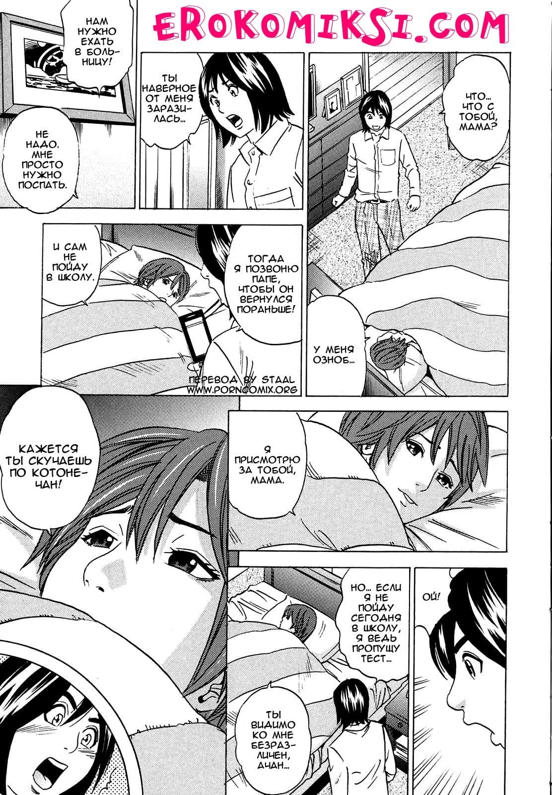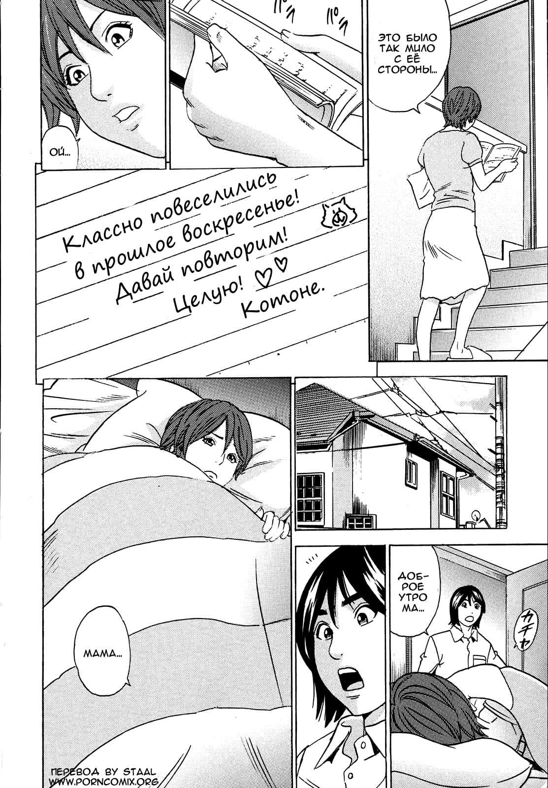 Перед вами порно манга инцест содержания речь, в которой пойдет о зрелой мамочке парня по имени Ачан. Женщина невероятно страстно любит своего выросшего сына, и поэтому она ни за что не потерпит рядом с ним ни одной соблазнительной соперницы женского пола. Вот и сегодня, стоило симпатичной девушке, с длинным именем Котоне-Чан придти на порог их дома, взрослая мамочка Ачана тут же принялась за действие в хитрой и сексуальной манере…