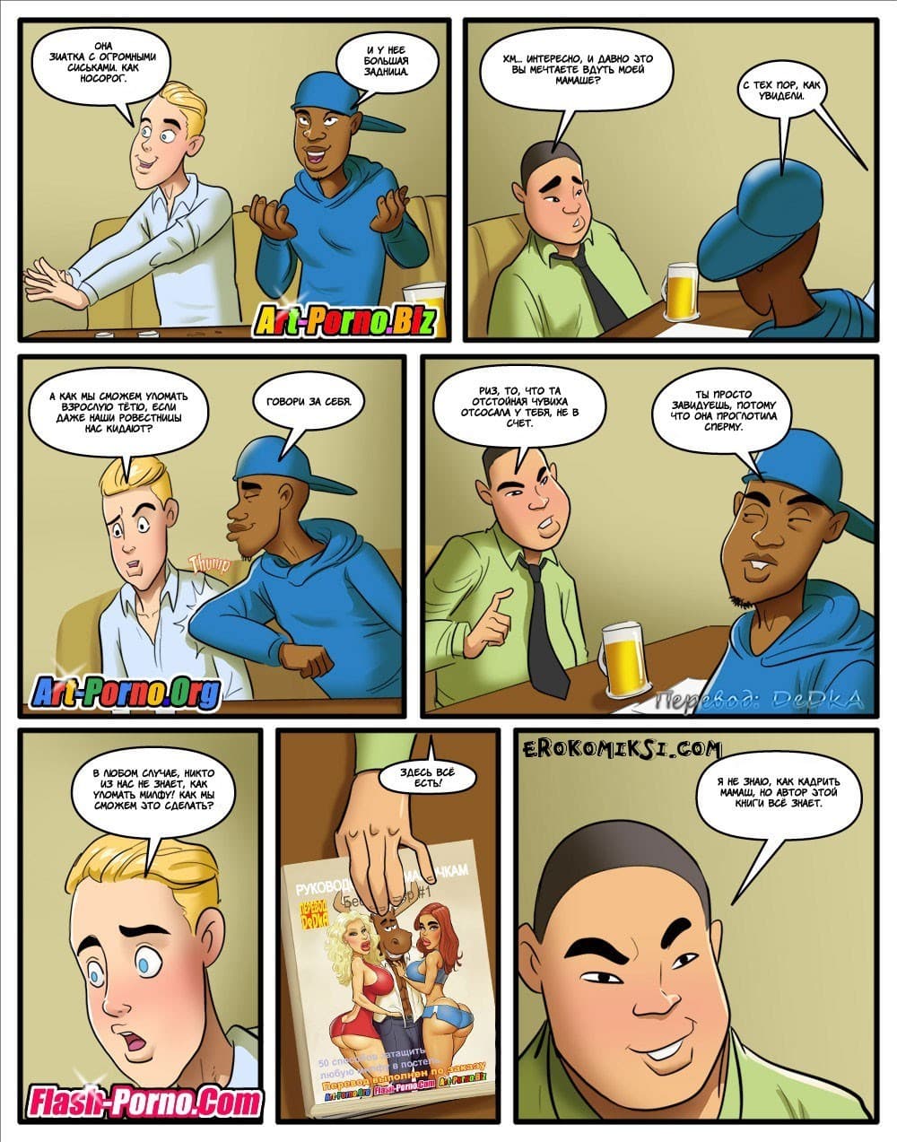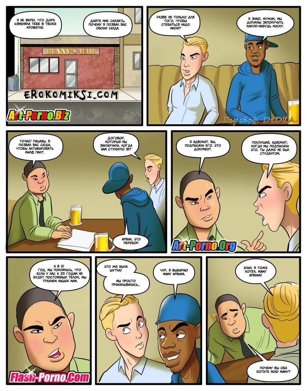 Представляем вашему вниманию откровенные комиксы милф (милфа это зрелая женщина, мама, не обязательно своя, с которой очень хочется заняться сексом).Так вот, три товарища — лузера поняли, что с девушками у них дела «не клеятся». Поэтому они договорились, что если к 25 годам у них не будет отсутствовать постоянные подружки, то они постараются наладить серьезные сексуальные отношения с мамашами друг друга. И вот придуркам уже по 25 лет, а девушек у них до сих пор нет, и они вспомнили свой договор. После этого парни договорились, кто к чьей мамочке пойдёт и отправились соблазнять взрослых дам…