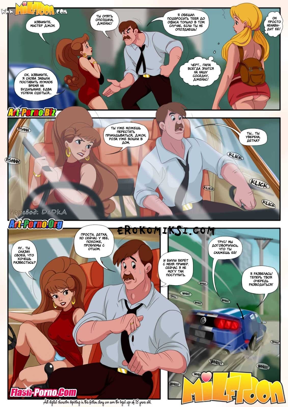 Порно комикс Милфтуны 3 часть расскажет, как глава семейства в предыдущих эпизодах жадно облизывался, смотря на горничную, но всё вышло так, что переспал он не с горничной, а с дочерью. А в данной части выясняется, что Джон ещё и с соседкой замутил роман! Да, причем такой роман, что женщина даже развелась и того поступка требует и от него! Но Джон Милфтун — это человек высоких и нравственных принципов! Заниматься сексом с кем попало, это одно, но доводить дело до развода, да еще и разрушать семью, это же верх аморального поведения! Не бывать этому!!!
