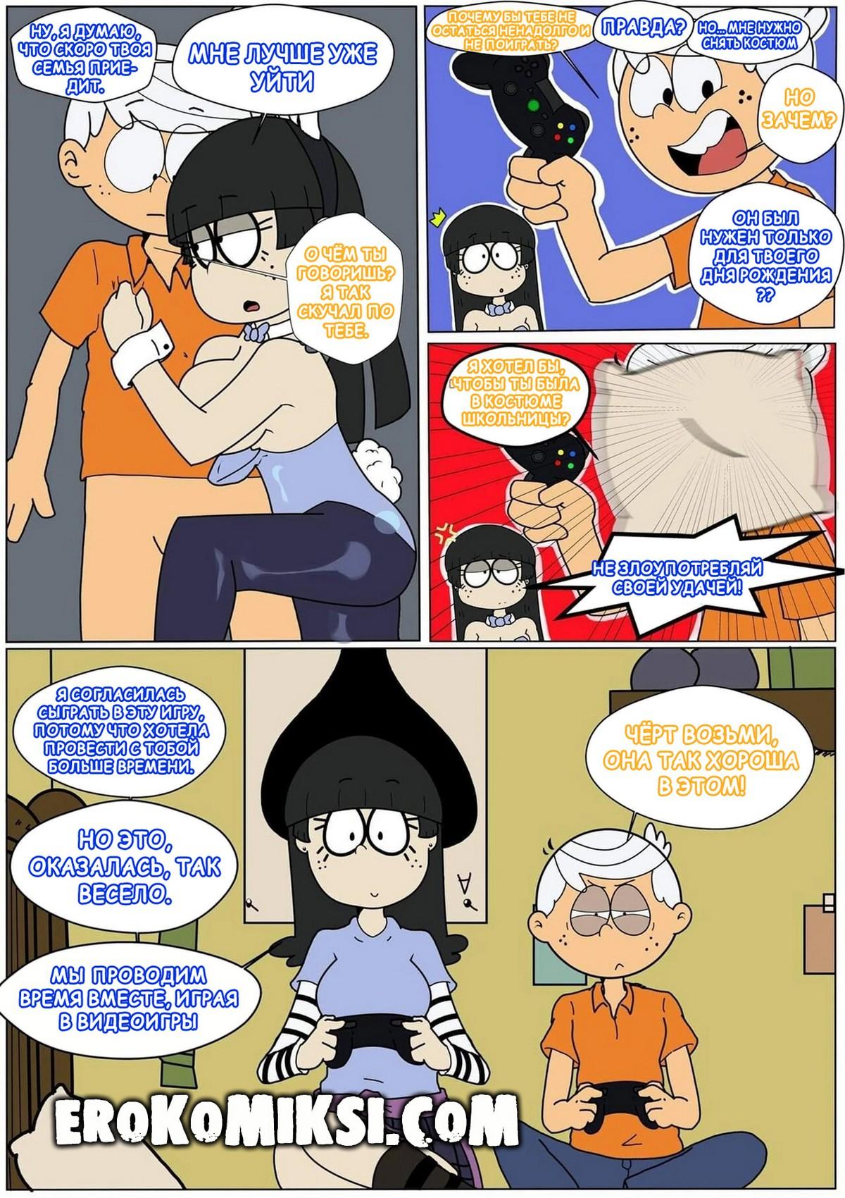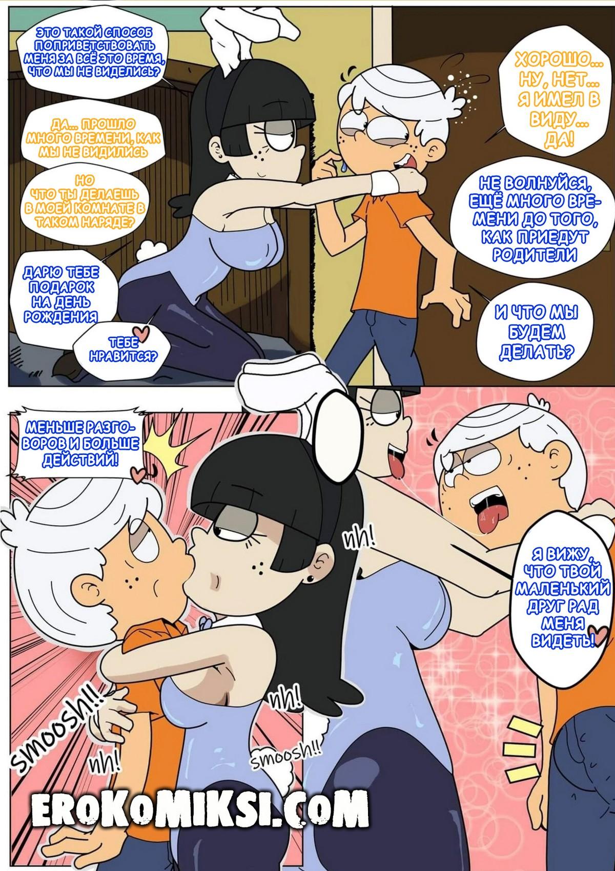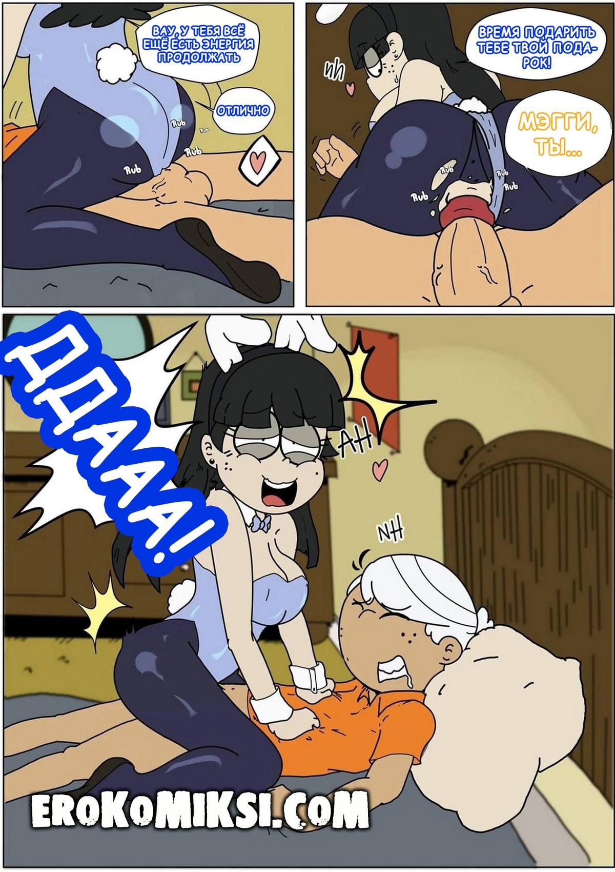 Порно комикс Мой Шумный Дом. Кролик. Линкольн был очень расстроен тем, что Мэгги не пришла на его день рождения. Найдя записку, в которой написано, что его подарок у него в комнате. Мэгги решила подарить Линкольну своё горячие тело в костюме кролика…