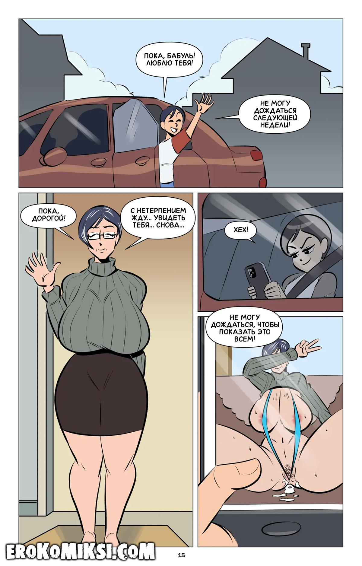 Порно комикс Моя бабушка – порнозвезда. Парнишка остался на несколько дней у бабушки, и случайно нашёл журнал с откровенными фото своей бабули. Теперь, чтобы мама не узнала о бурной молодости бабушки, бабуля исполняет все пошлые фантазии своего внучка, и даёт оттрахать её огромную задницу…