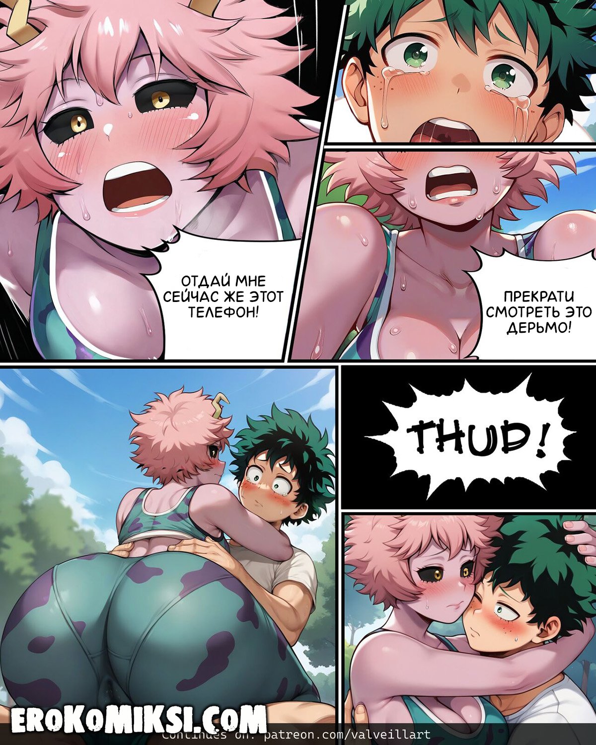 Порно комикс Моя геройская академия. Как я стал рогоносцем. У парня по имени Мидориа большое горе. К нему в руки попала видеозапись, на которой его девушка Урарака трахается с толпой мужиков. К счастью для Мидории, рядом оказывается лучшая подруга Урараки, которой становится жалко паренька и она предлагает ему, отомстить Урараке той же монетой…