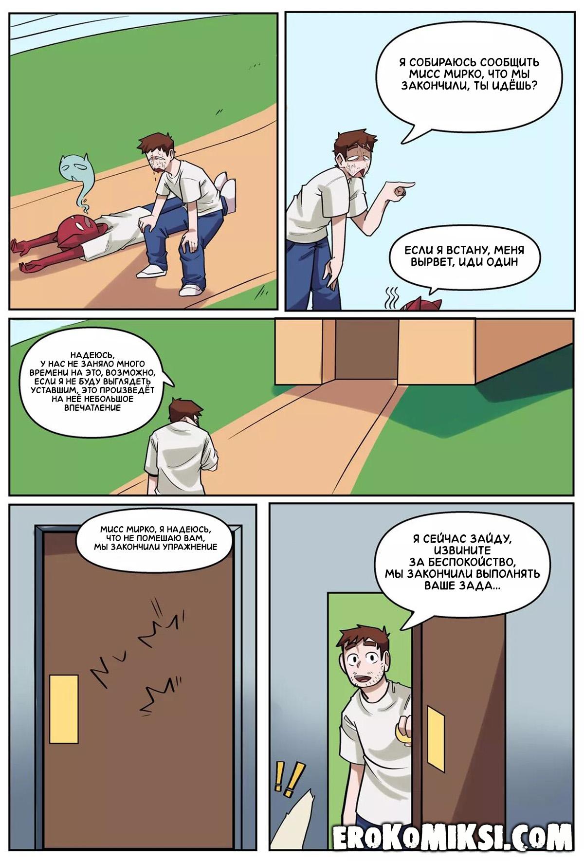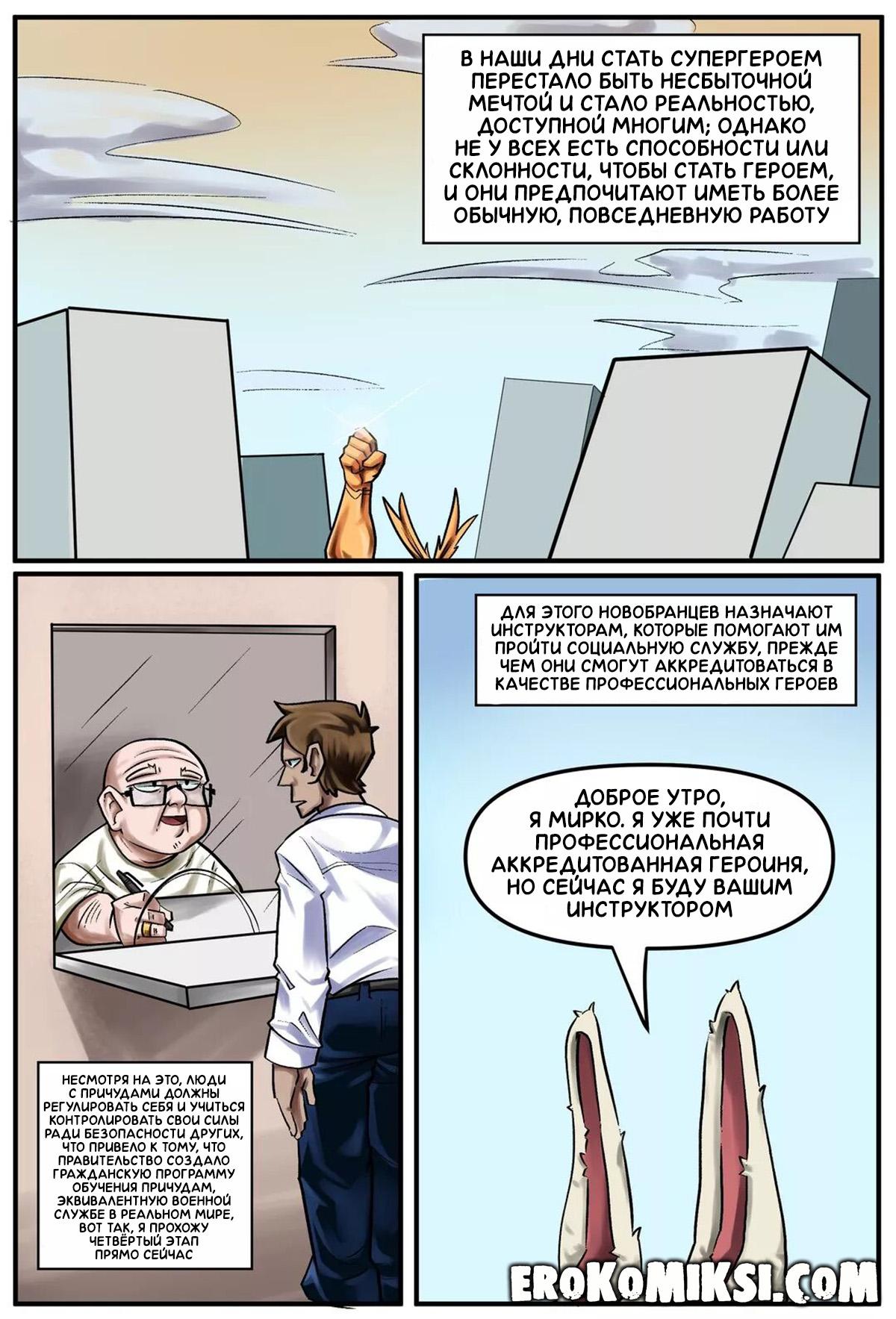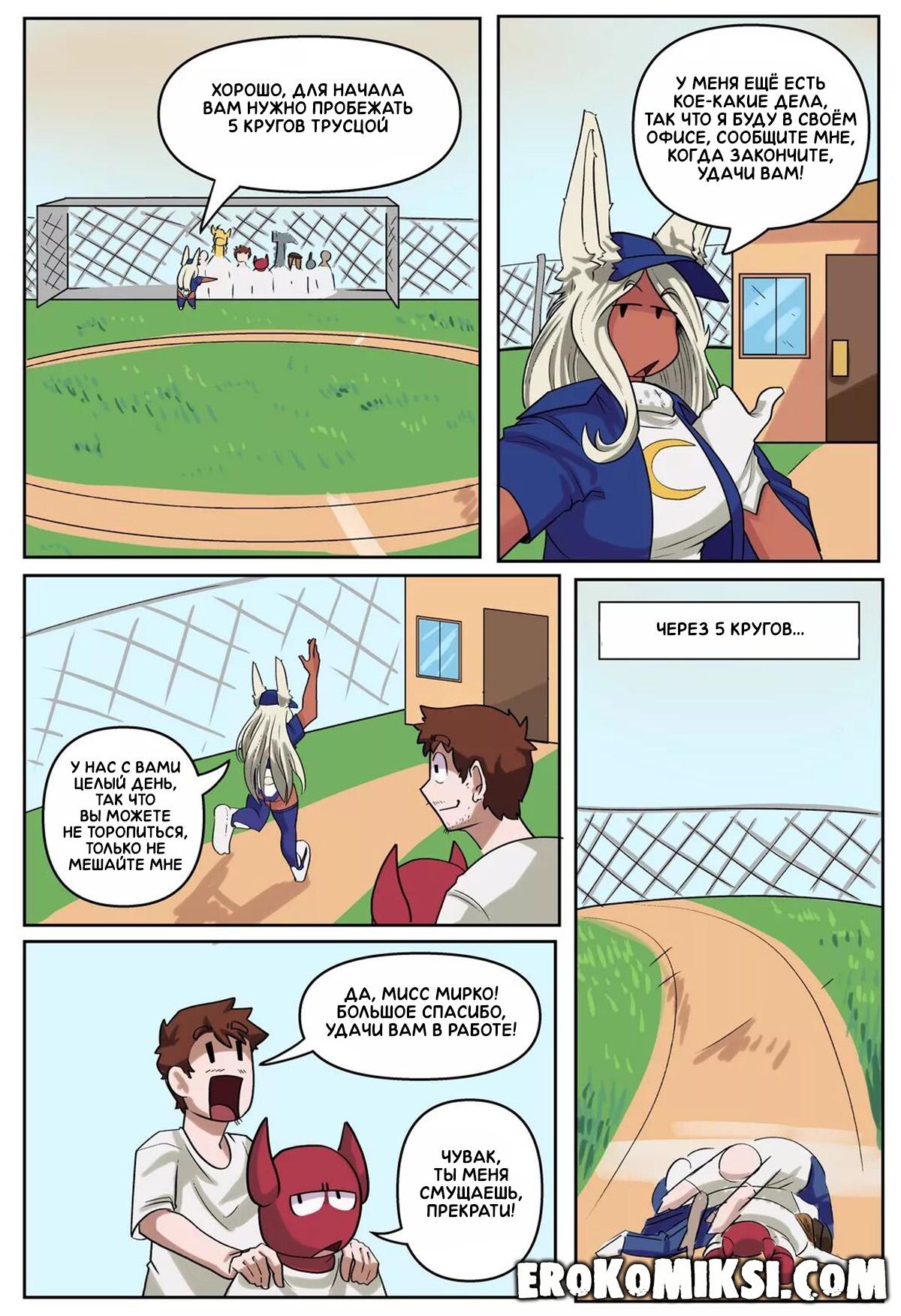 Порно комикс Моя Геройская Академия. Общественные работы. Для того, чтобы полностью пройти аккредитацию и стать полноценным героем, Мирко назначают инструктором новобранцев. Она даёт им задание, а сама отправляется в свой кабинет, и чтобы не скучать, решает помастурбировать. Выполнив задание, один из новобранцев идёт к Мирко, чтобы сообщить ей об этом и застаёт обнажённую Мирко, ублажающую свою киску…