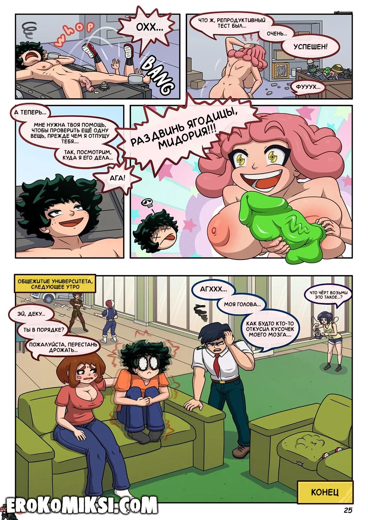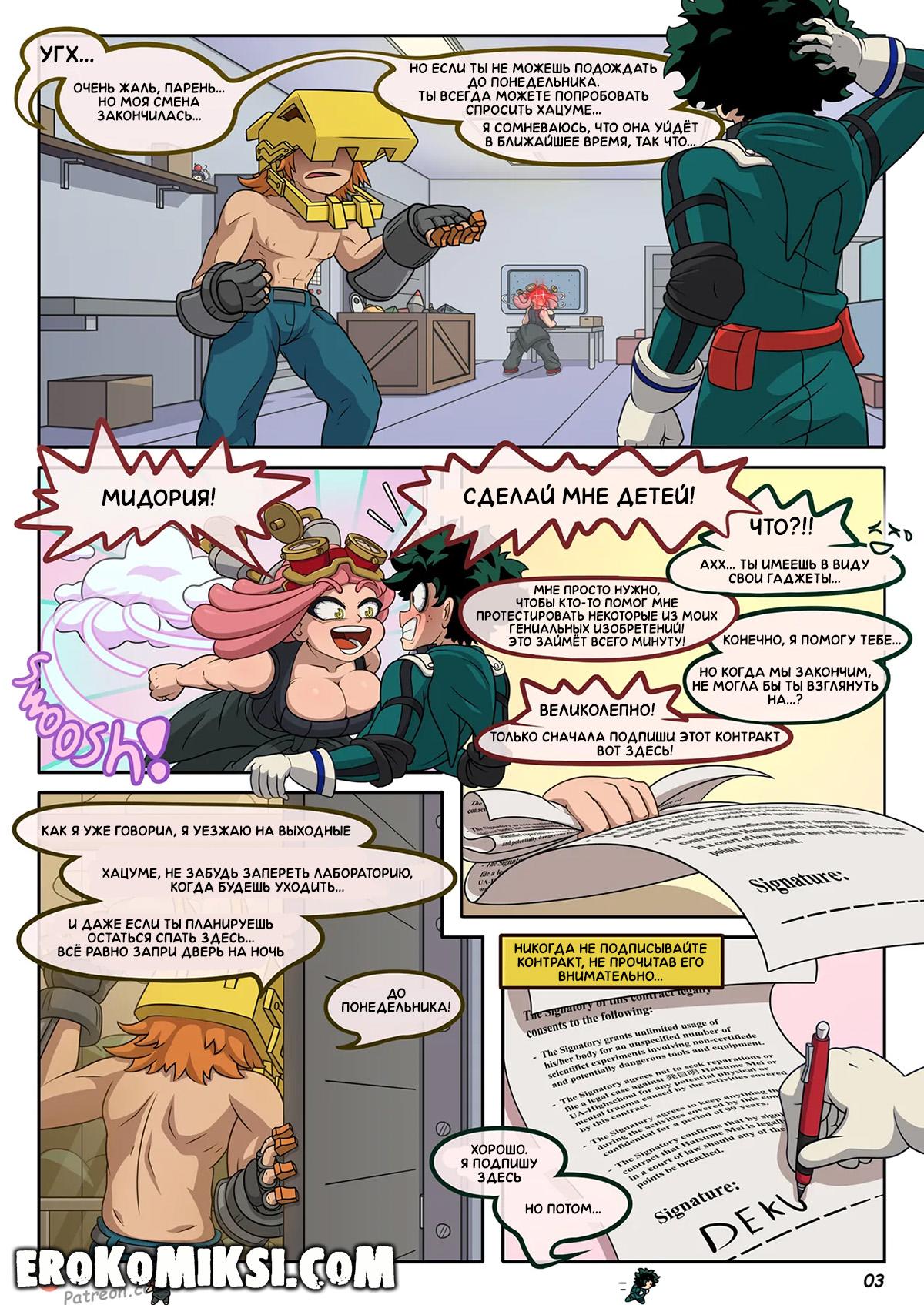 Порно комикс Моя геройская Академия. Сделай мне ребёнка. Хацуме тестировала в своей лаборатории изобретения, когда к ней пришёл Деку, чтобы починить свой костюм. не долго думая, Хацуме решила провести тесты на Деку и парень согласился, ещё не зная, чем для него это закончится… Хацуме осушила яйца парня так, что после этого он не мог ходить…