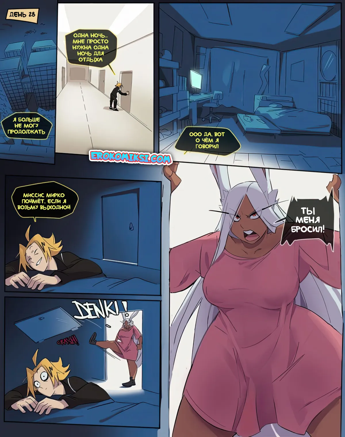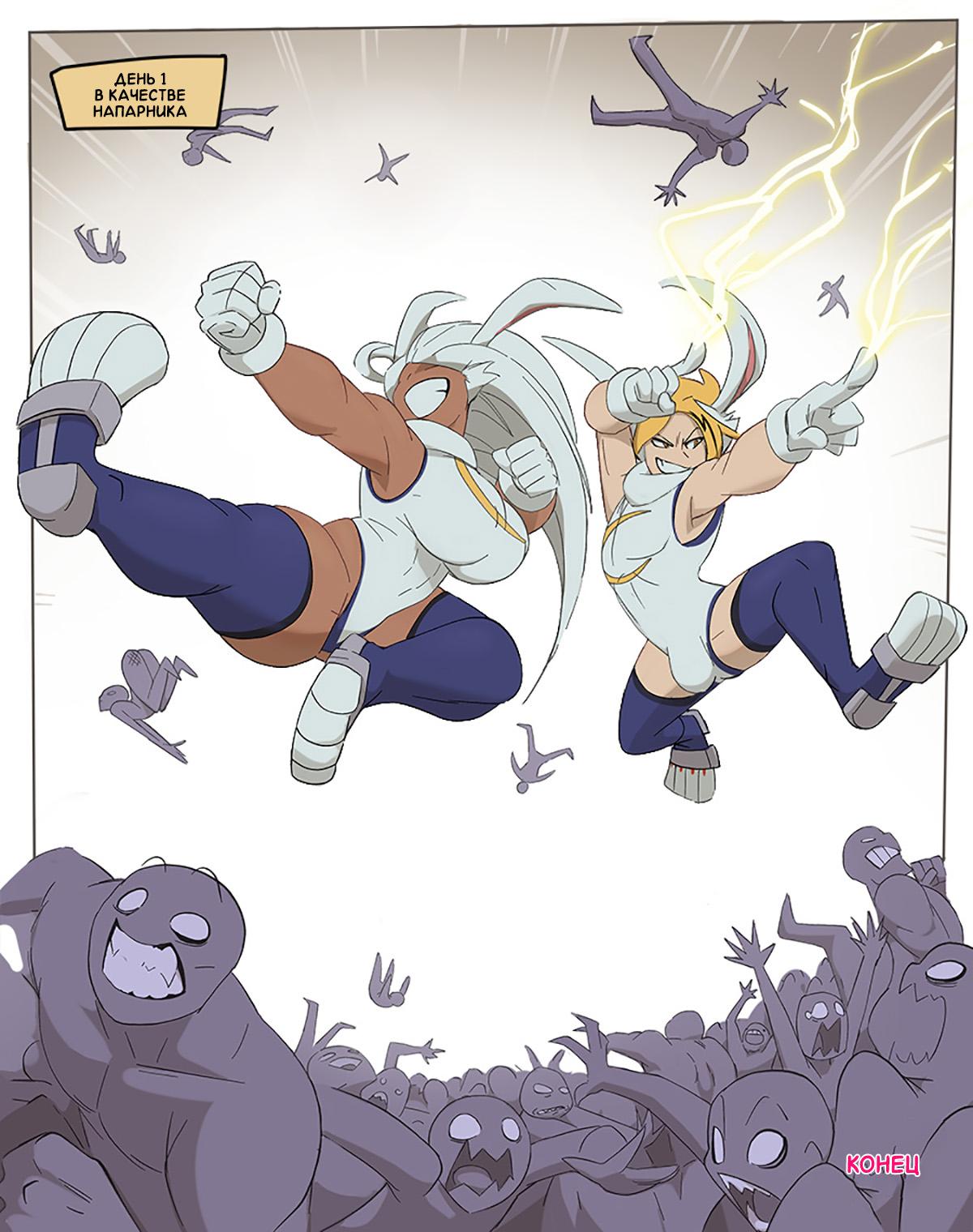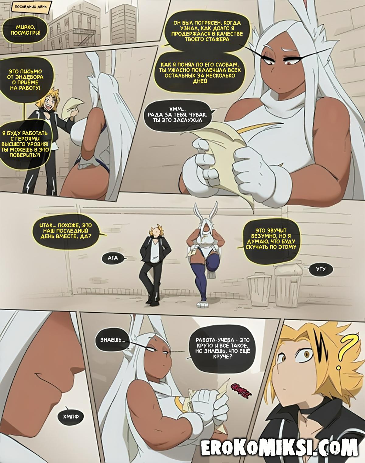 Порно комикс Моя геройская академия. Стажировка. Мирко взяла себе в интернатуру Каминари. Парень долго не мог найти работу и уже почти отчаялся, что когда-то ему предстоит пройти стажировку. Однако Мисс Мирко взяла его на работу и после боя решила показать, что ему предстоит делать каждый день после изнурительных сражений с плохишами. В общем ей нужен секс…