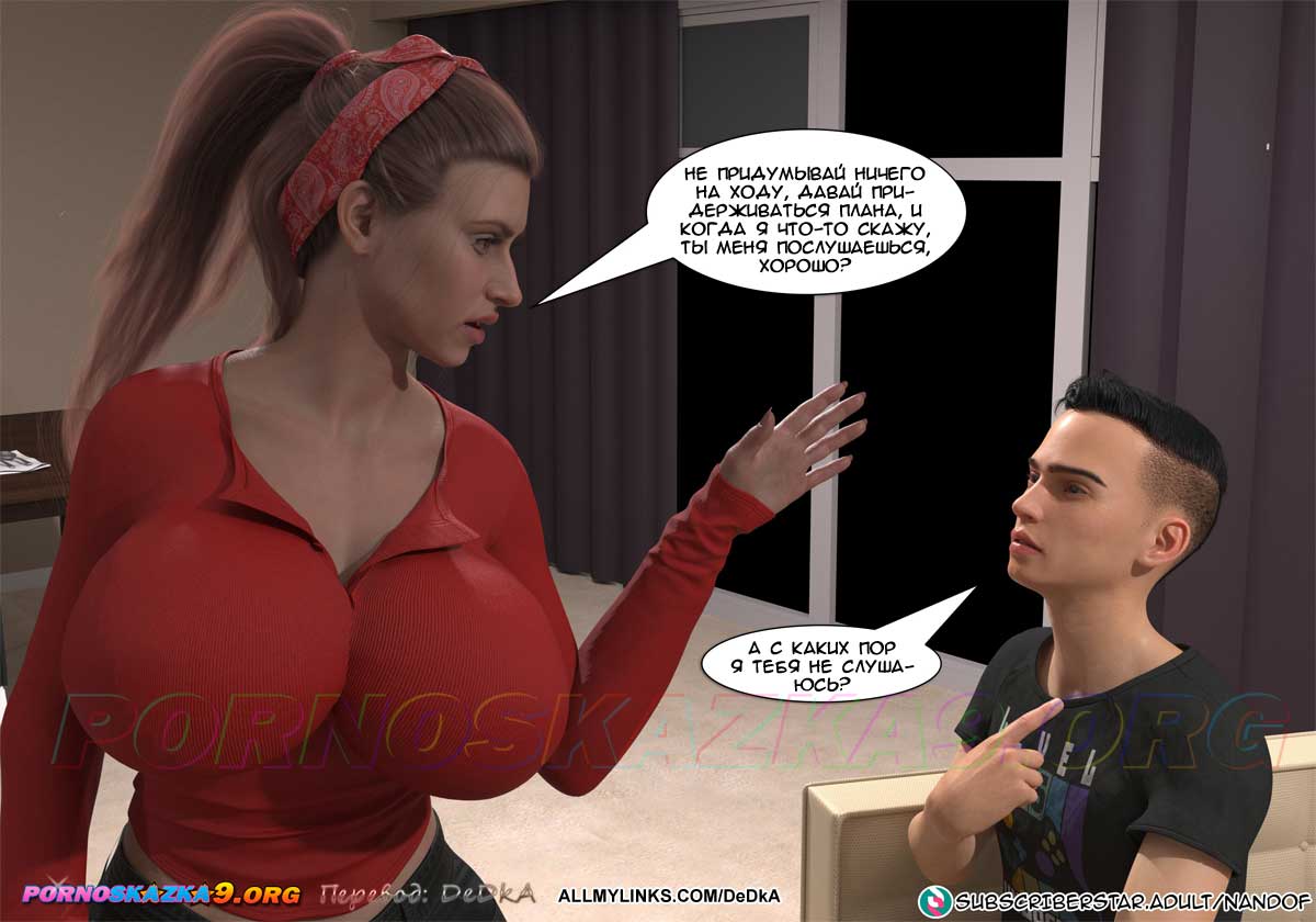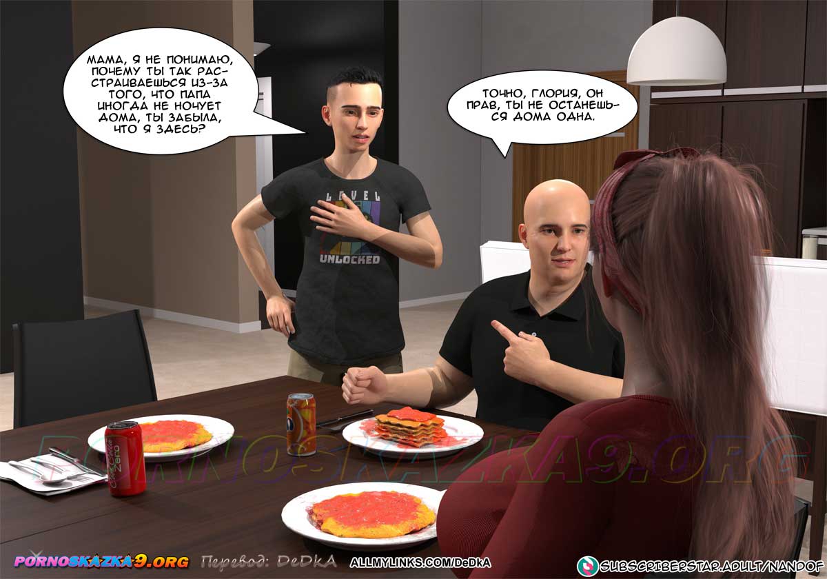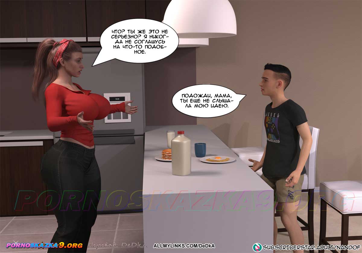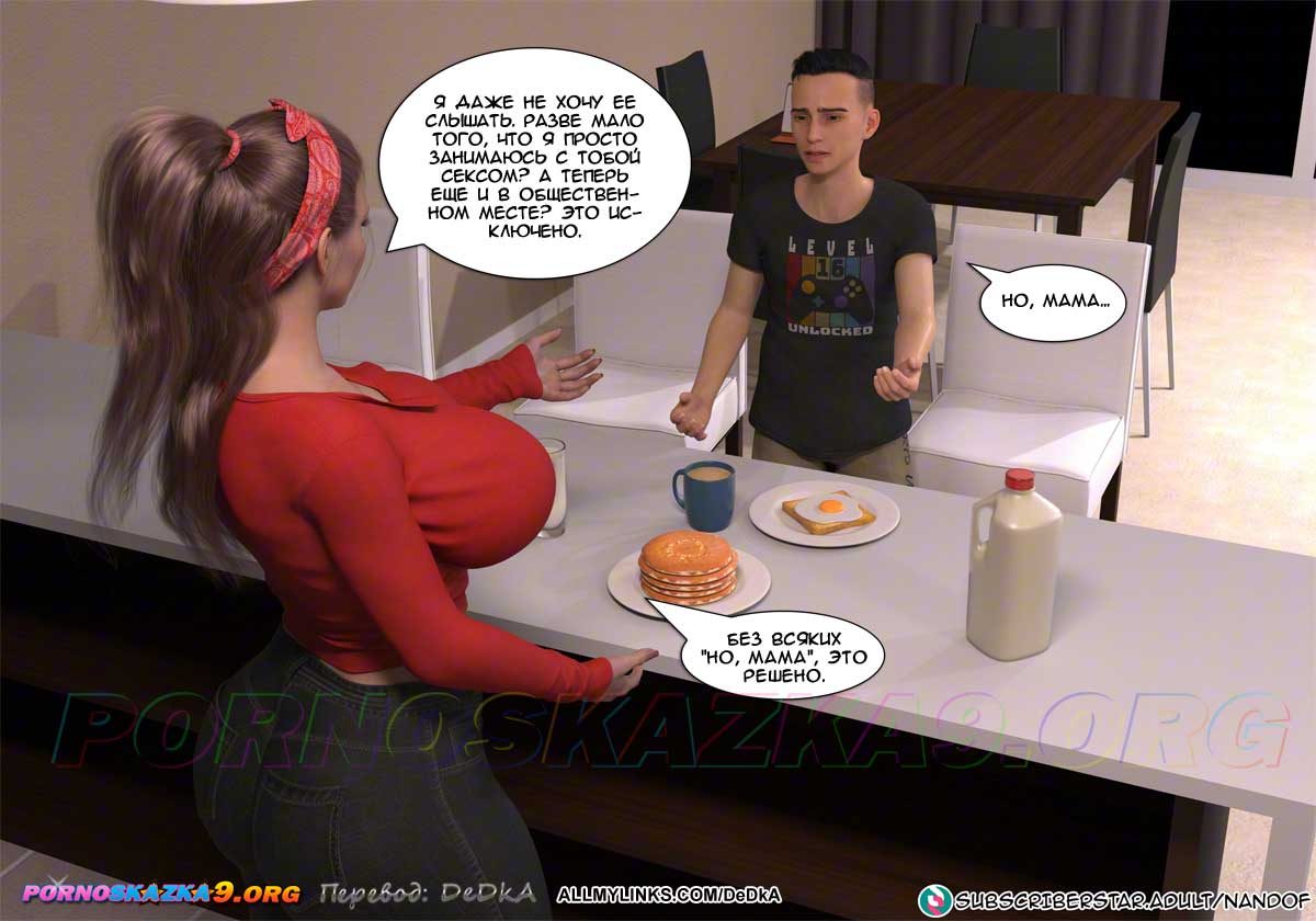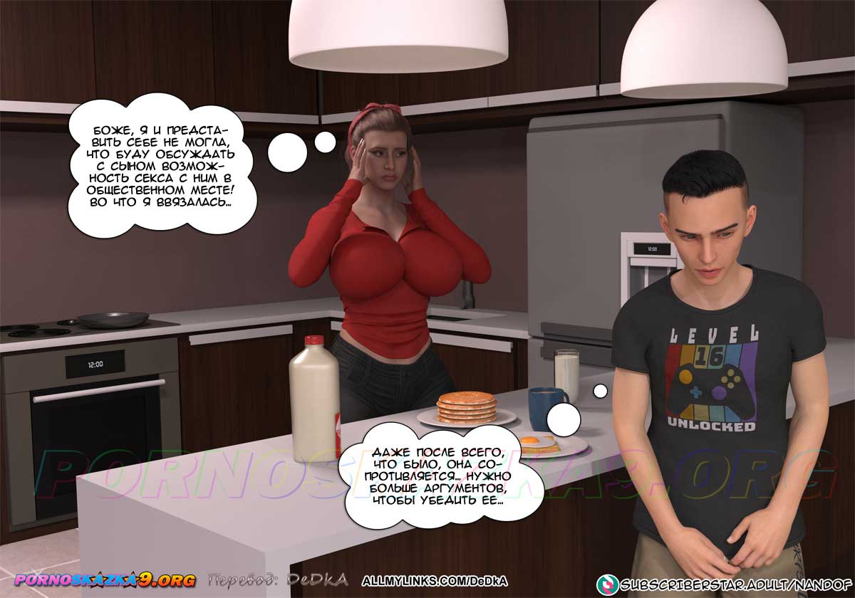 Порно комикс Моя мама порнозвезда. Часть 9. Лукас сообщил Глории, что подписчики хотят видеть сцены секса в общественном месте, но Глория, даже не дав Лукасу продолжить разговор, сразу и наотрез отказалась делать что-то подобное. Расстроенный Лукас отправился в свою комнату. Вскоре Глория почувствовала сожаление, что огорчила Лукаса тем, что не выслушала его до конца, и отправилась к нему в комнату, чтобы продолжить разговор…