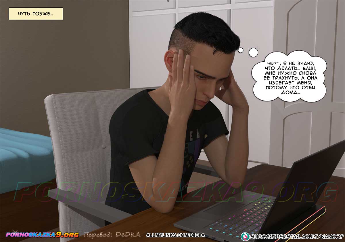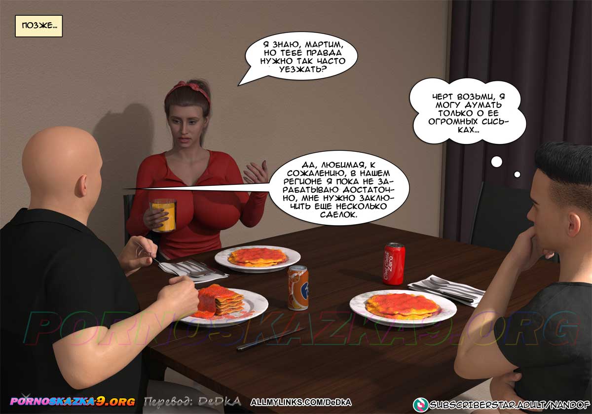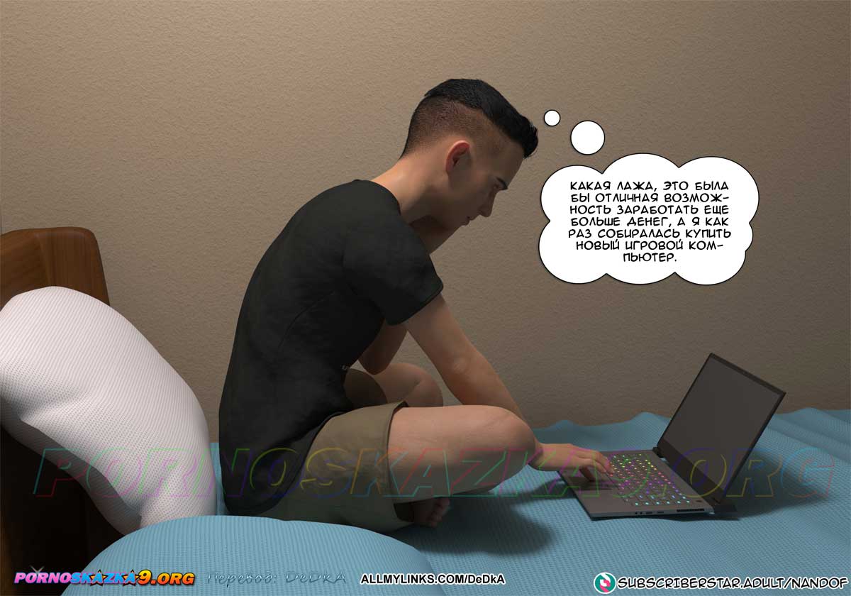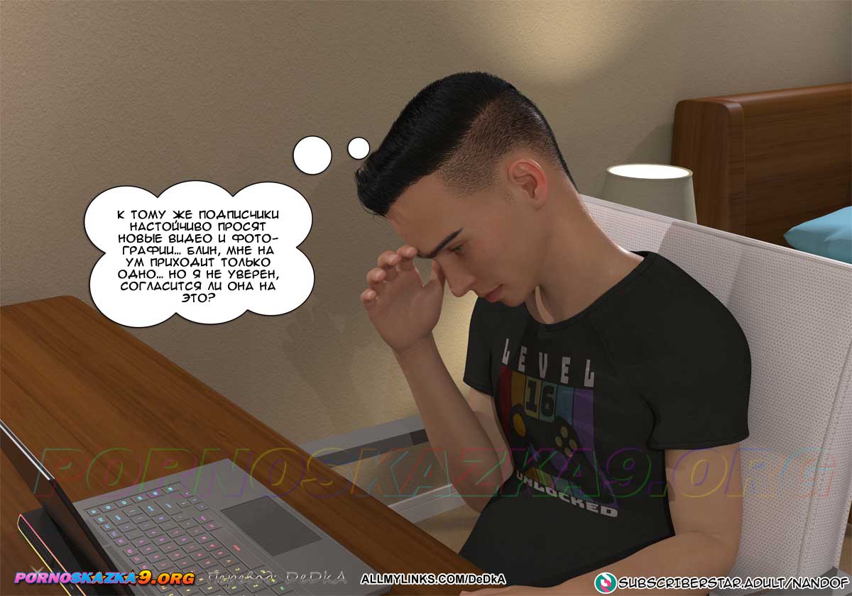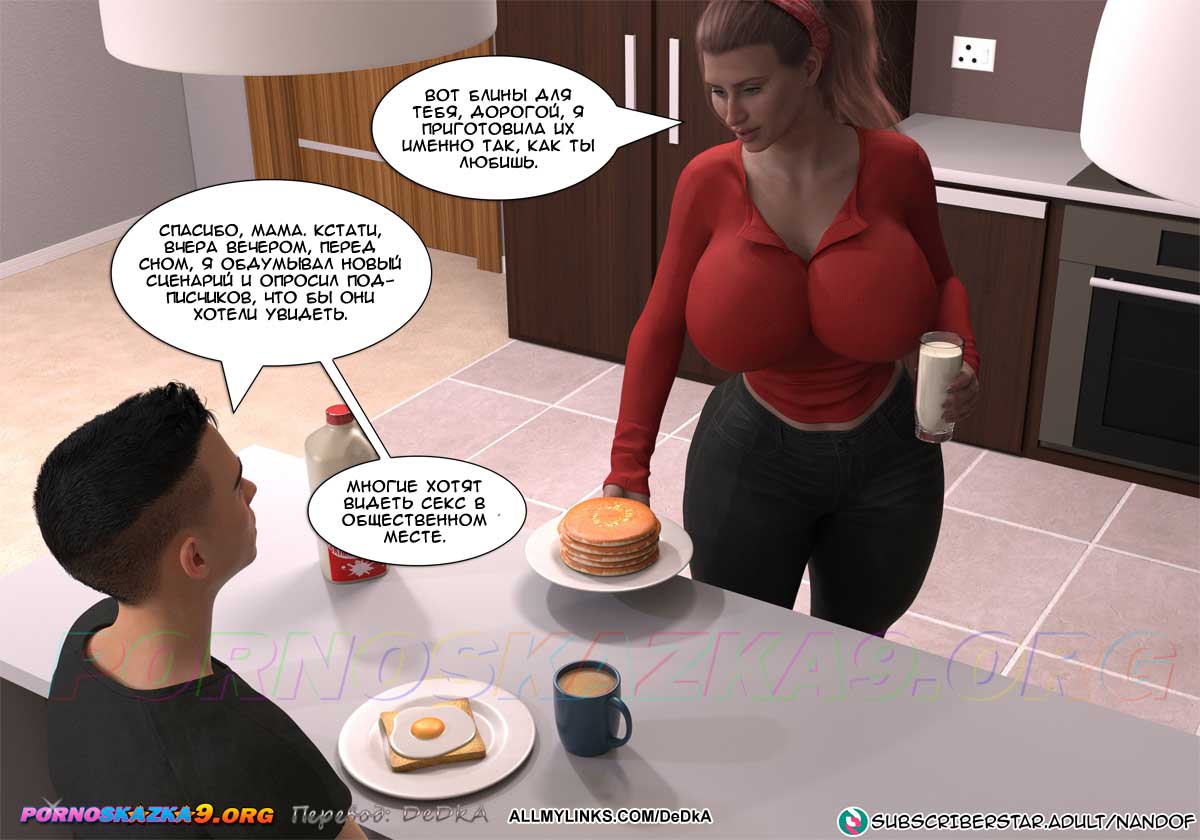 Порно комикс Моя мама порнозвезда. Часть 9. Лукас сообщил Глории, что подписчики хотят видеть сцены секса в общественном месте, но Глория, даже не дав Лукасу продолжить разговор, сразу и наотрез отказалась делать что-то подобное. Расстроенный Лукас отправился в свою комнату. Вскоре Глория почувствовала сожаление, что огорчила Лукаса тем, что не выслушала его до конца, и отправилась к нему в комнату, чтобы продолжить разговор…