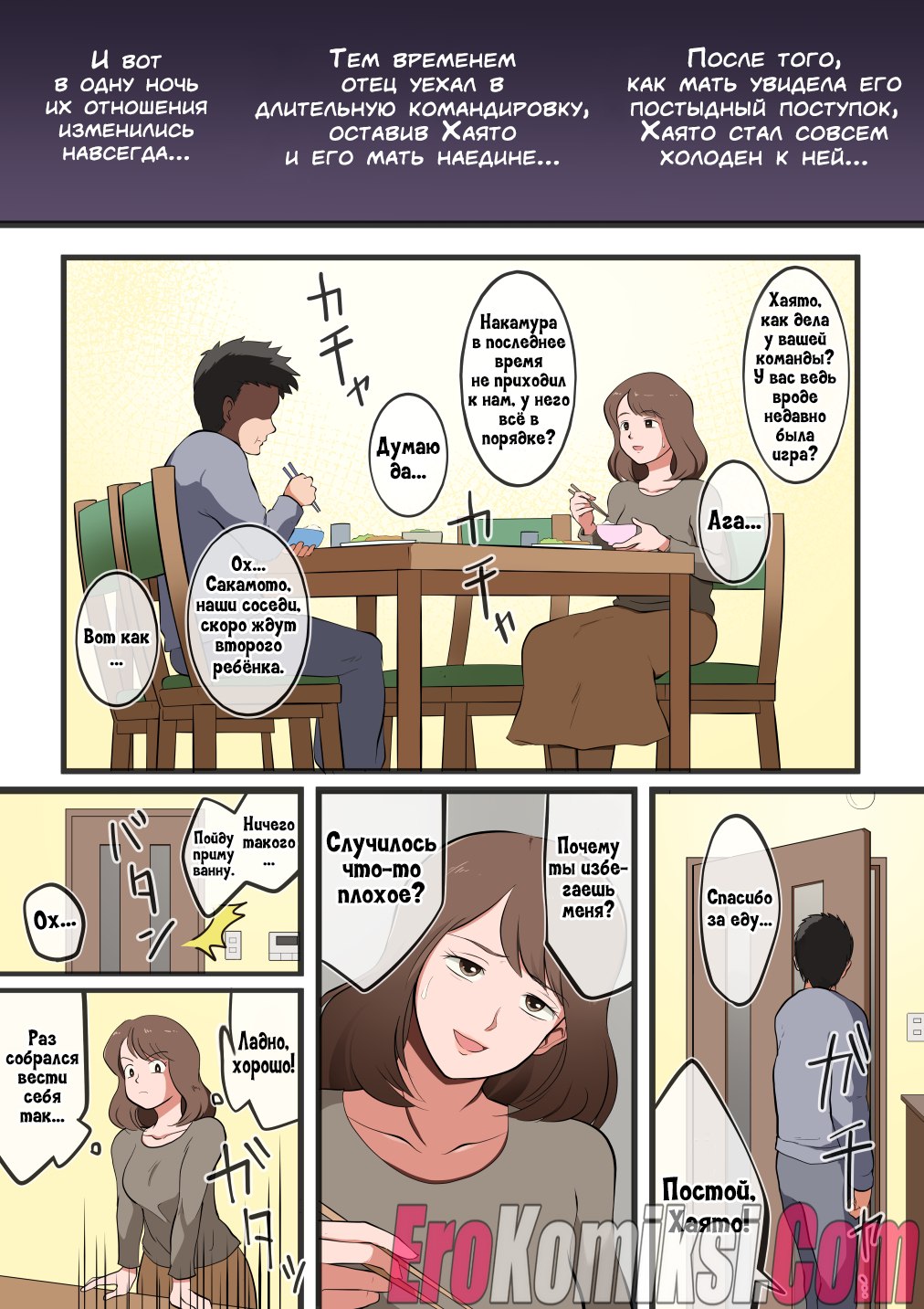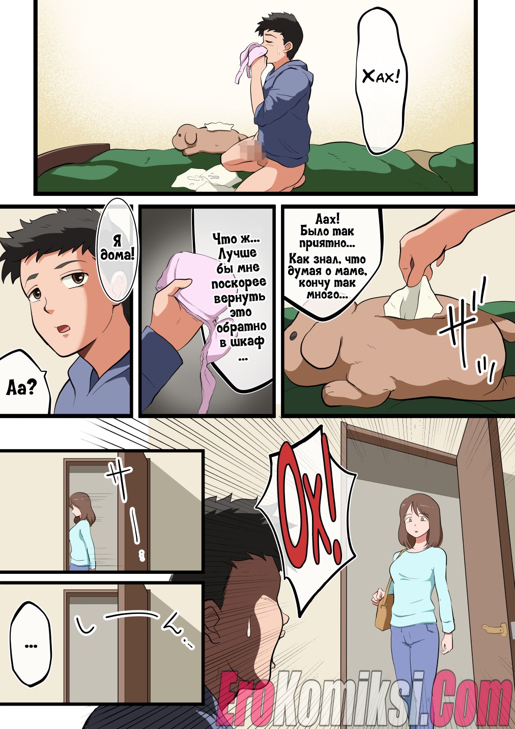 Порно комикс Моя мама слишком сексуальна. Хаято уже давно дрочит на бельё своей матери, мечтая о сексе с ней… Но вот однажды он так увлёкся этим делом, что забыл запереть дверь, а мама вернулась домой раньше чем обычно.