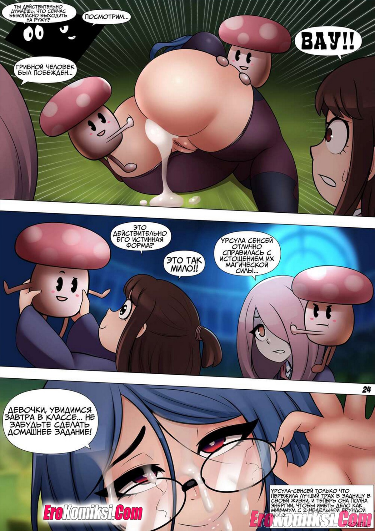 Порно комикс Моя учительница Урсула. My Teacher Ursula. Little Witch Academia Горячая сисястая брюнетка училка стала дрочить свою пизду на глазах учеников. Сучка была слишком возбуждена, поэтому стала отсасывать большие хуи парней, а затем дала им себя хорошенько выебать.