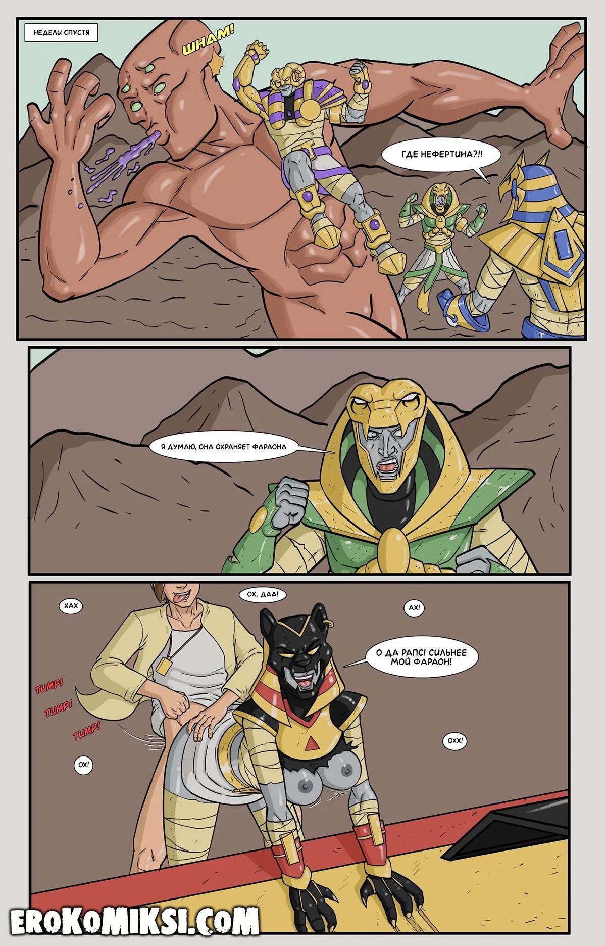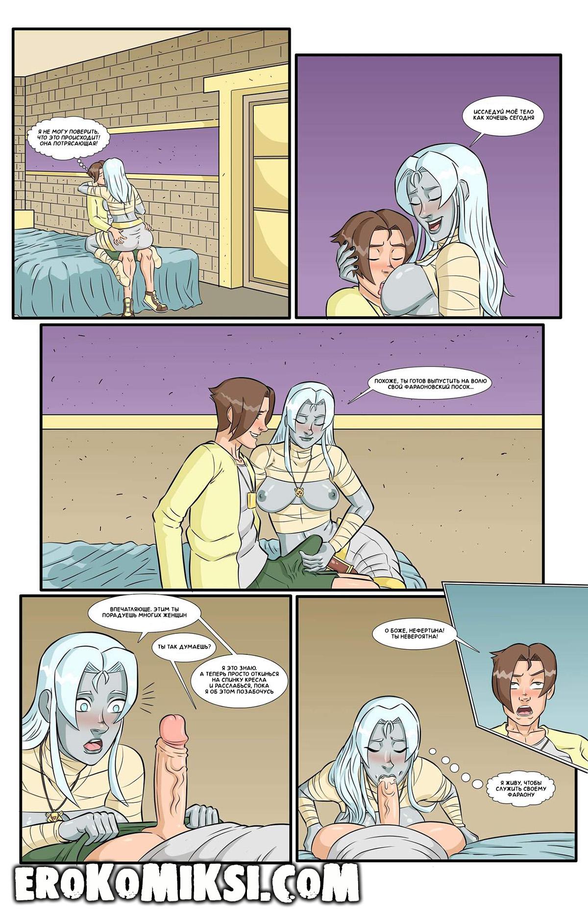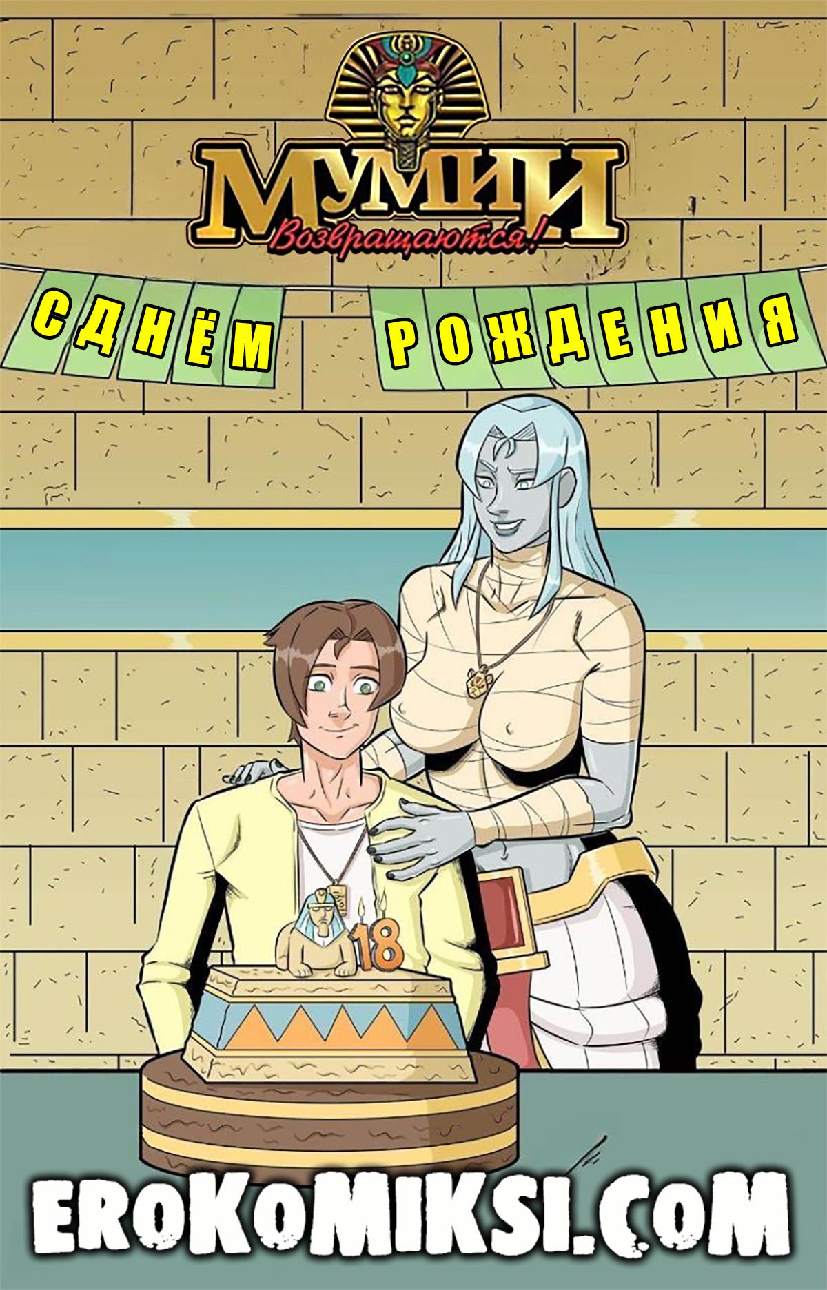 Порно комикс Мумии возвращаются. С днём рождения. Пресли исполняется 18 лет и Нефертина решает обманным путём сделать ему особенный подарок, зная, что парень постоянно за ней подглядывает и обожает её большие сиськи. Она сообщает Пресли, что друзья подготовили ему подарок – Нефертина должна будет лишить парнишку девственности, чему Пресли безумно обрадовался…