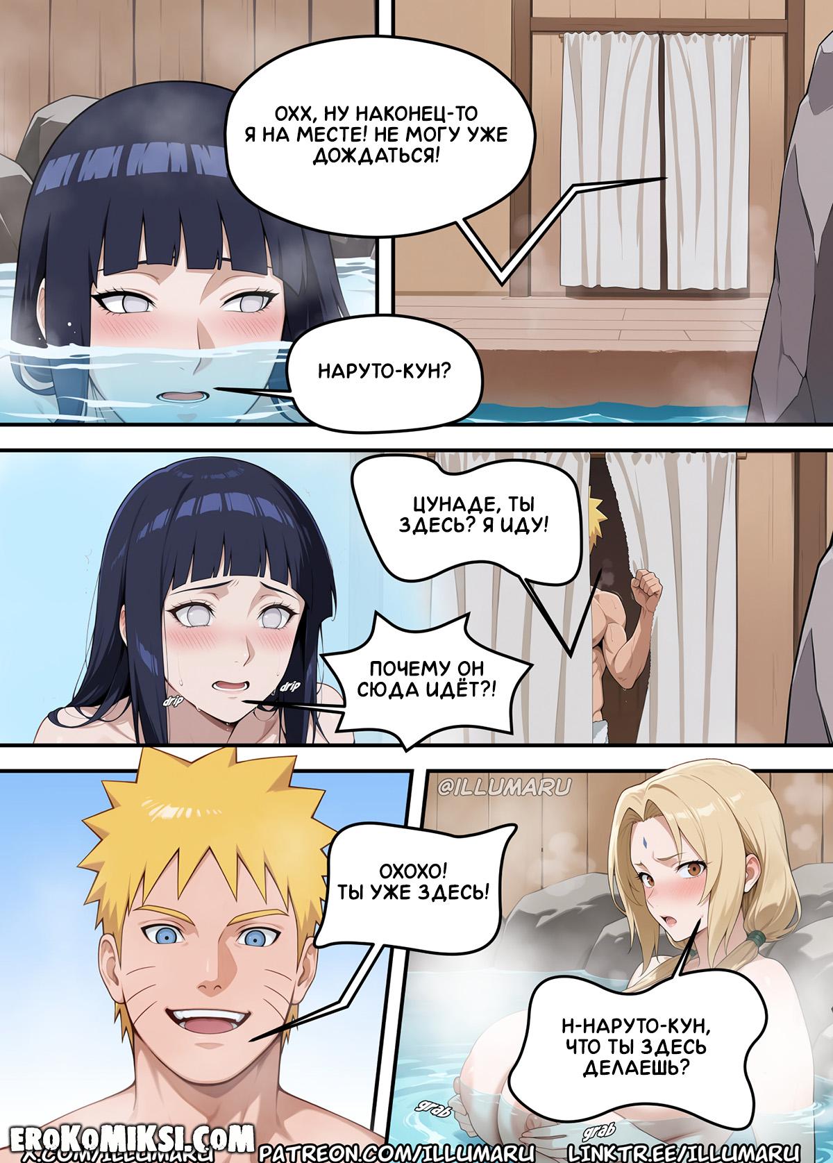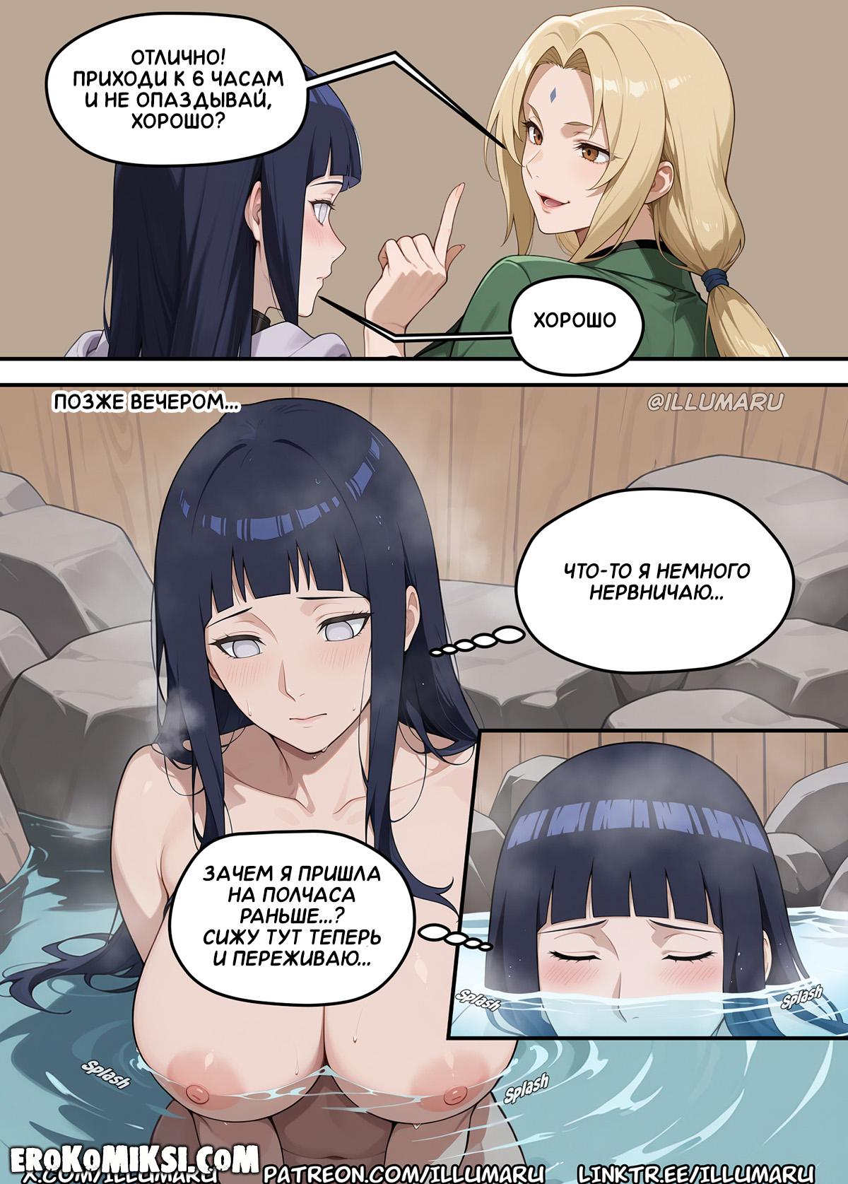 Порно комикс Наруто. Горячие источники Конохи. Часть 5. Наруто очень понравилось развлекаться в источниках с Цунаде, и они договорились вновь там встретиться. Увидев подглядывающую за Наруто Хинату, у Цунаде возникла идея отправить на источники девушку и посмотреть, что их этого выйдет…