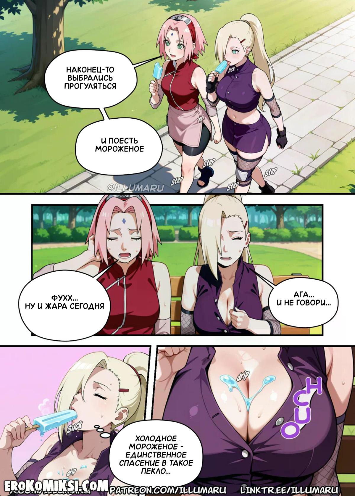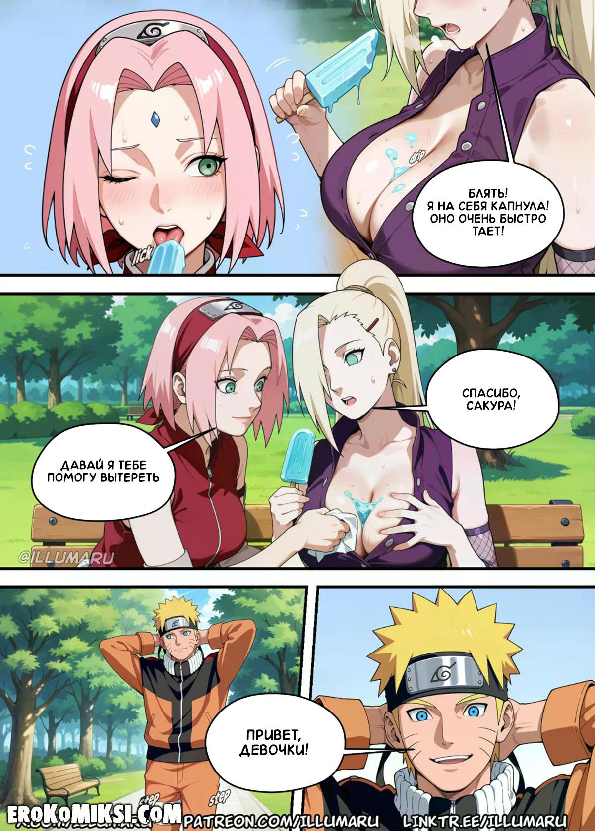 Порно комикс Наруто. Горячие источники Конохи. Часть 7. Ино видела, как Цунаде и Сакура развлекались с Наруто на горячих источниках, и ей тоже захотелось поразвлечься с огромным членом парня, поэтому она трансформировалась в Сакуру и пришла к Наруто, но в этот момент появилась настоящая Сакура…