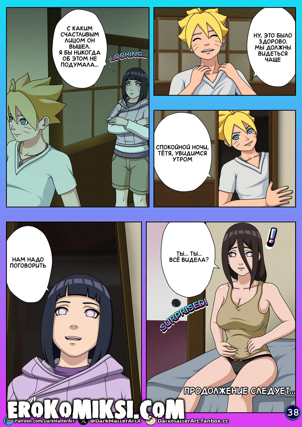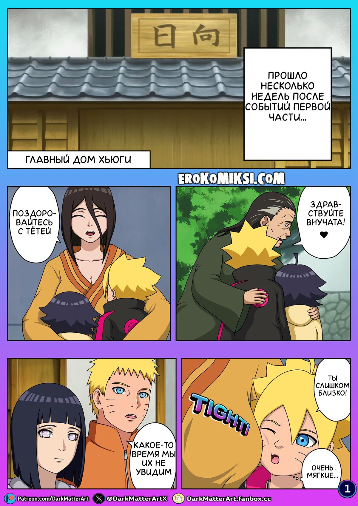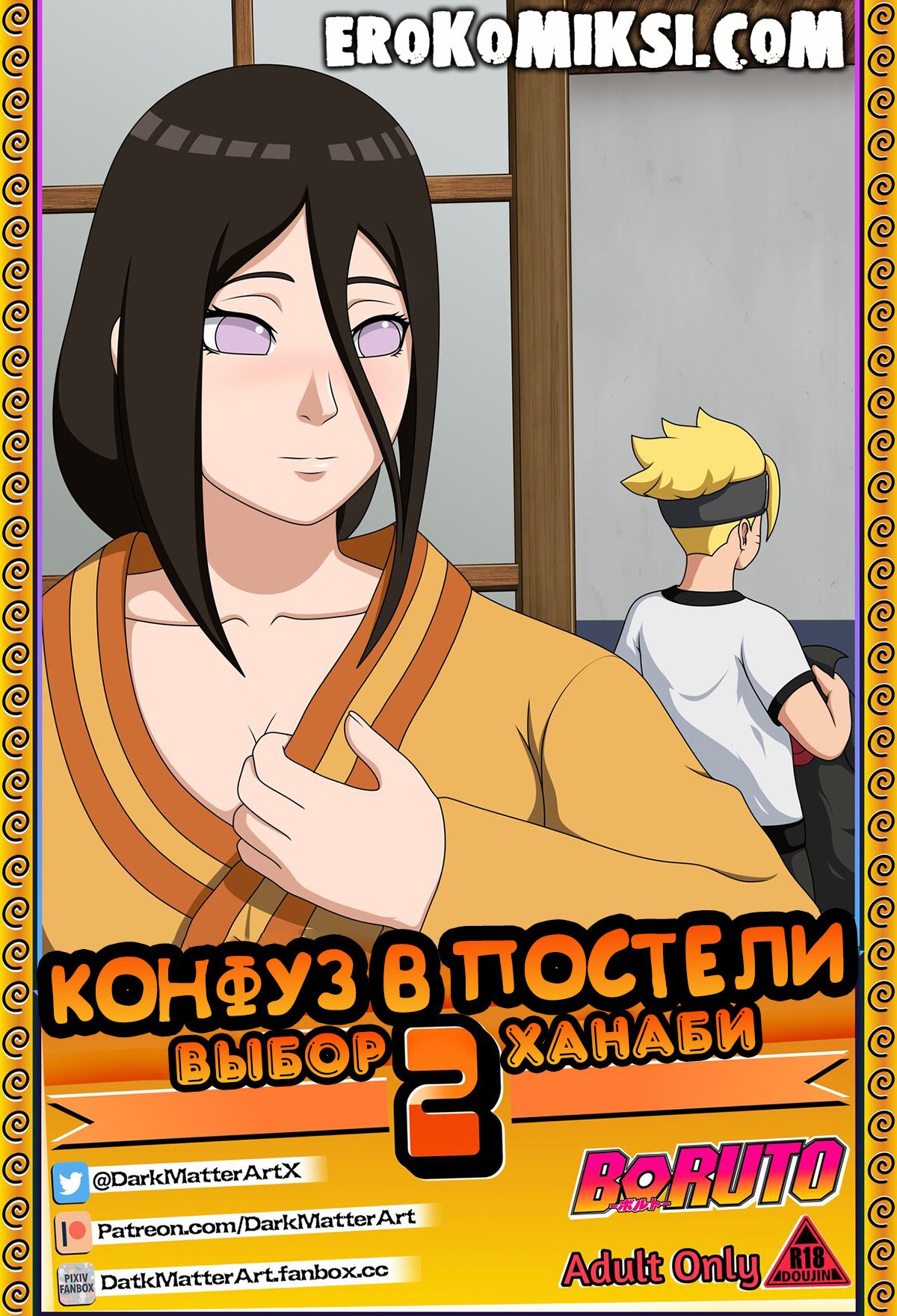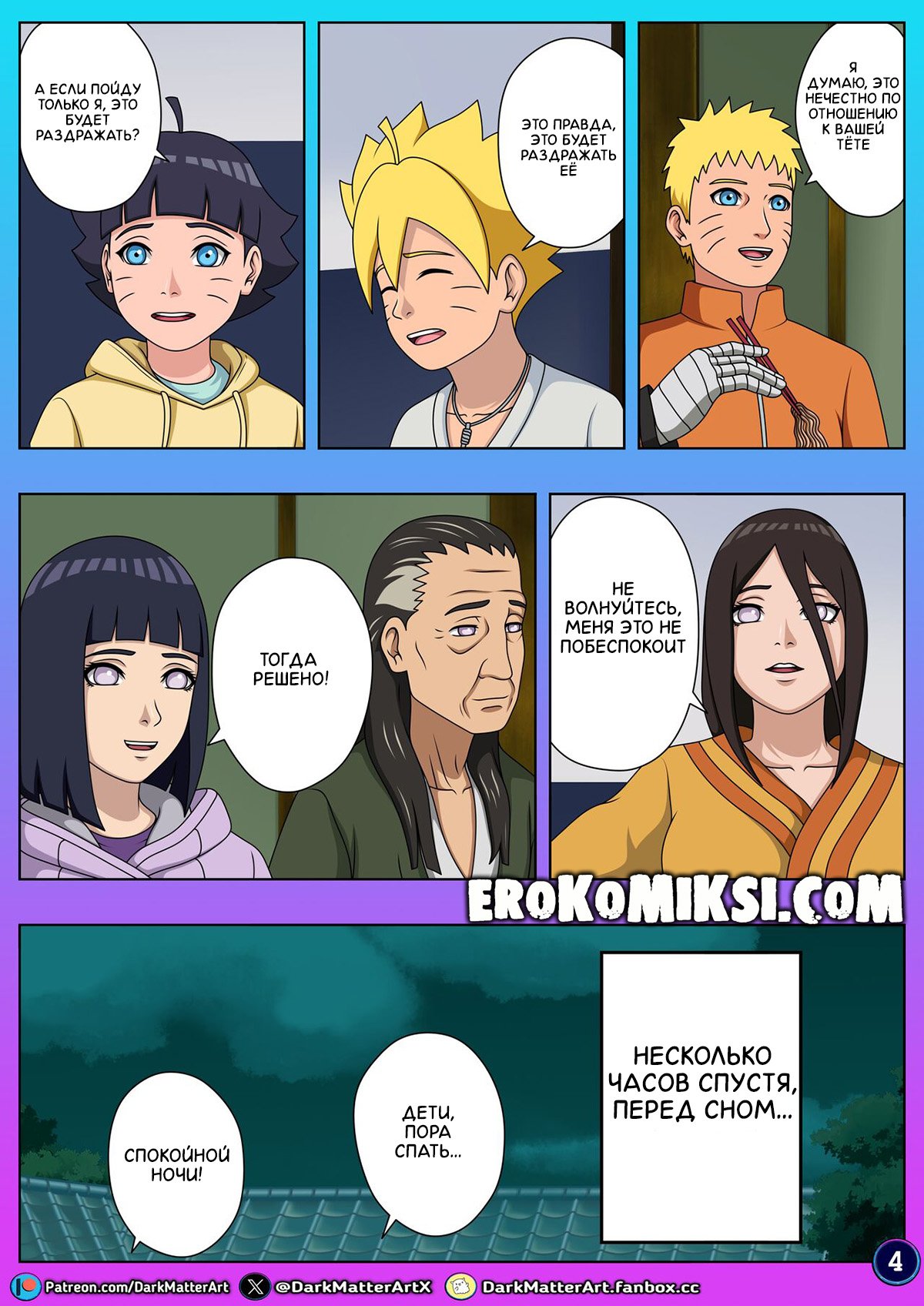 Порно комикс Наруто. Конфуз в Постели. Часть 2. Боруто вместе со своей семьёй приехал в гости к своей бабушке, с которой живет его тётя, сестра его мамы, Ханаби. Волей случая, все разложились спать по разным комнатам, а Боруто комнаты не хватило и ему пришлось лечь в одной кровати с Ханаби. Боруто не сильно этому расстроился, особенно, когда Ханаби начал сниться эротический сон…