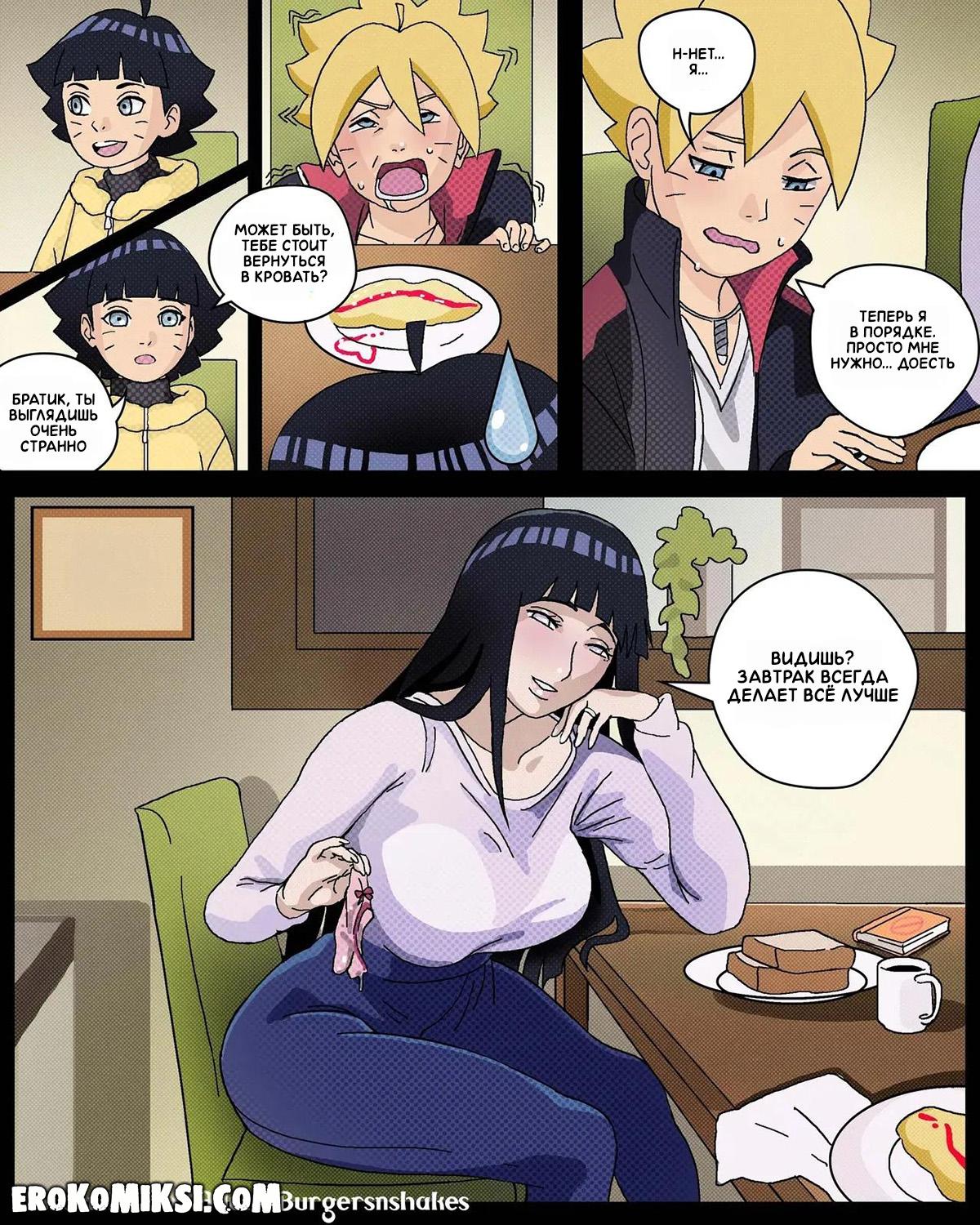Порно комикс Наруто. Зависимость Хинаты возвращается. Часть 4. Проснувшись, Боруто обнаруживает рядом с собой абсолютно голую Хинату, которая ночевала вместе с ним, и у него начинают закрадываться опасения, что отец может что-то заподозрить…