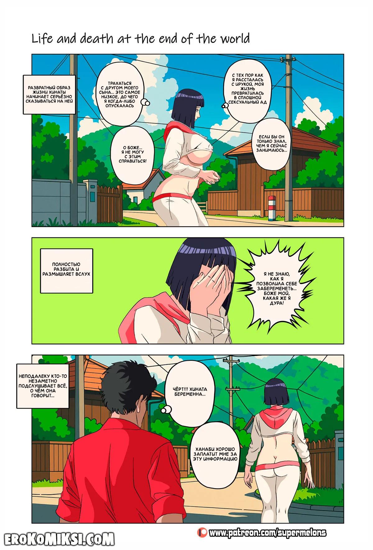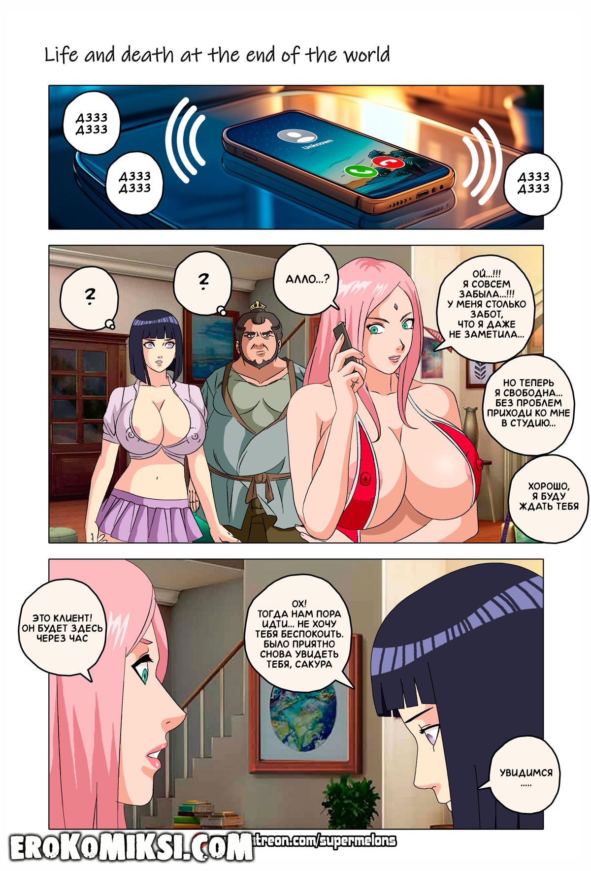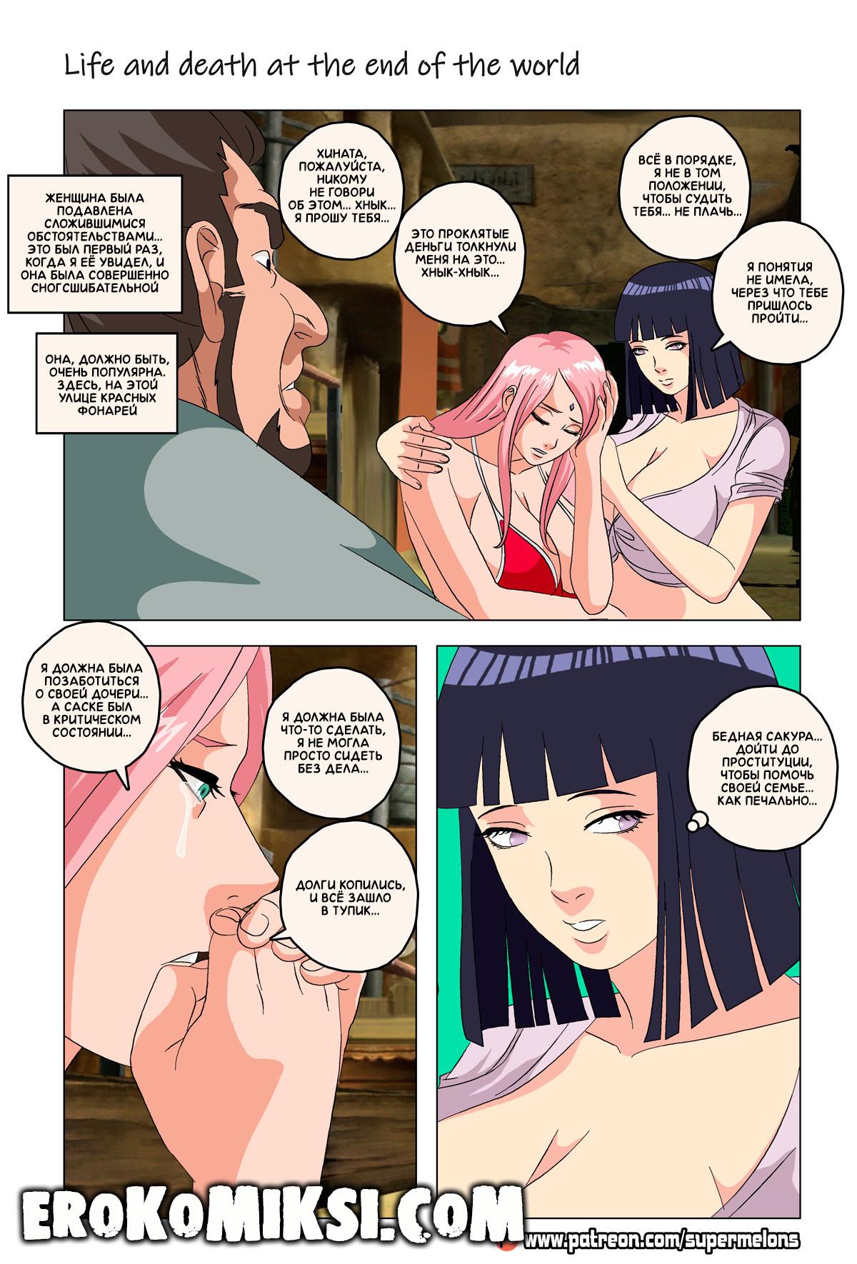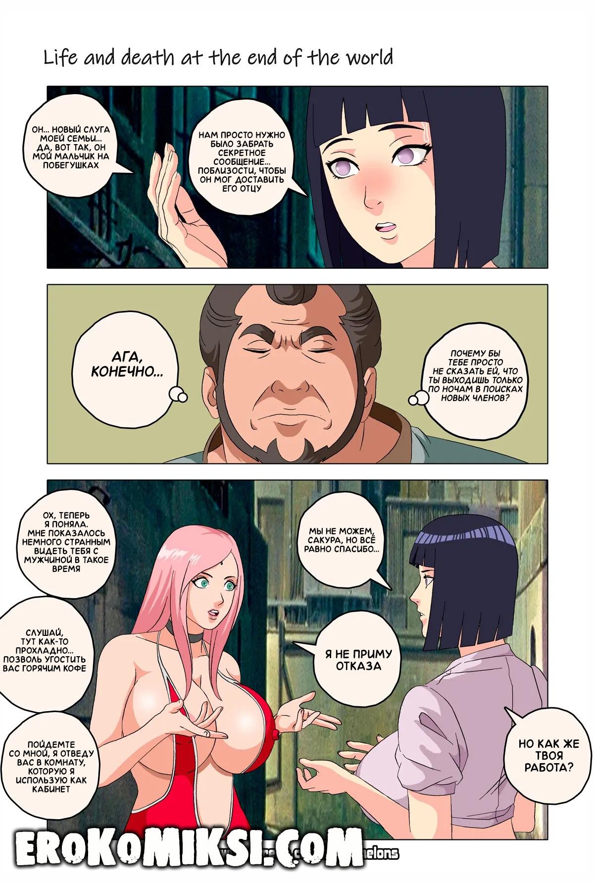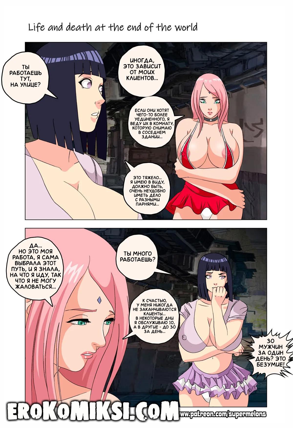 Порно комикс Наруто. Жизнь и смерть на краю света. Став шлюхой, Хината приезжает навестить своих детей и Наруто, однако, ей там совсем не рады и Наруто собирается жениться на Ханаби. Отправившись на поиски очередного мужика, Хината встречает Сакуру, которую жизнь потрепала не меньше и вынудила пойти на панель, чтобы расплатиться с долгами…