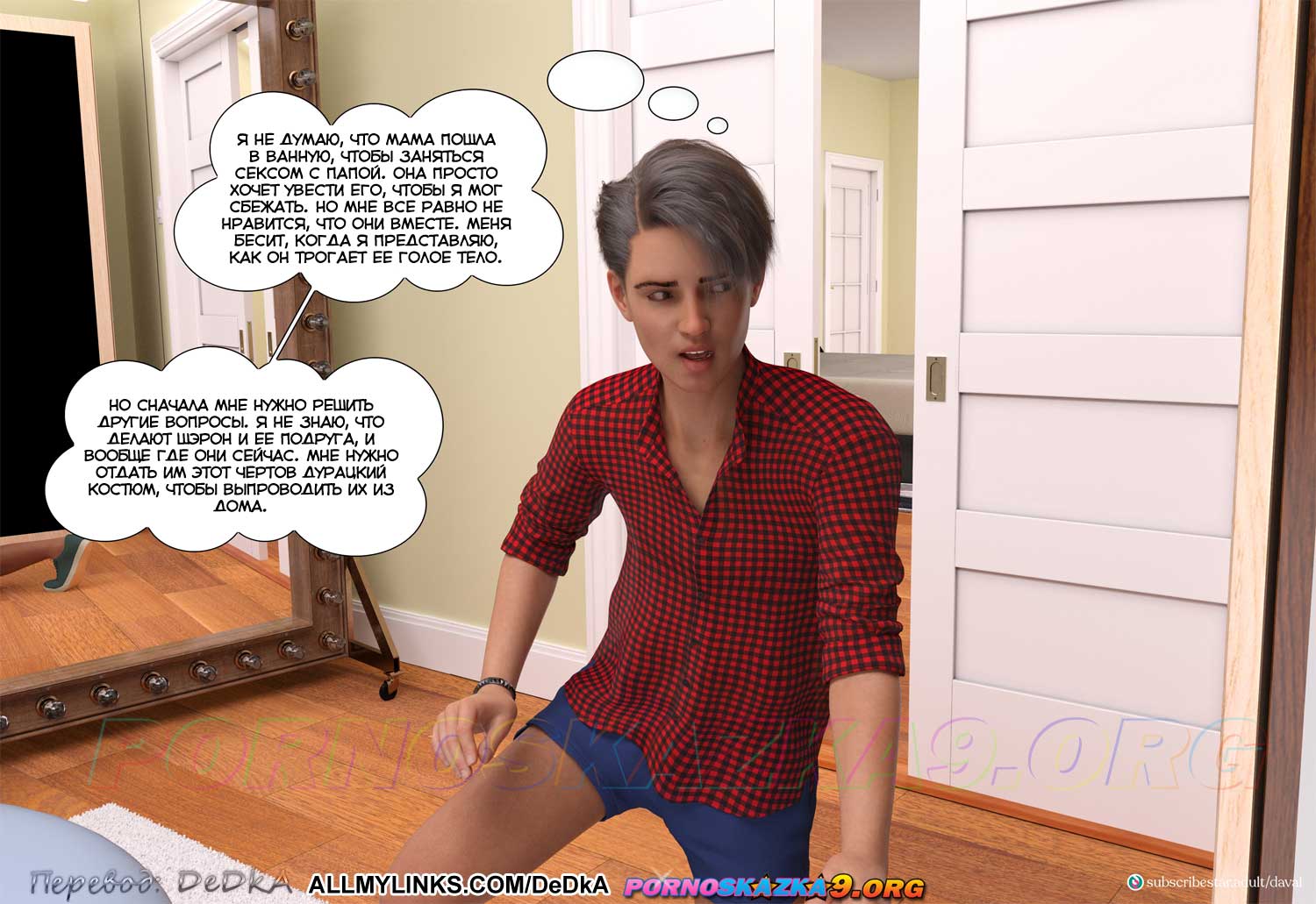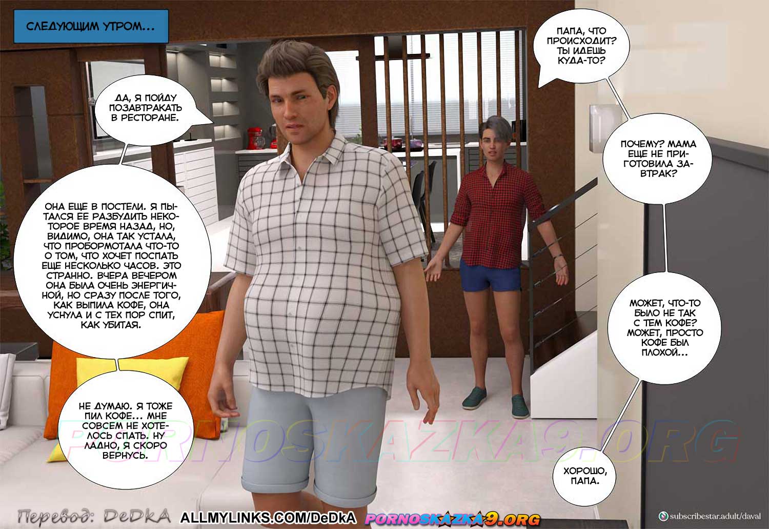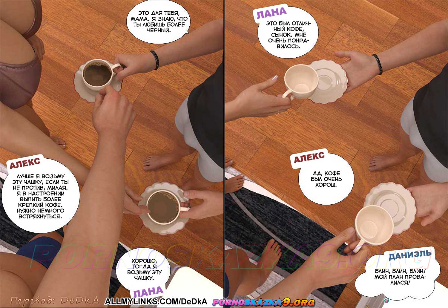 Порно комикс Непристойные желания мамаш. Часть 12. Семейка вернулась домой после выходных проведенных в гостях. Даниэль и Алекс вернулись не с пустыми руками. Алекс привез с собой таблетку, которая должна помочь ему быть на высоте в постели с Ланой, а Даниэль привез с собой таблетку снотворного, которую он решил бросить в кофе Алекса, чтобы он уснул. Чья таблетка окажется круче?