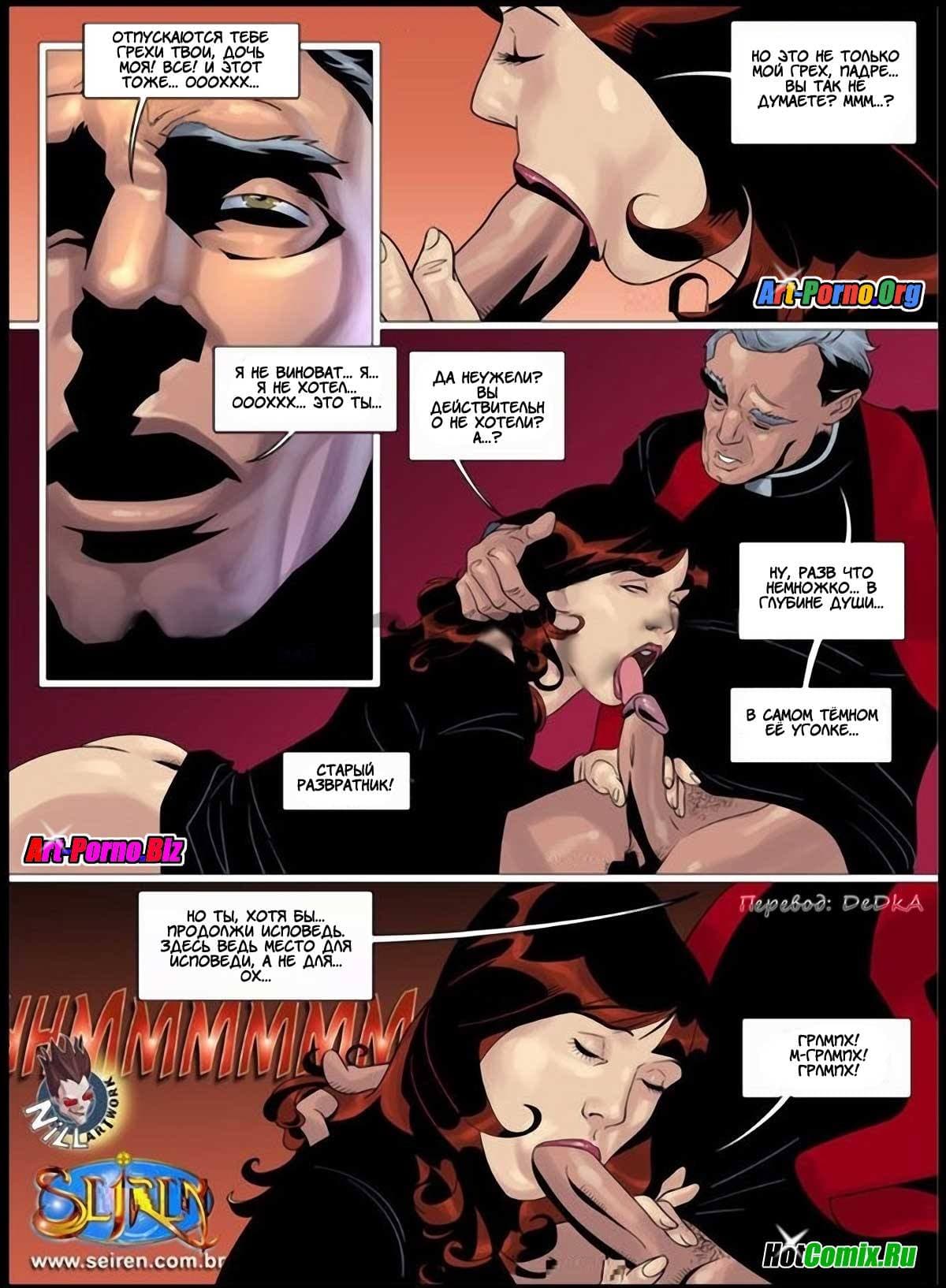 В третьей части порно комикс Несколько маленьких грешков расскажет о том, как женщина, которая исповедовалась перешла в кабинку к святому отцу, где помимо признания своих грехов она начала творить новые. Сила ее соблазнения была настолько велика, что ни один мужчина не мог ей сопротивляться. Поэтому любой жаждал вогнать в ее манящее лоно член. И, как вы понимаете, священник не был исключением в этом случае тоже…
