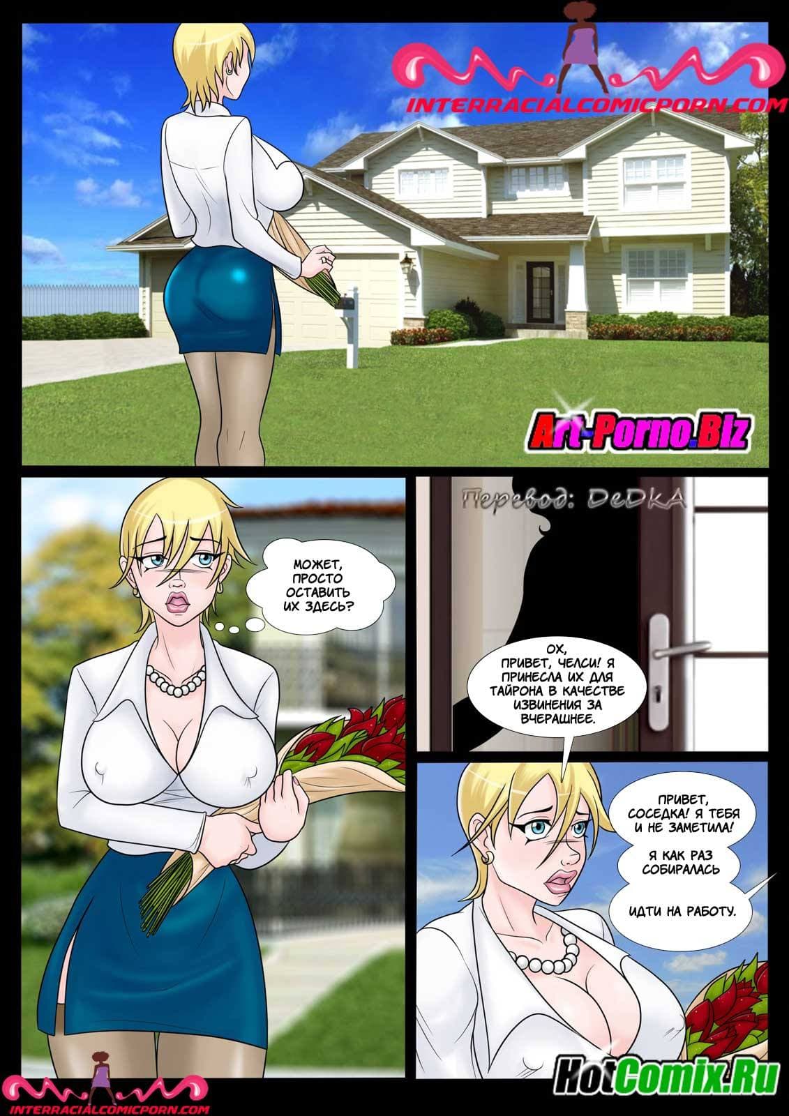Замечательный порно комикс про измену, из которого вы узнаете, как в один из дней одна телка увидела, что в рядом стоящий дом переезжают новые постояльцы. Ими стала чернокожая пара – девушка Челси и ее муж Тайрон – здоровенный амбал, достоинством которого был огромный член, который нашей белокожей героини пришлось попробовать, и даже проглотить содержимое его яиц. А как все это возбуждающее действо случилось, смотрите далее.