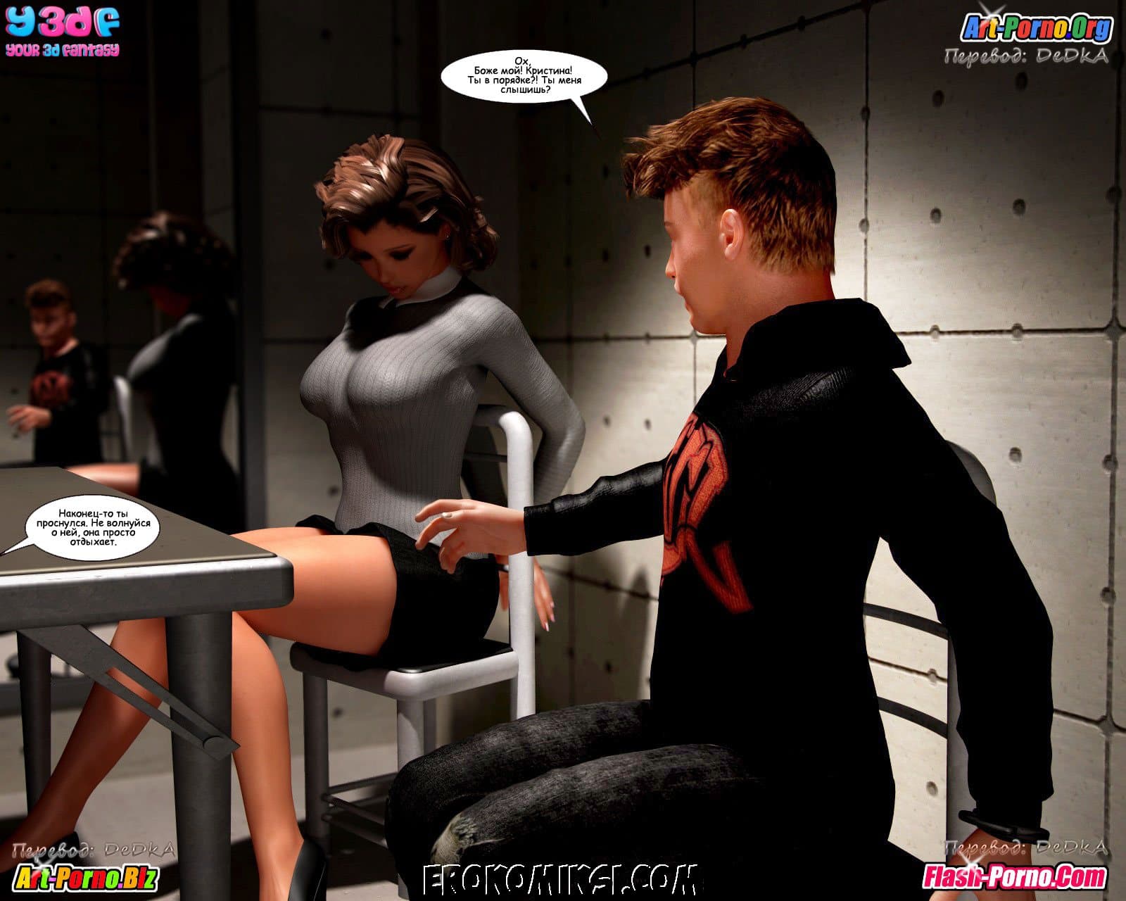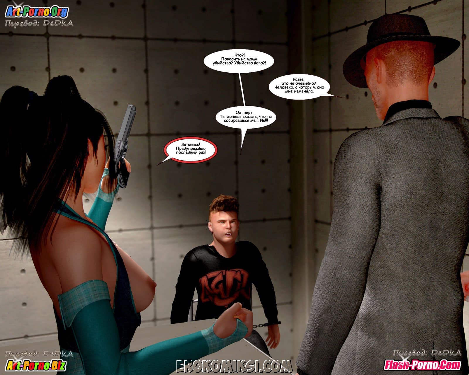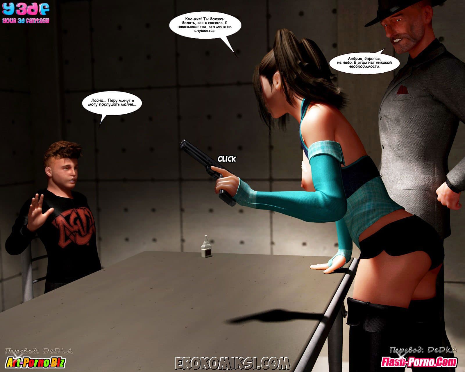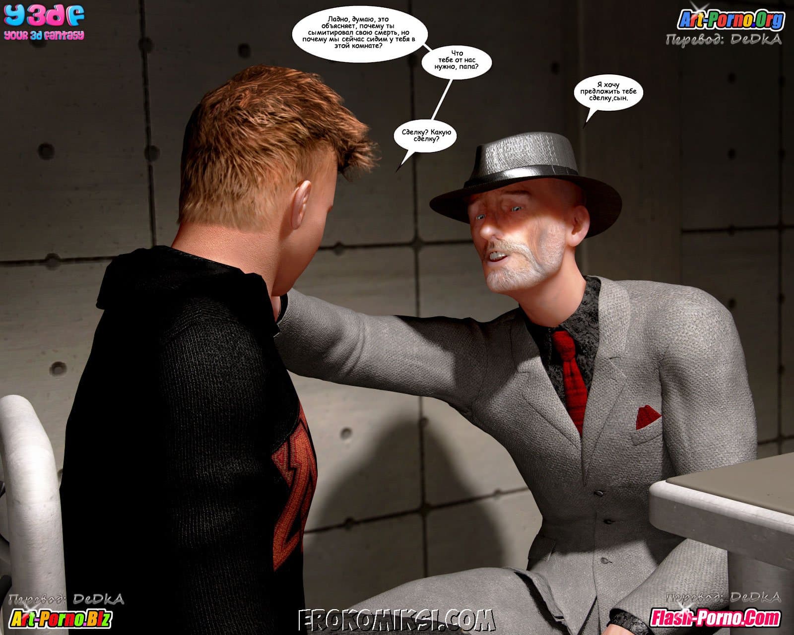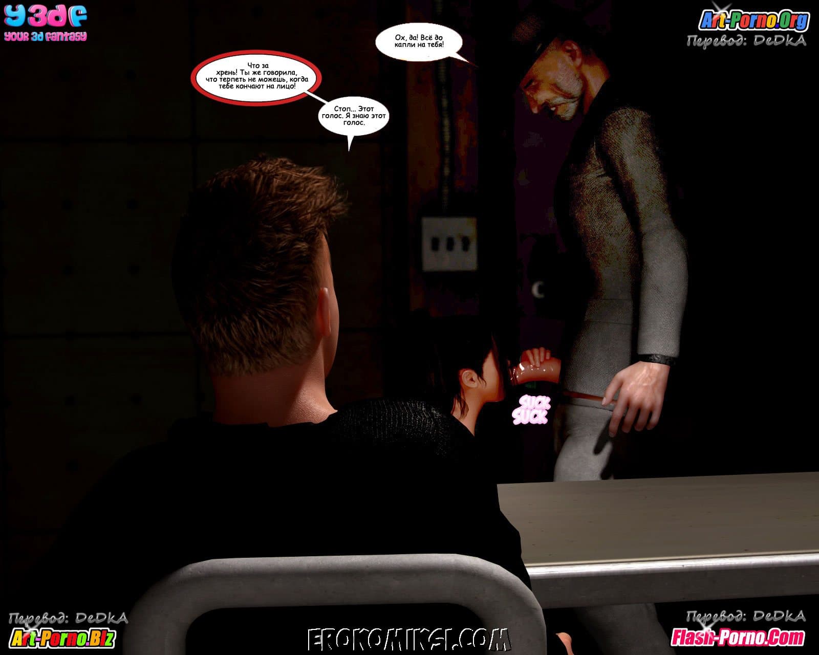 Многосерийный порно комикс пойманные продолжается великолепной частью под названием «Объяснение». Как вы помните прошлая история закончилась тем, что Андрия под дулом пистолета повела Джейкоба и Кристину к своему боссу. А эта часть начинается с того, что Джейкоб пришел в себя в логове этого самого босса и увидел сначала сисястую Кристину, находящуюся без сознания, а потом и Андрию сосущую твердый член… у кого бы вы думали? У его воскресшего папаши!!! Неужели, запутанная сюжетная линия откровенного комикса обретает, наконец, логику! Смотрим внимательно…