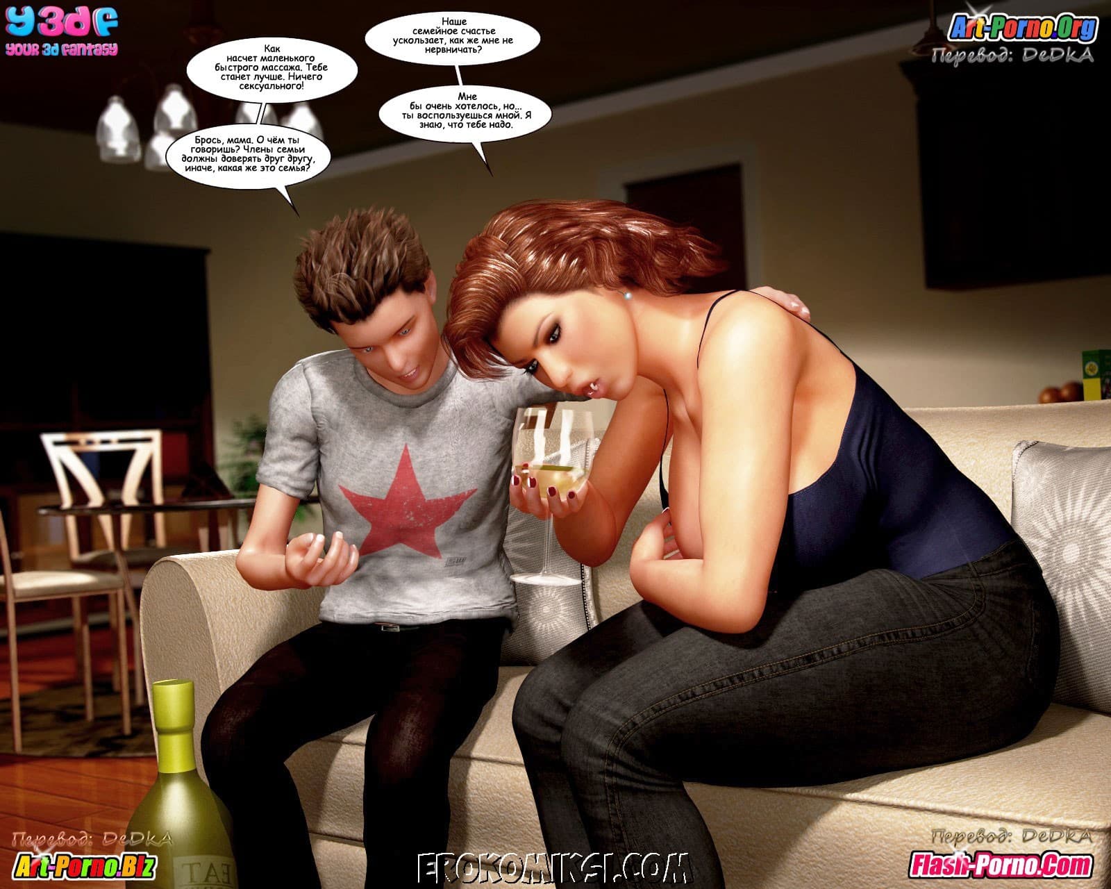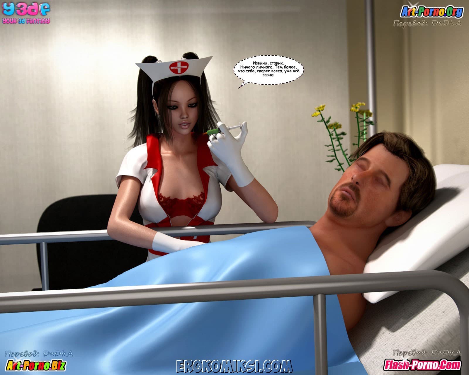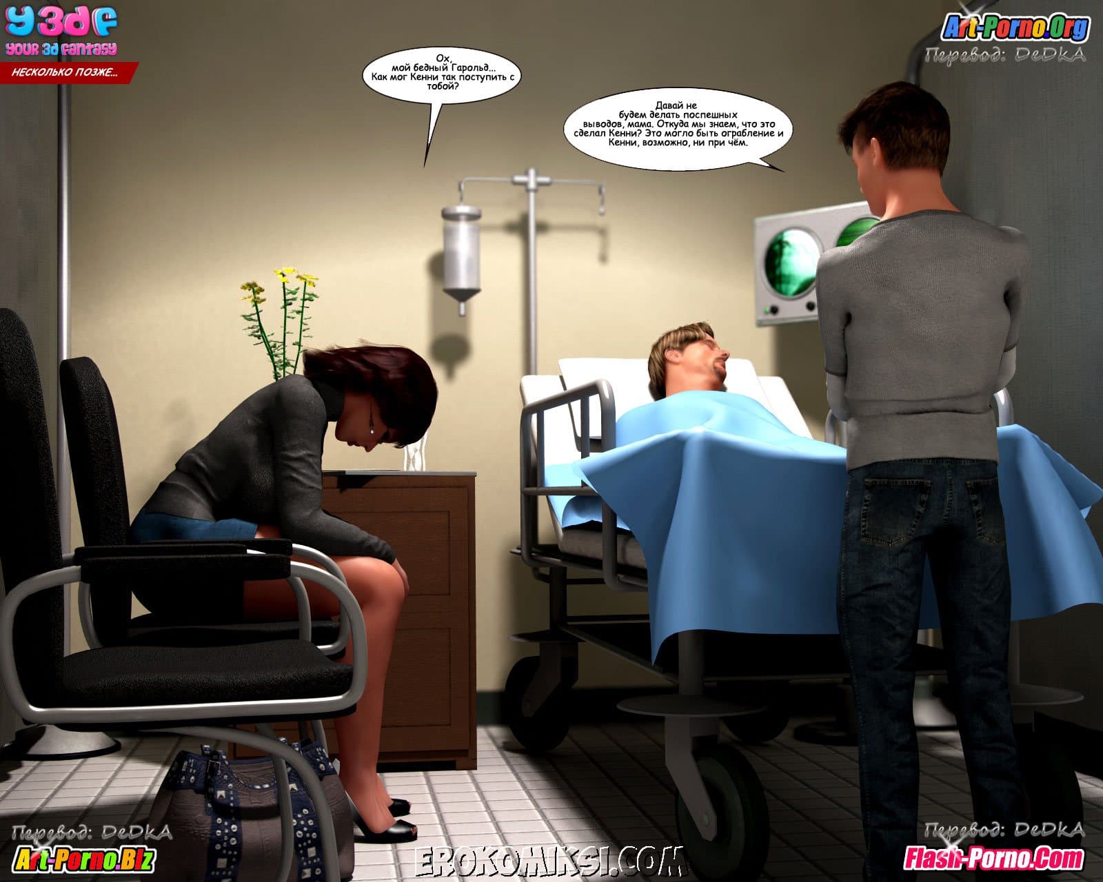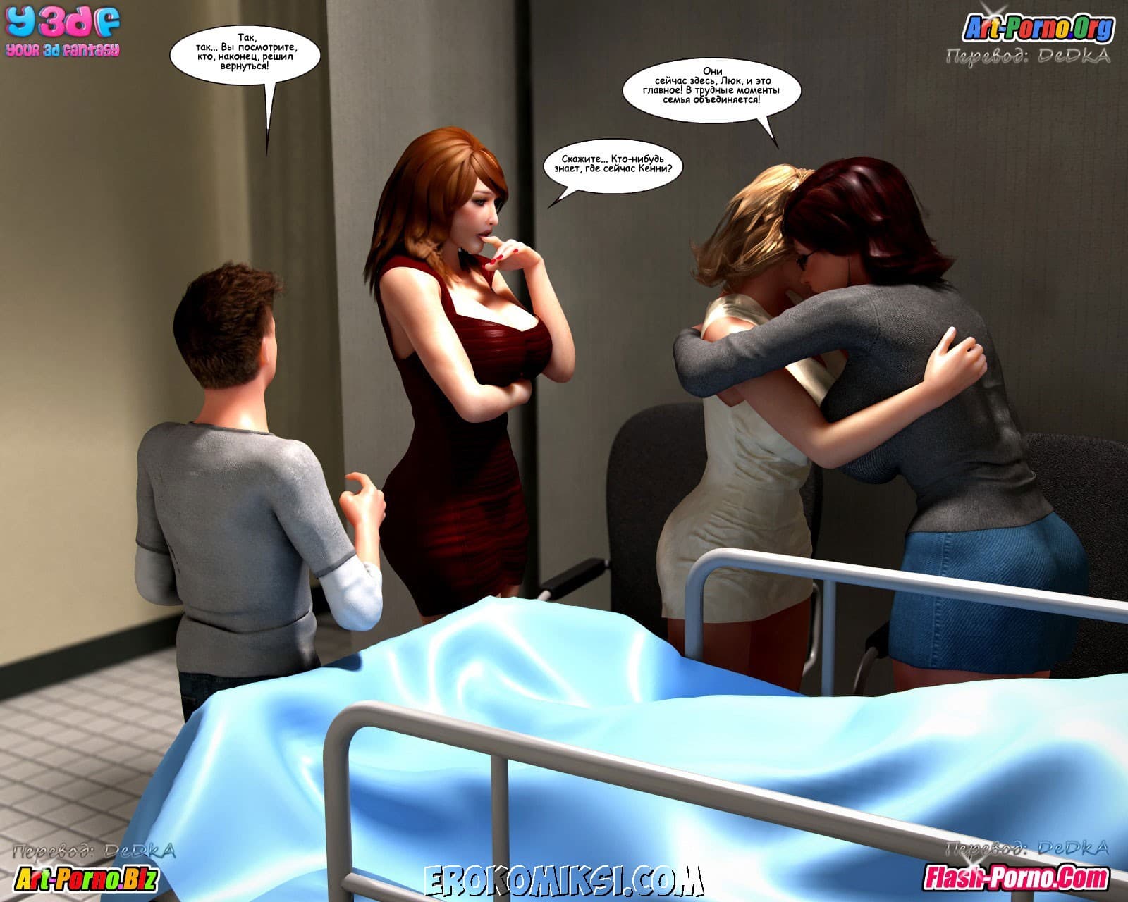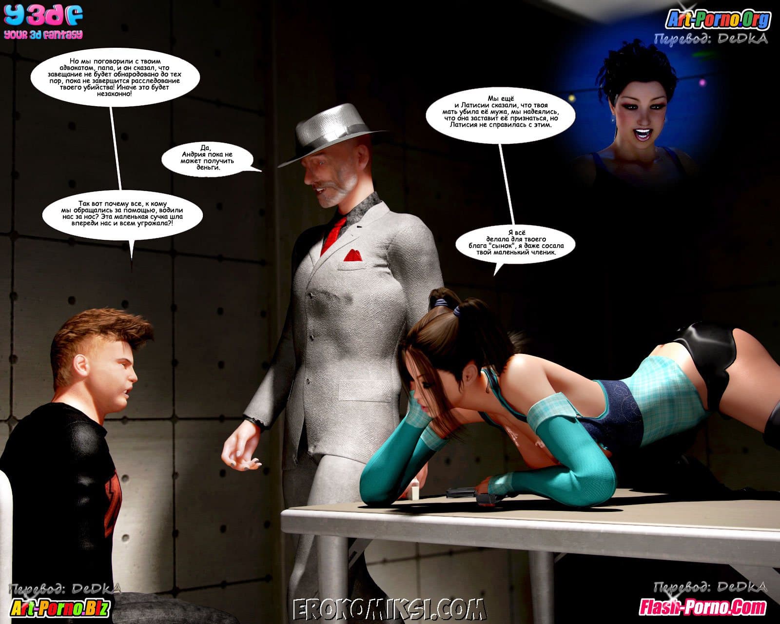 Многосерийный порно комикс пойманные продолжается великолепной частью под названием «Объяснение». Как вы помните прошлая история закончилась тем, что Андрия под дулом пистолета повела Джейкоба и Кристину к своему боссу. А эта часть начинается с того, что Джейкоб пришел в себя в логове этого самого босса и увидел сначала сисястую Кристину, находящуюся без сознания, а потом и Андрию сосущую твердый член… у кого бы вы думали? У его воскресшего папаши!!! Неужели, запутанная сюжетная линия откровенного комикса обретает, наконец, логику! Смотрим внимательно…