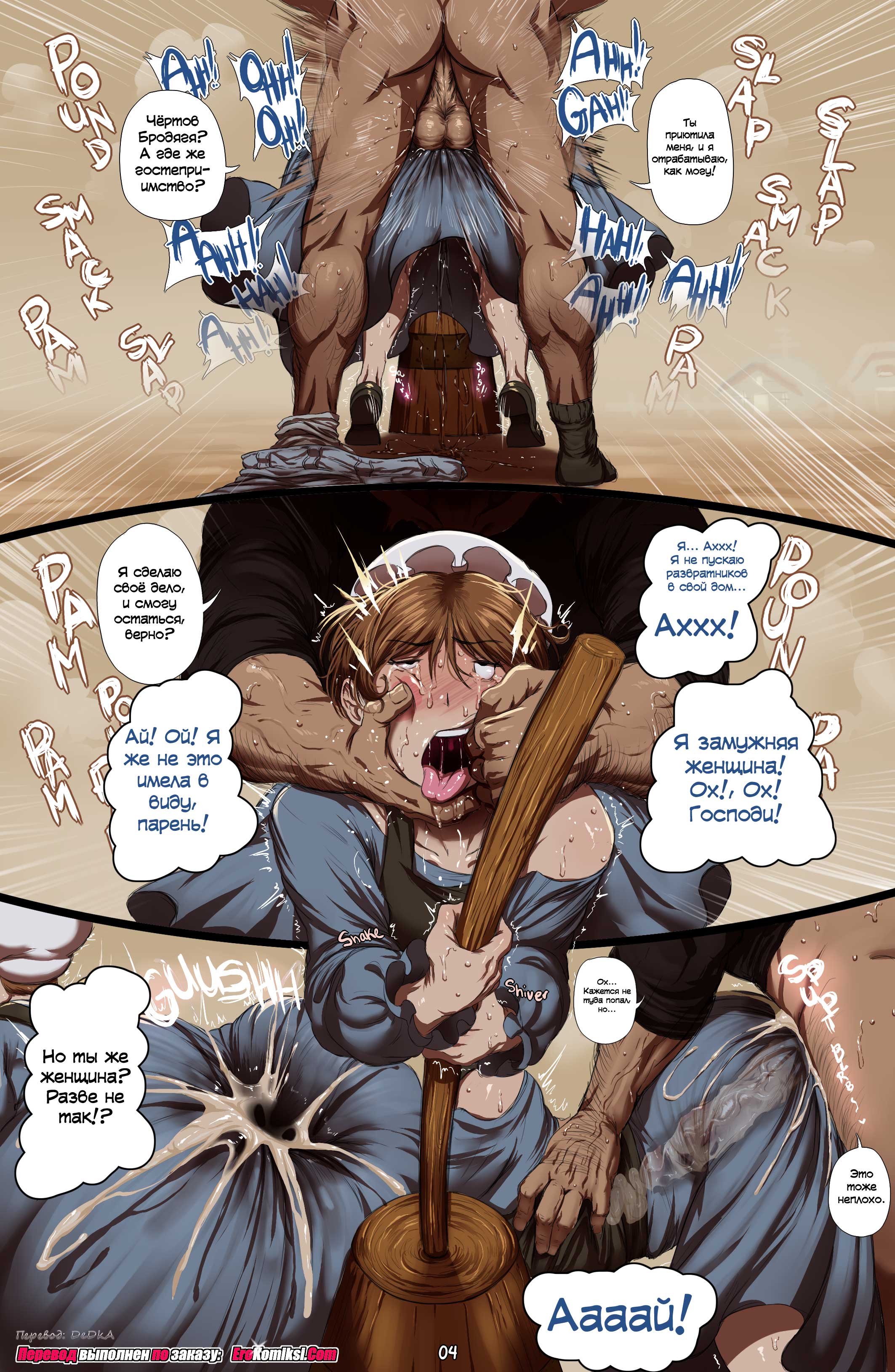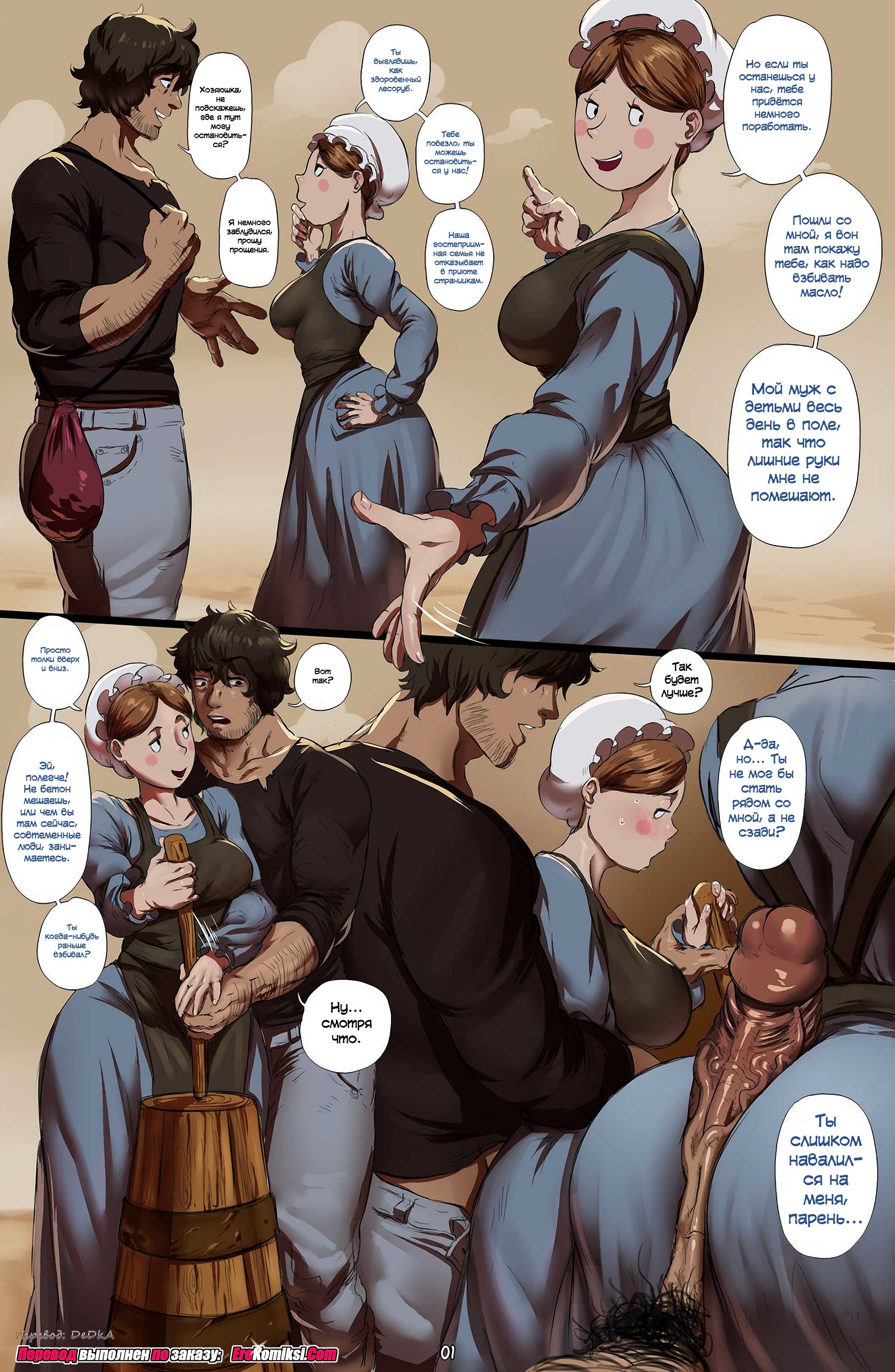 Добропорядочная деревенская домохозяйка, пока её муж с детьми работали в поле, сбивала в огромной ступе масло. И тут к ней подошёл молодой и сильный странник и спросил, где тут можно остановиться. Гостеприимная и смышлёная бабёнка сразу смекнула, что такой здоровенный мужчина может здорово помочь ей в работе по хозяйству, и сказала, что он может остановиться у неё в доме, но за это ему придется немного поработать…