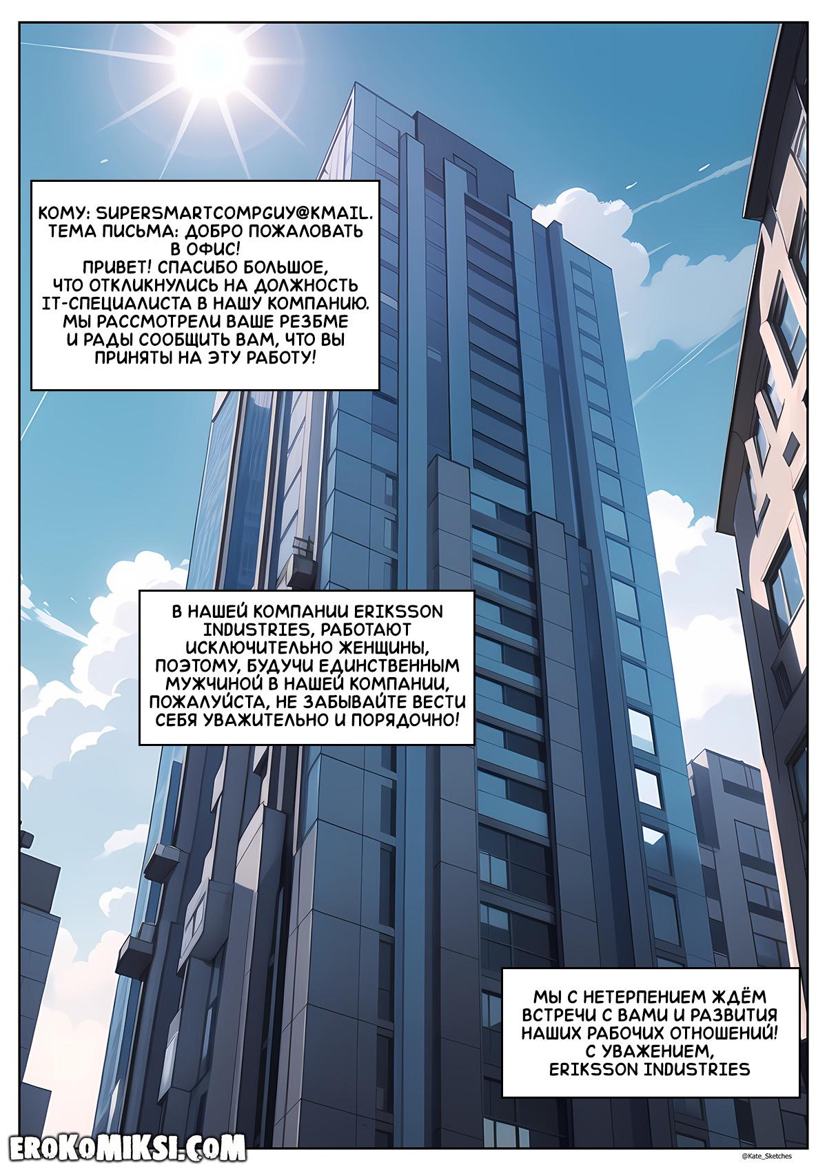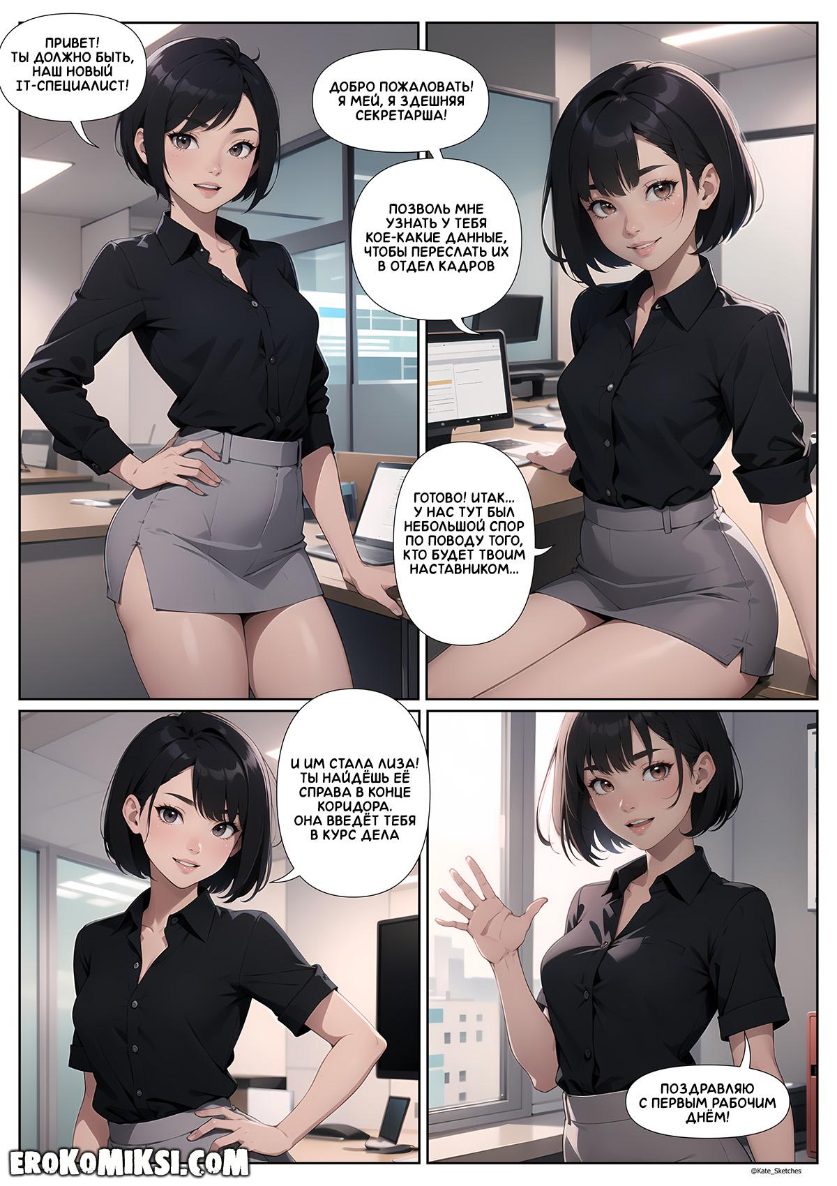 Порно комикс Офис. Эпизод 1: Первый рабочий день. Молодой айтишник устраивается в крупную компанию, где работают исключительно девушки. И в первый же рабочий день, когда сисястая озабоченная красотка Лиза показывала пареньку офис, ему перепало как следует оттрахать красавицу и залить её своей горячей спермой.