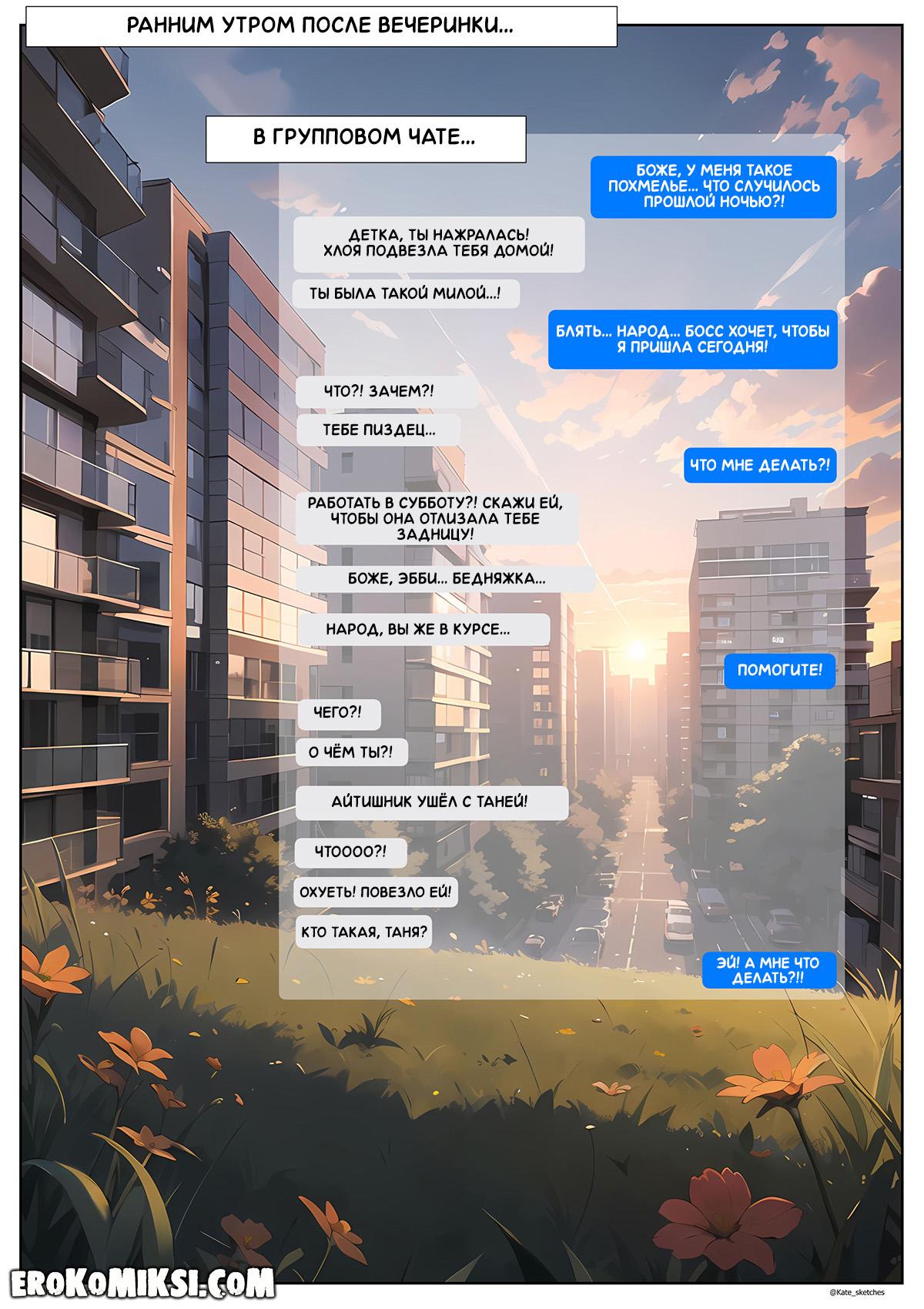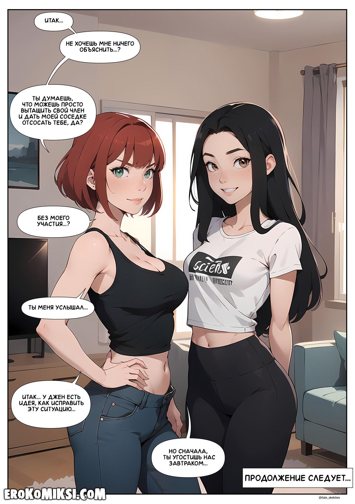 Порно комикс Офис. Эпизод 7. Соседка по комнате. Выйдя утром на кухню, главный герой встретил соседку Тани, Джен, которая всю ночь была дома и слышала, как они трахались. Стоны Тани так её возбудили, что она захотела увидеть член, которым трахали её соседку и довольно быстро ей удалось залезть в штаны айтишника и отсосать его огромный член…