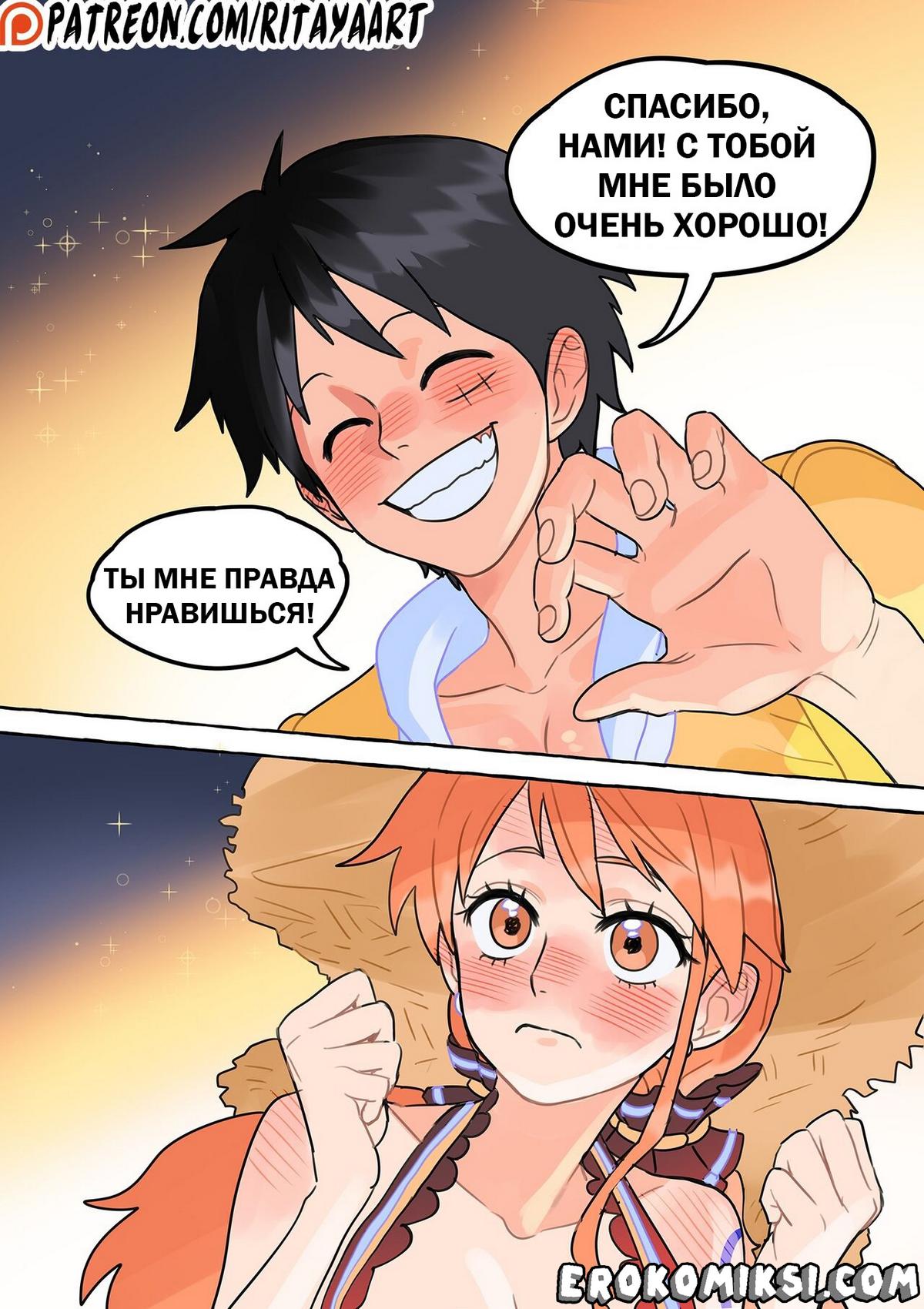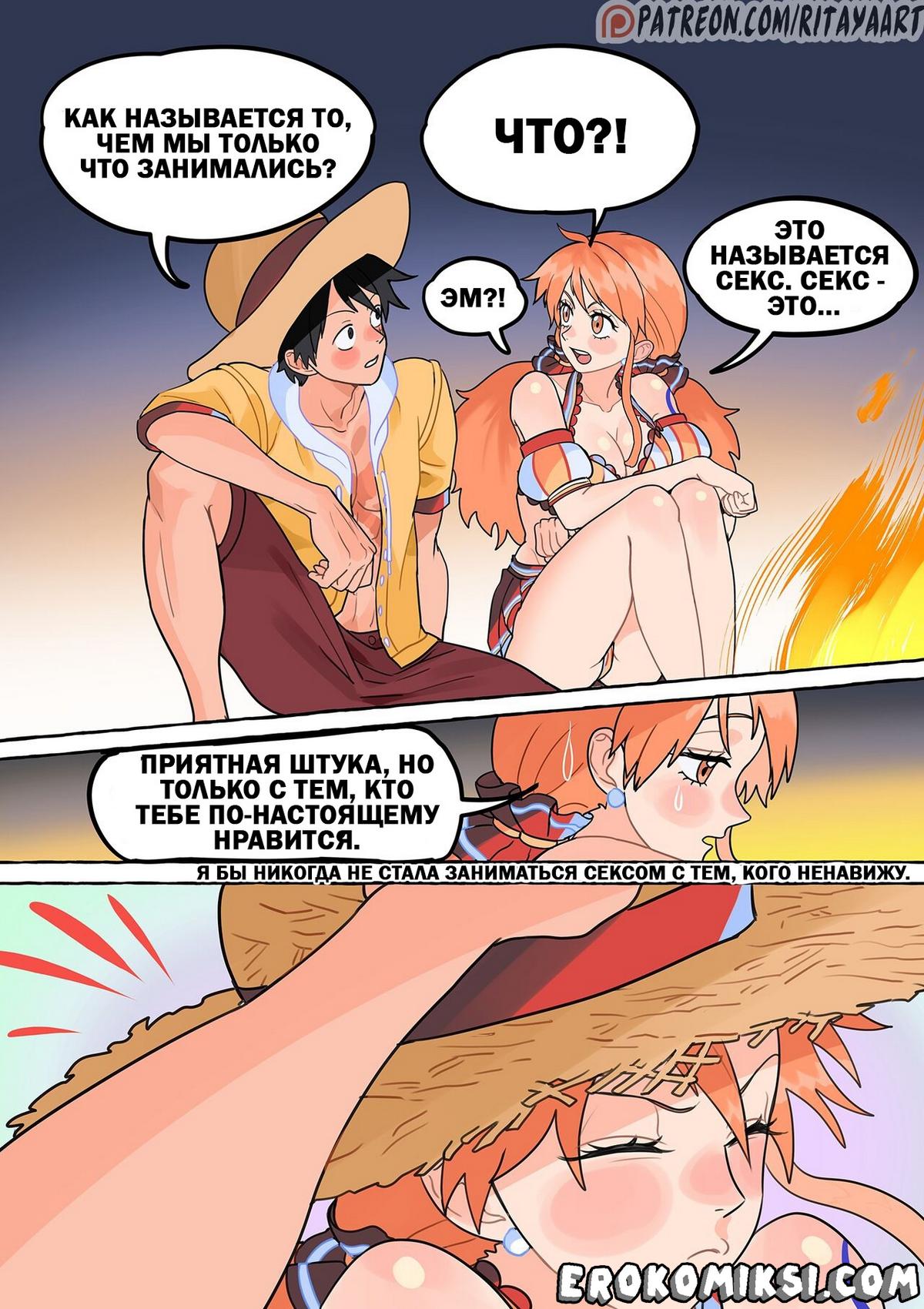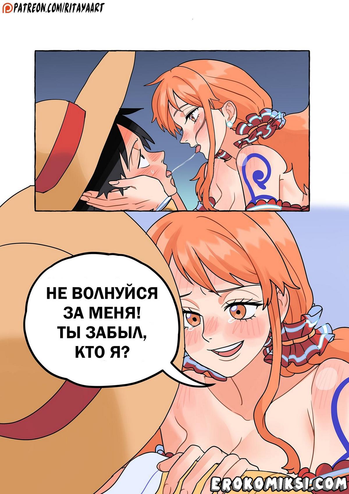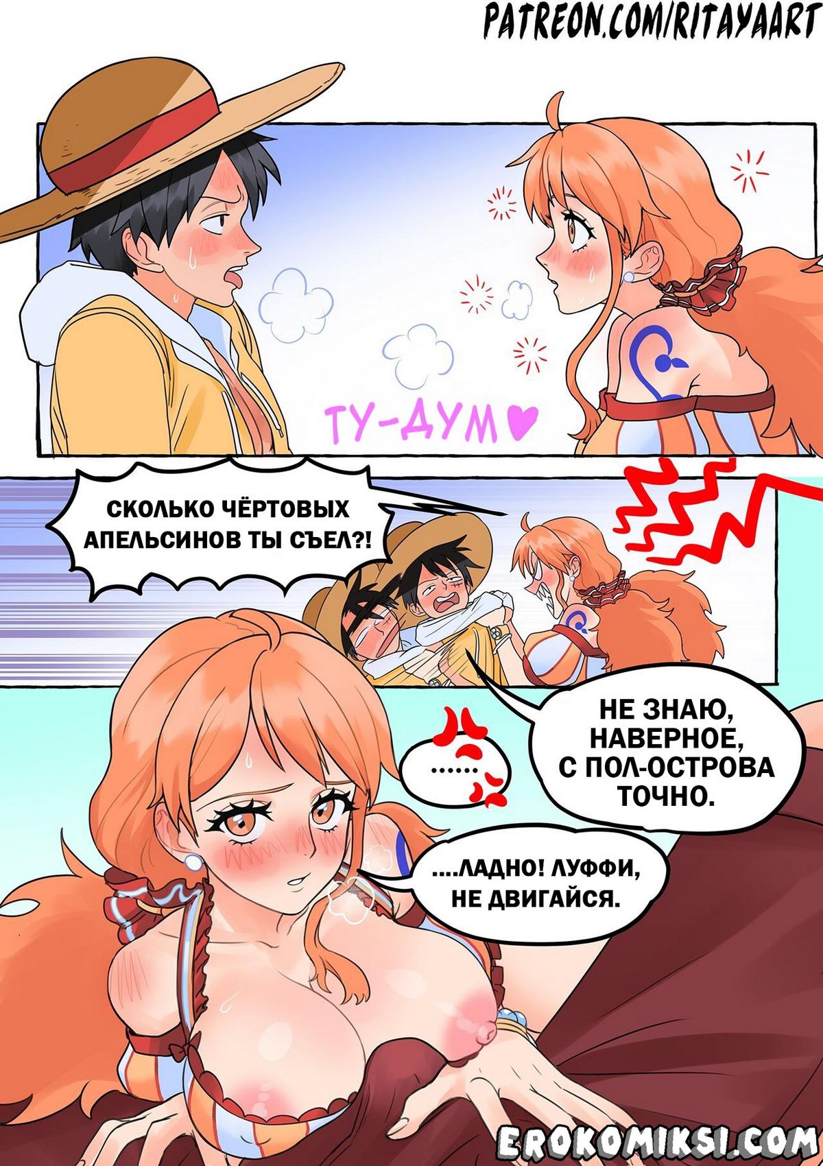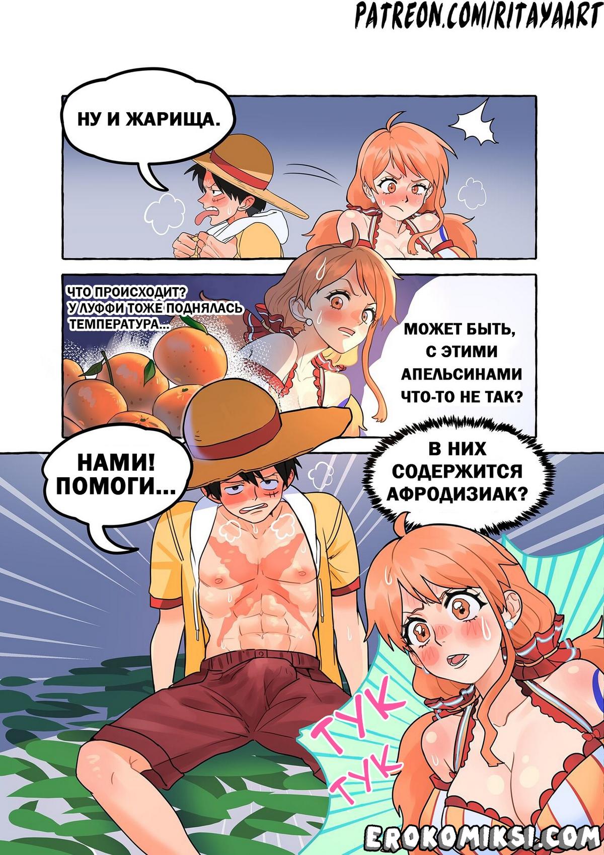 Порно комикс One Piece. Инцидент на необитаемом острове после кораблекрушения. Луффи и Нами отправились в город за припасами, но по пути на них напал Морской Король и их вынесло на неизвестный необитаемый остров, на котором растут необычные апельсины…