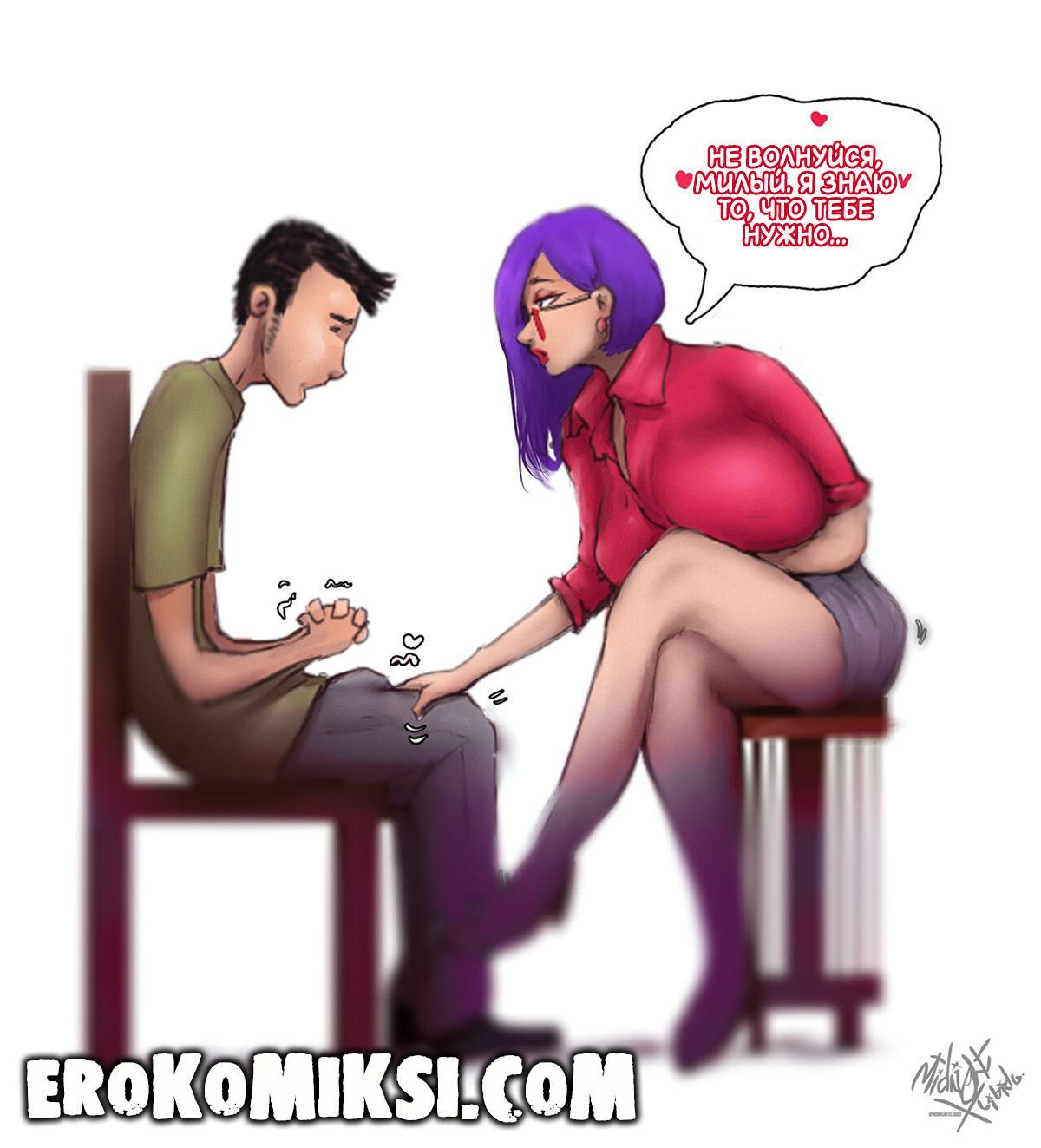 Порно комикс Особенный метод терапии. Парень пришёл на приём к сексуальному психологу у которой свои методы терапии для таких молоденьких парней. Она показала ему свои огромные сиськи и приказала ему вытащить свой член. Паренёк достал член и начал яростно дрочить, полностью обкончав всё тело своей докторши…