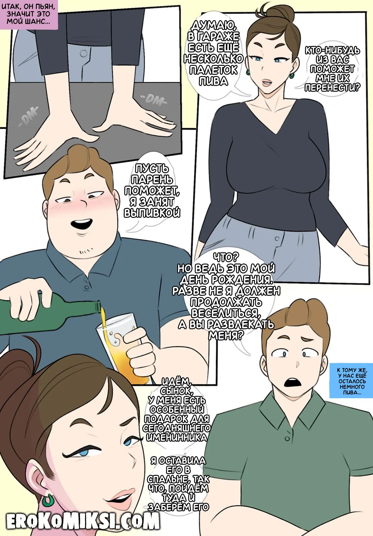 Порно комикс Особенный подарок от мамы. Пареньку исполнился двадцать один год и он отмечает это событие со своими родителями. Пока отец бухает, мама позвала своего любимого сыночка в спальню, так как там у неё припрятан особенный подарок для сынули. Не успел парнишка зайти в спальню, как мамашка сразу же набросилась на его член…