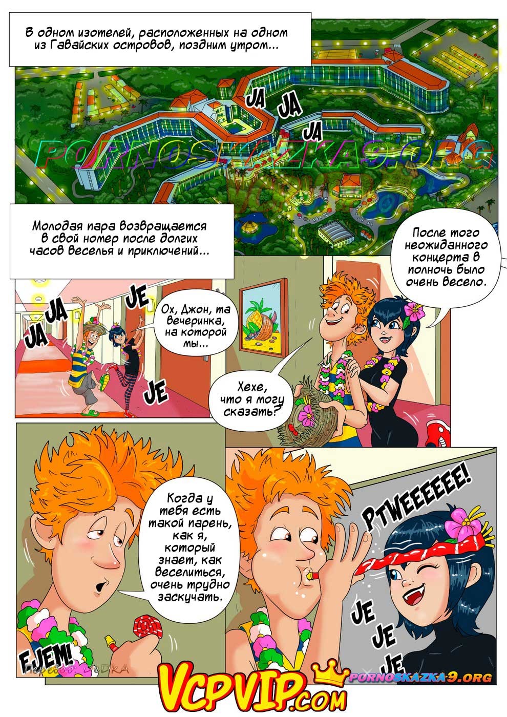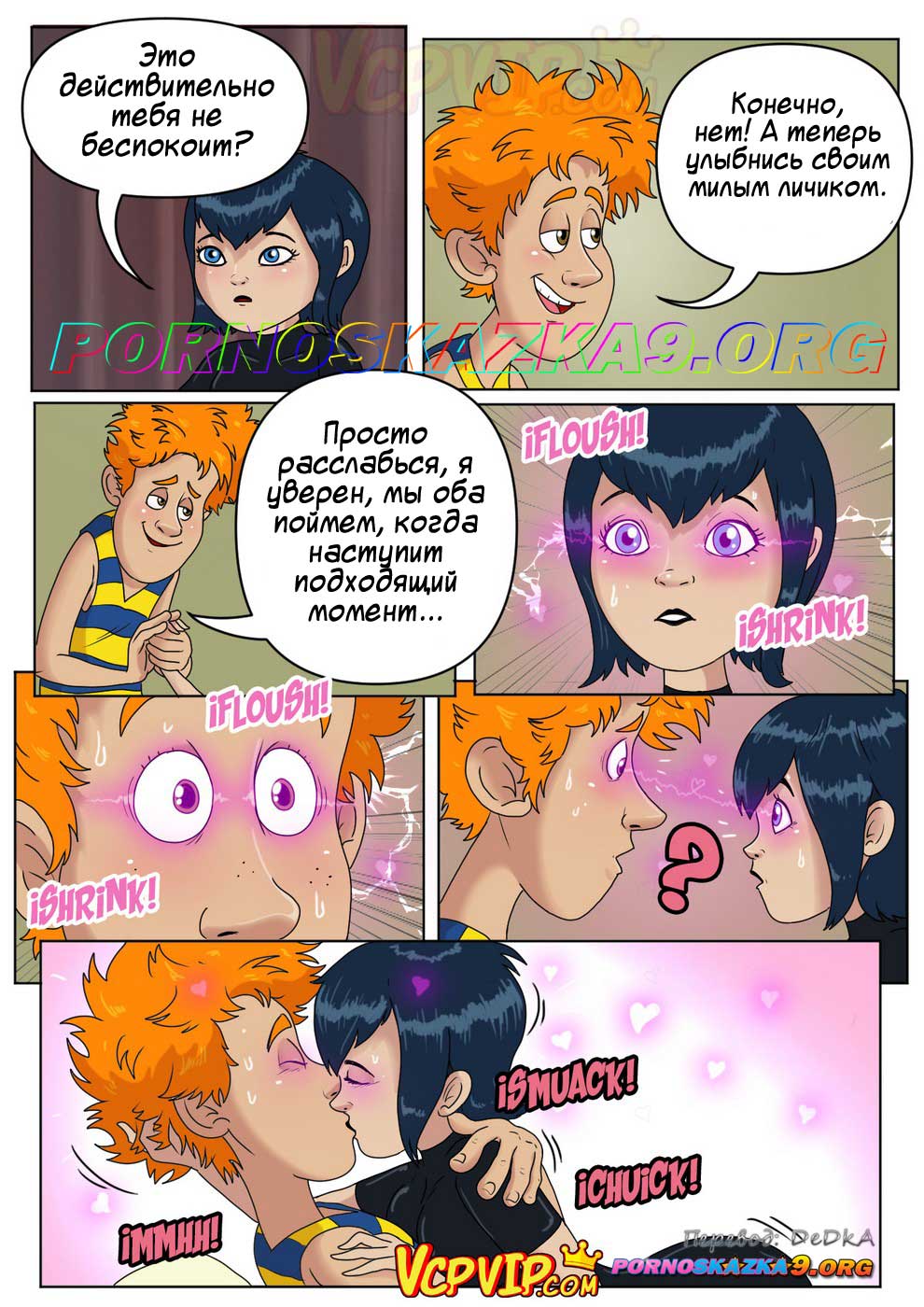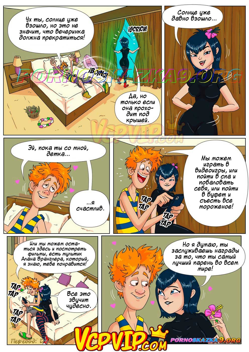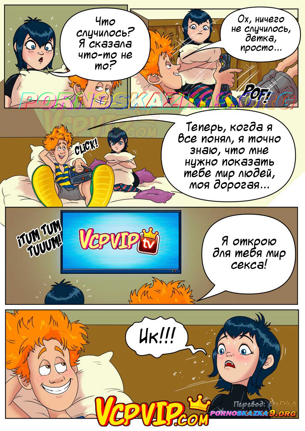 Порно комикс Отель трансильвания. Жутко чувственная ночь. Беззаботный Джон наслаждается обществом Мэвис и чувствует себя превосходно, но когда дело доходит до интимных вещей, возникает одна проблема.