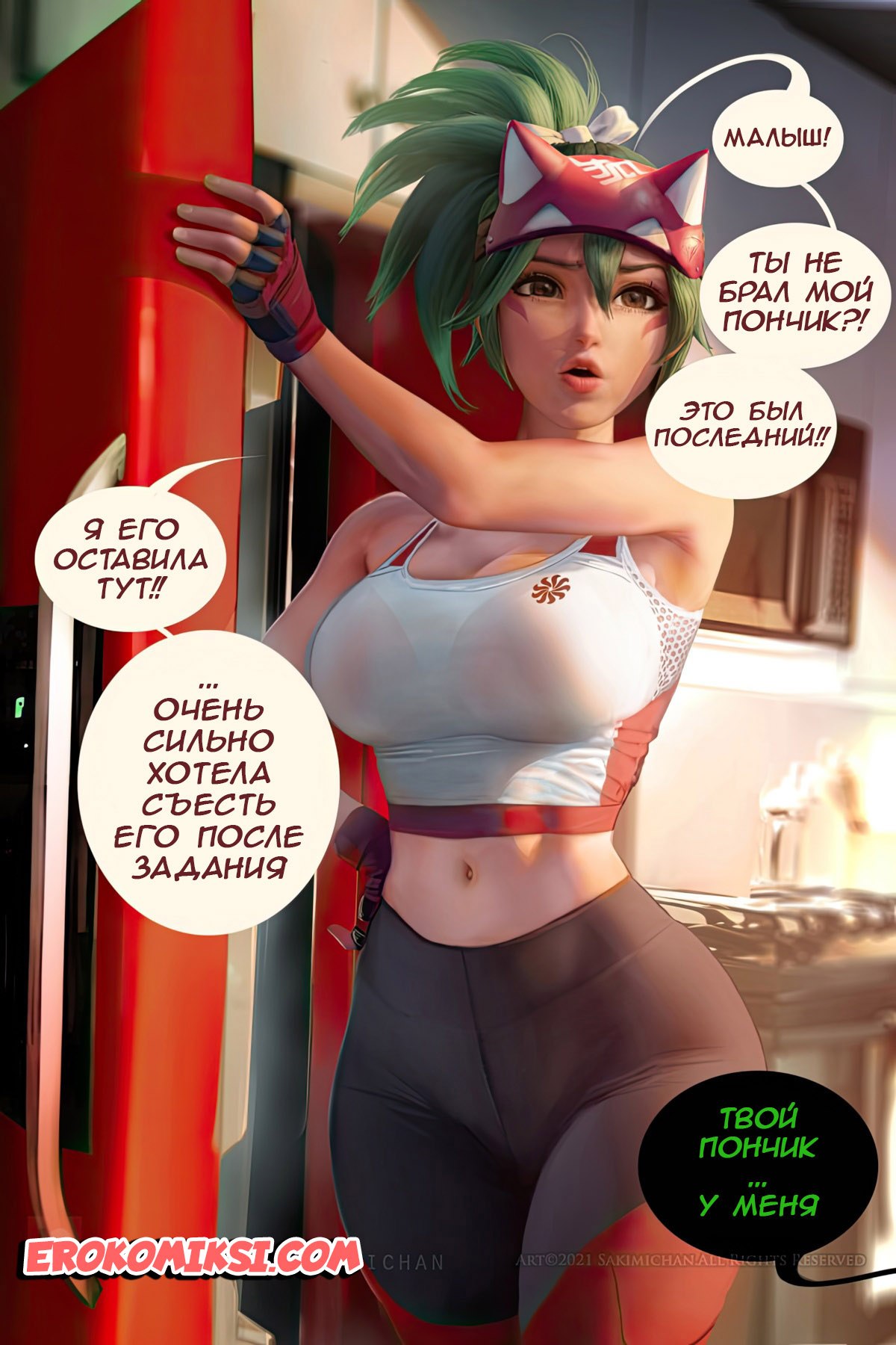 Порно комикс Overwatch: Кирико хочет свой пончик. Кирико хочет заполучить свой пончик любой ценой. Но её парень спрятал сладости и хочет пошалить со своей девушкой прежде, чем отдать ей пончик…