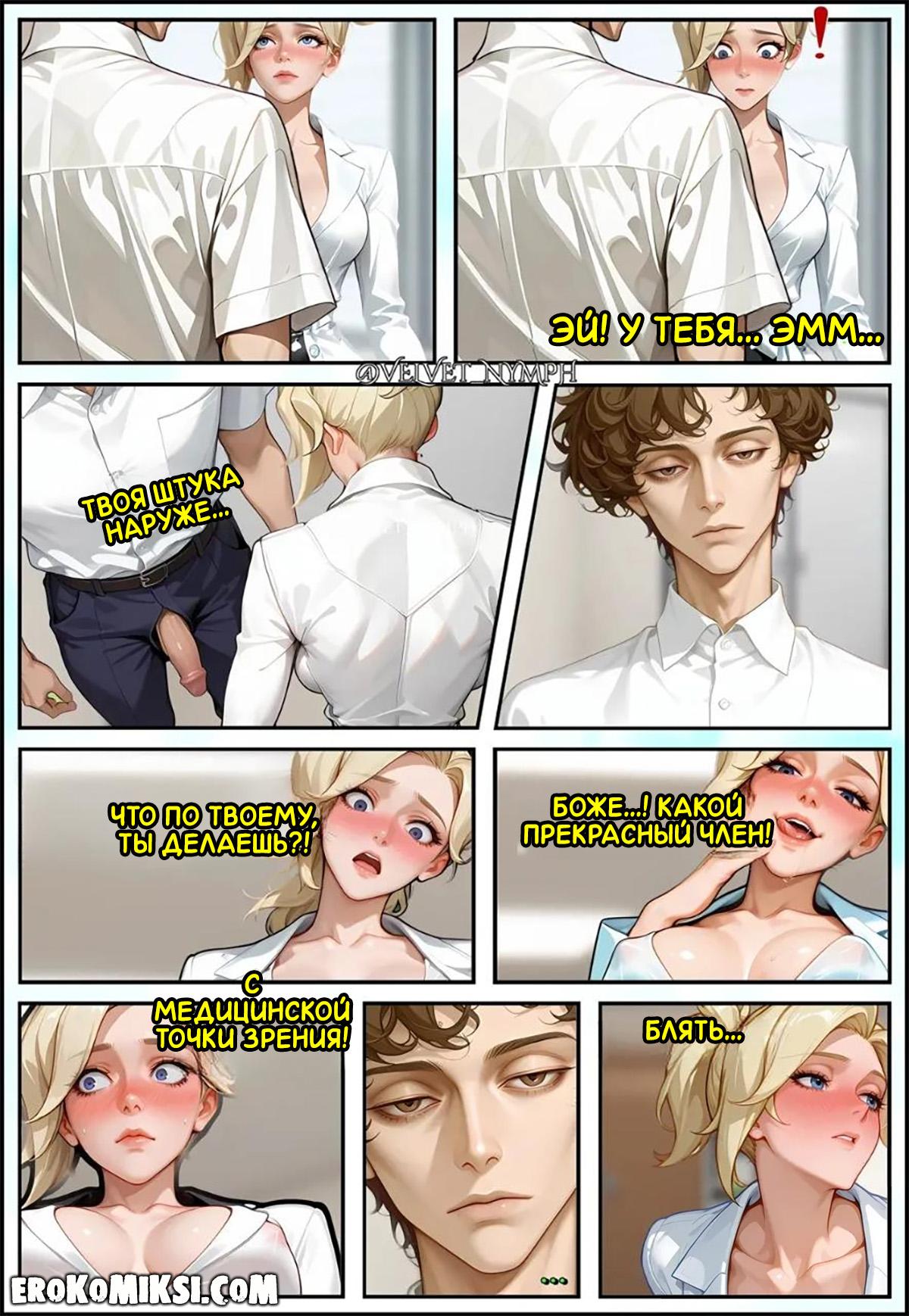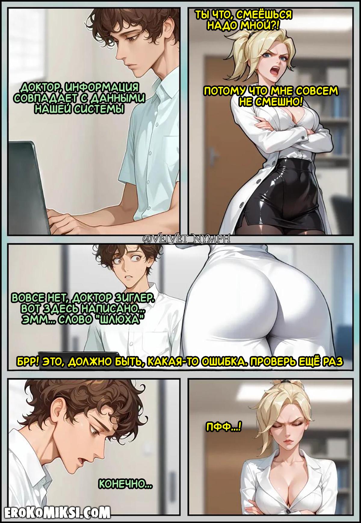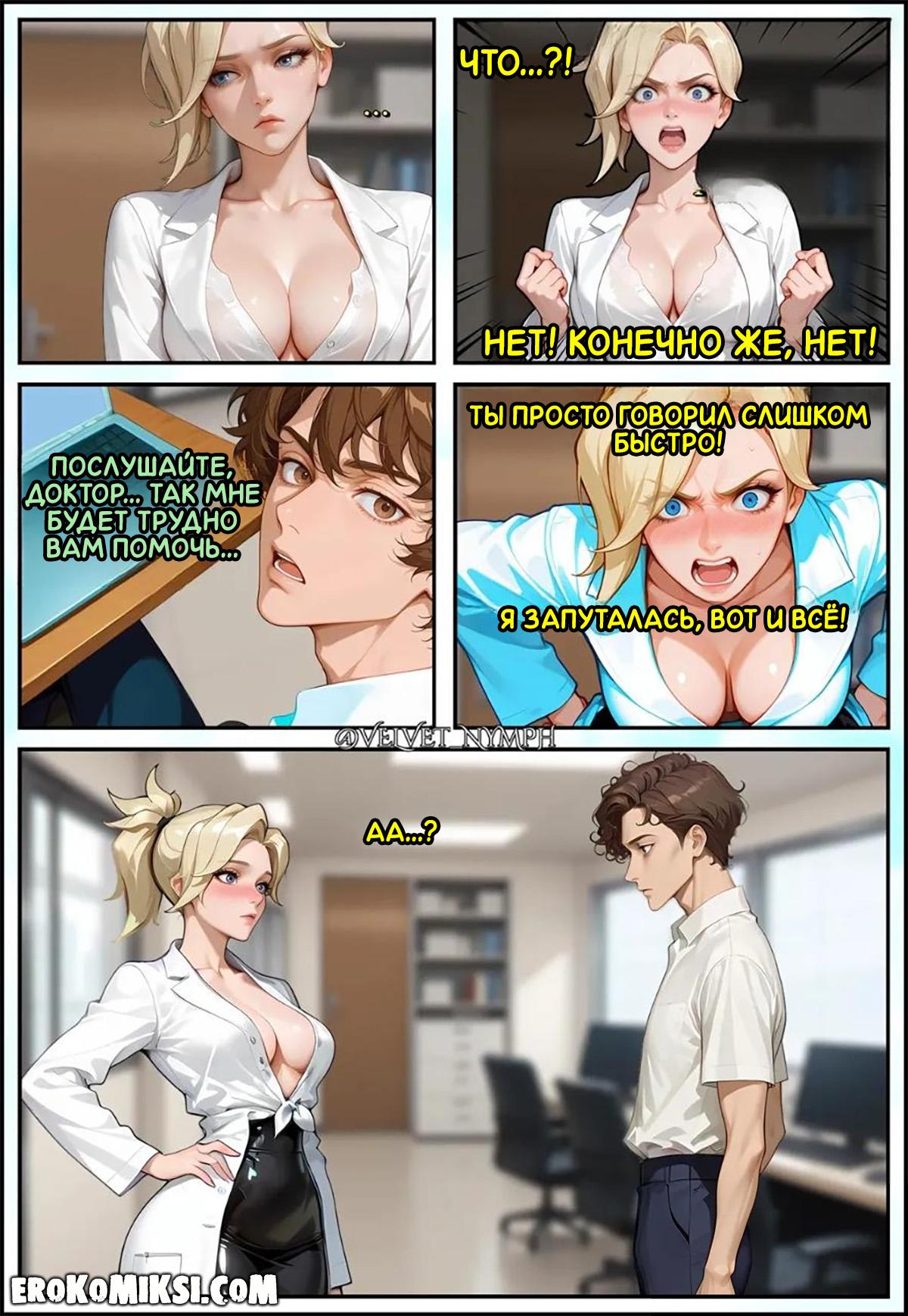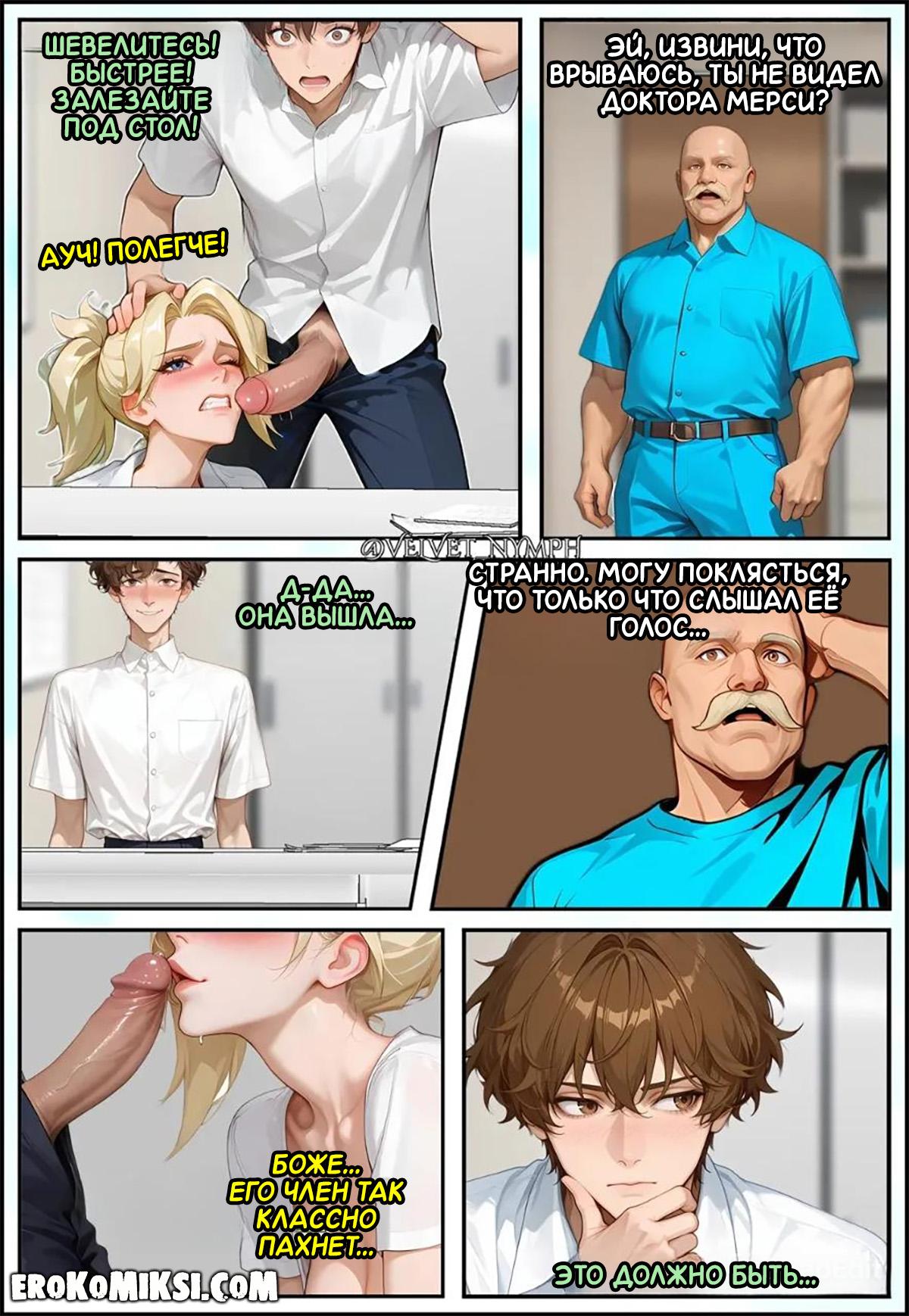 Порно комикс Overwatch. Поклонник. Медицинский сотрудник. В базу просочилась информация, что доктор Мерси шлюха. Пытаясь объяснить своему помощнику, что это не правда, парнишка возбудился, и увидев бугор его штанах, Ангела принялась его сосать, так как она в действительности была настоящей шлюхой!