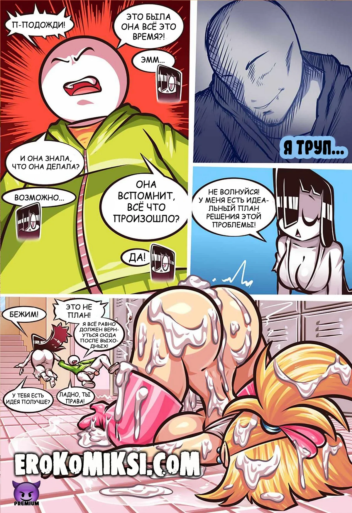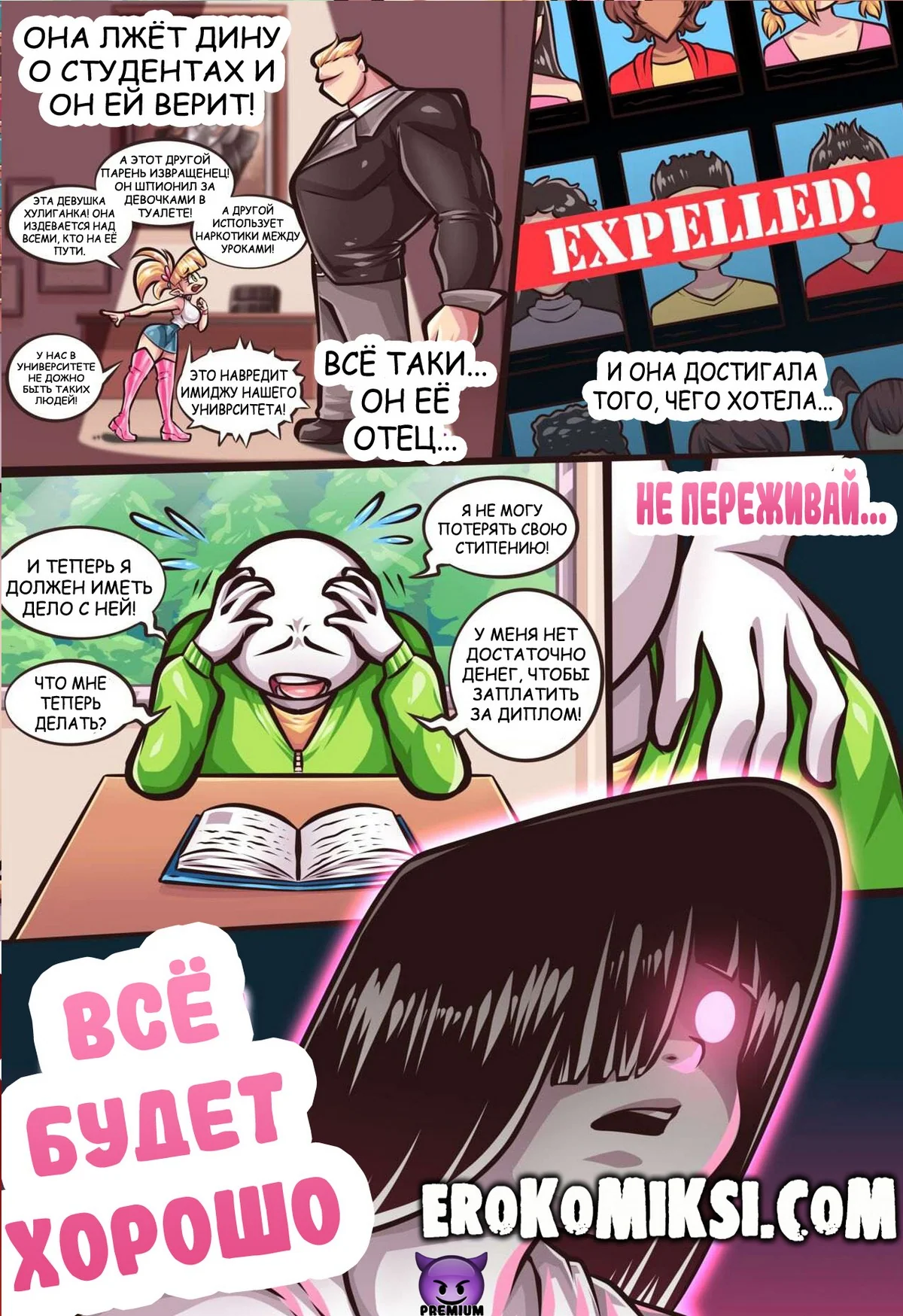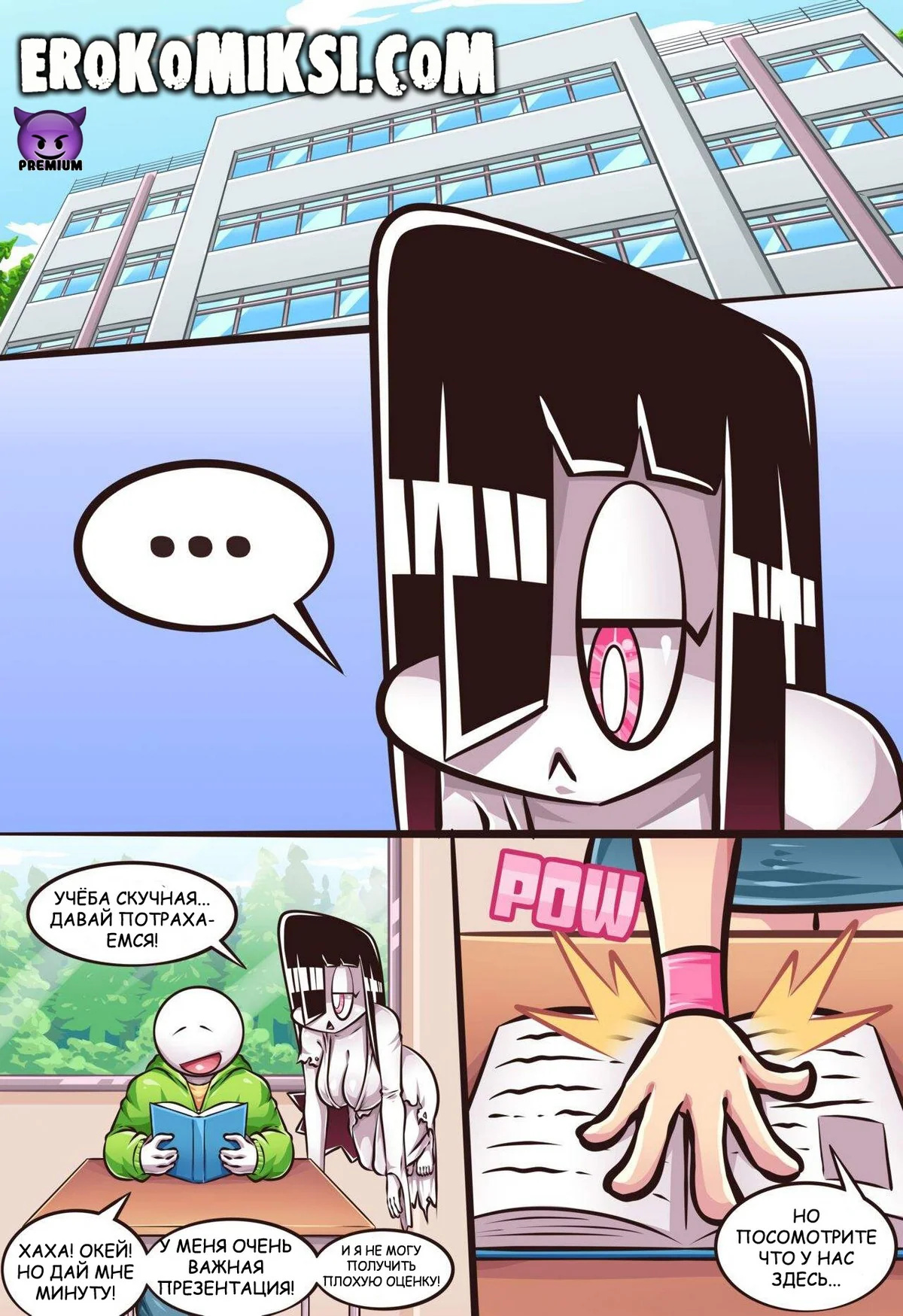 Порно комикс Паранормальное удовольствие. Часть 2. Нашего главного героя прессует его одногруппницу Хлоя — сексуальная и очень наглая девушка, которая имеет привилегии в университете из-за того, что ей отец директор. Призрак-подруга решает помочь герою и вселяется в неё для того, чтобы он отымел её во все дыры…