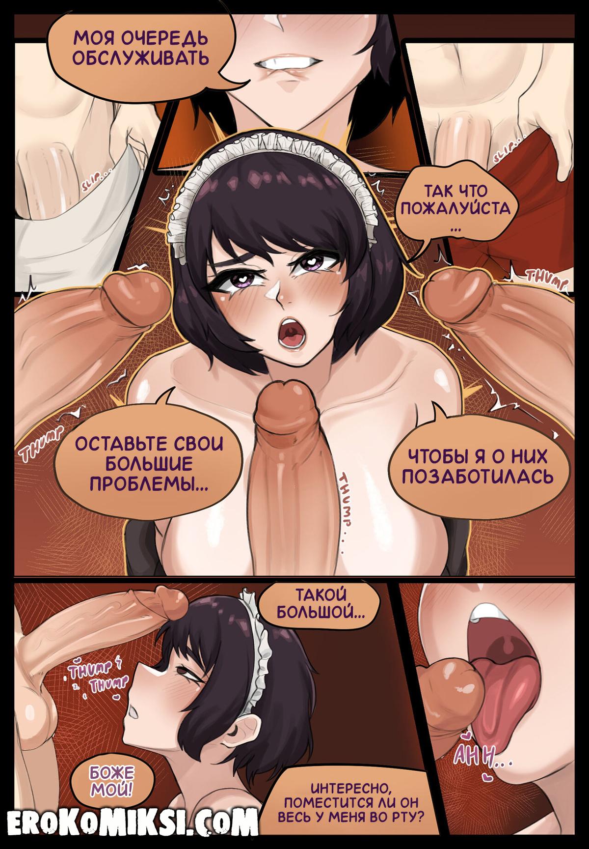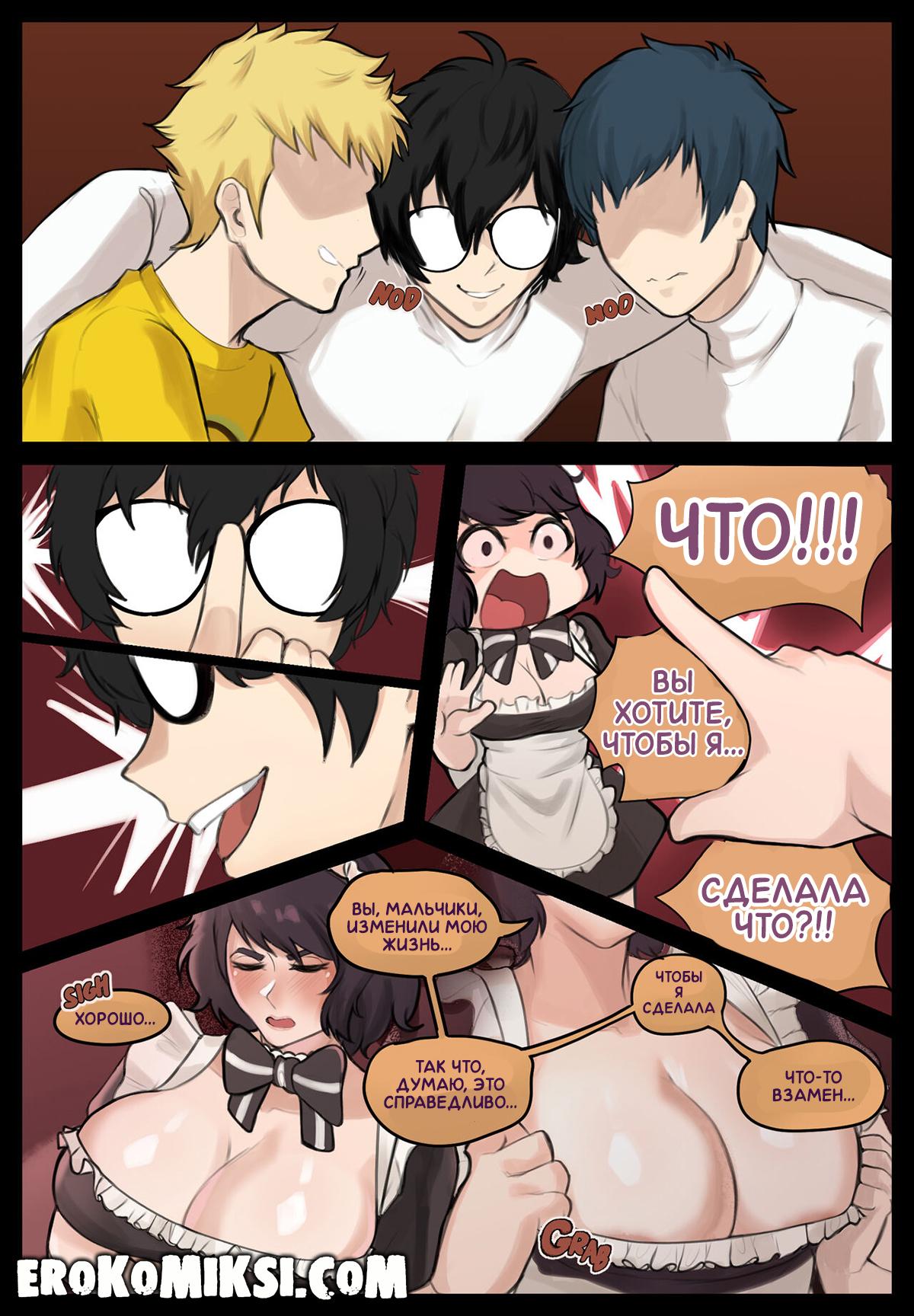 Порно комикс Persona 5. Горячая горничная. Акира поспорил со своими друзьями, что сможет заставить Садаё одеться в костюм горничной и парни пришли к ней в гости. Сперва, Садаё была в недоумении, зачем парни пришли к ней, но когда они начали лапать её большие сиськи, то сильно возбудилась. Они достали свои члены, чем ещё сильнее возбудили девушку и она принялась обрабатывать их огромные члены…