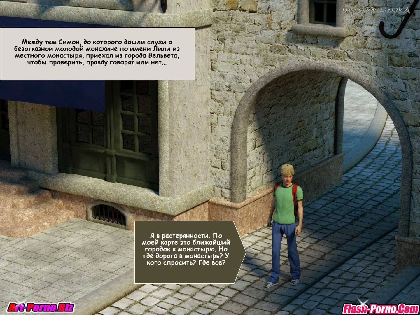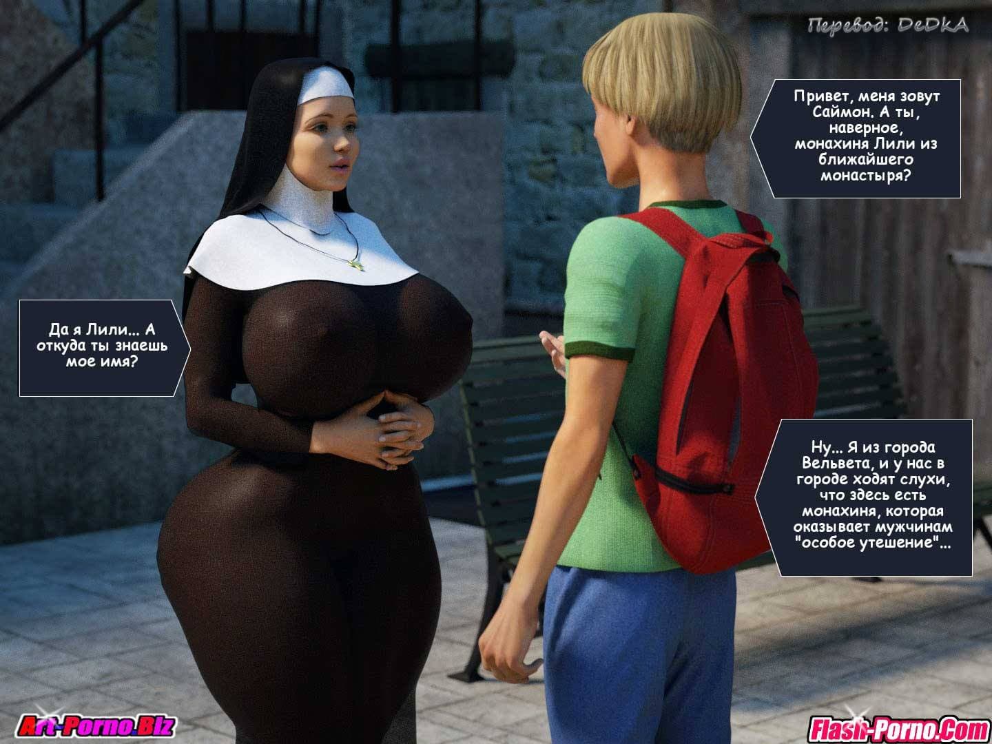 Для дорогих посетителей, обожающих порно комиксы 3 д, представляем возбуждающую историю о девушке по имени Лили, которая, практически все свое время провела в монастыре. Ей уже 19 лет, и Лили, как взрослой девушке доверили некоторые важные обязанности. Пока она их исполняла, Лили иногда приходилось общаться с мужчинами. Те же в свою очередь, были крайне падки на большую грудь монашки, и в порыве страсти просили у Лили «утешения». Отзывчивая, но очень простодушная девушка пыталась идти им на встречу. В то же время она считала себя очень целомудренной девственницей, а, все потому что она «утешала» мужчин только своим анальным отверстием. А использование попы, рта и сисек в плотском удовольствии не считаются, по ее мнению чем-то греховным…