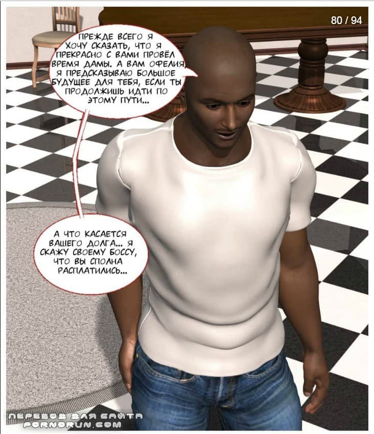 Порно комиксы 3д онлайн вновь порадуют новой историей. Как говорится не надо брать в долг, если не можешь отдать. Вот и в этой семейке так вышло. Один чернокожий парень занял приличную сумму денег одной паре. Те не смогли вернуть. Тогда он сам пришел в дом к должникам, когда там была зрелая мать и ее уже выросшая дочь. Он решил вернуть бабло натурой. Поэтому белокожей Офелии пришлось открыть свой нежный ротик и принять в него большого черного «монстра», входящего ей между губ по самые яйца. День обещал быть насыщенным и это только самое начало возбуждающей истории…