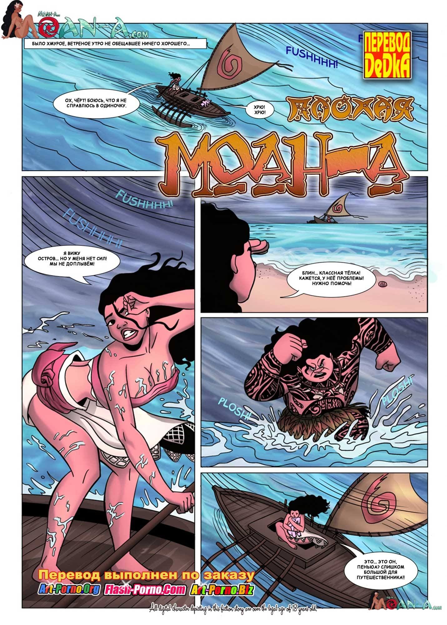 Секс комиксы дисней на русском вновь порадуют вас еще одной историей о Моане. Так с утра лодка Моаны попала в сильный шторм, да такой, что даже ручной свин Моаны, решил, что теперь то им точно пипец и начал жалобно хрюкать. Неожиданно для себя Моана разглядела вдали остров, но она боялась, что у неё не хватит сил управлять болтающейся на волнах лодкой. В момент отчаяния девушка увидела, что по волнам к ним стремительно бежит кто-то большой, и очень испугалась, но оказалось, что это был добродушный полубог, который увидел их и устремился спасать. И он их успел спасти на свою голову…