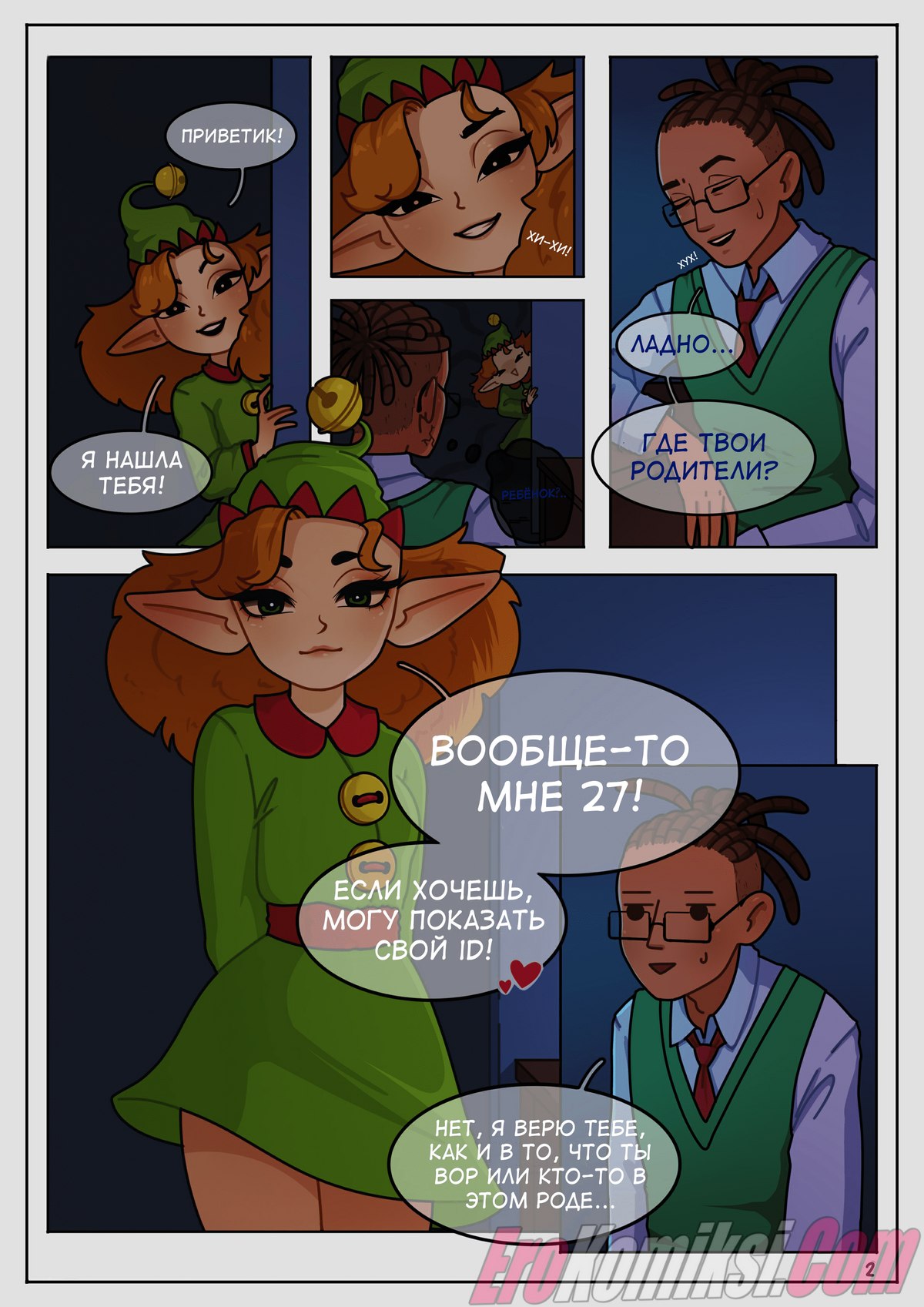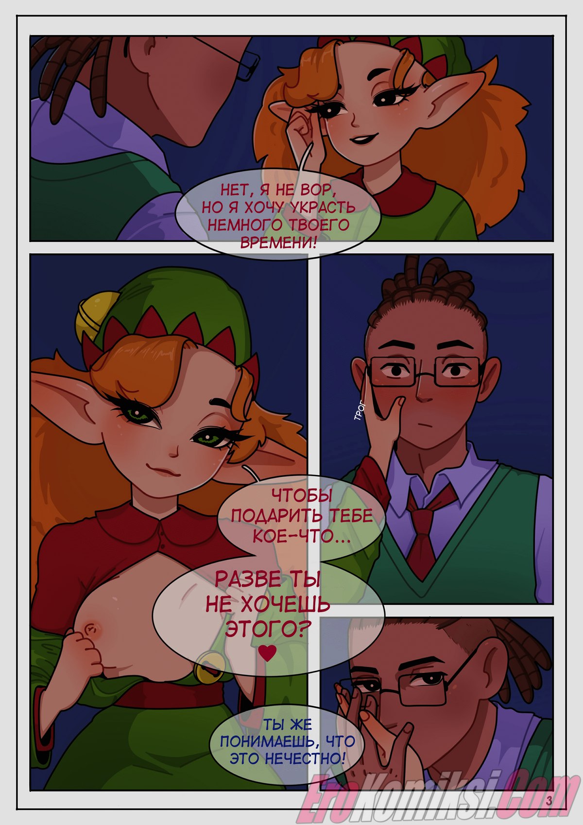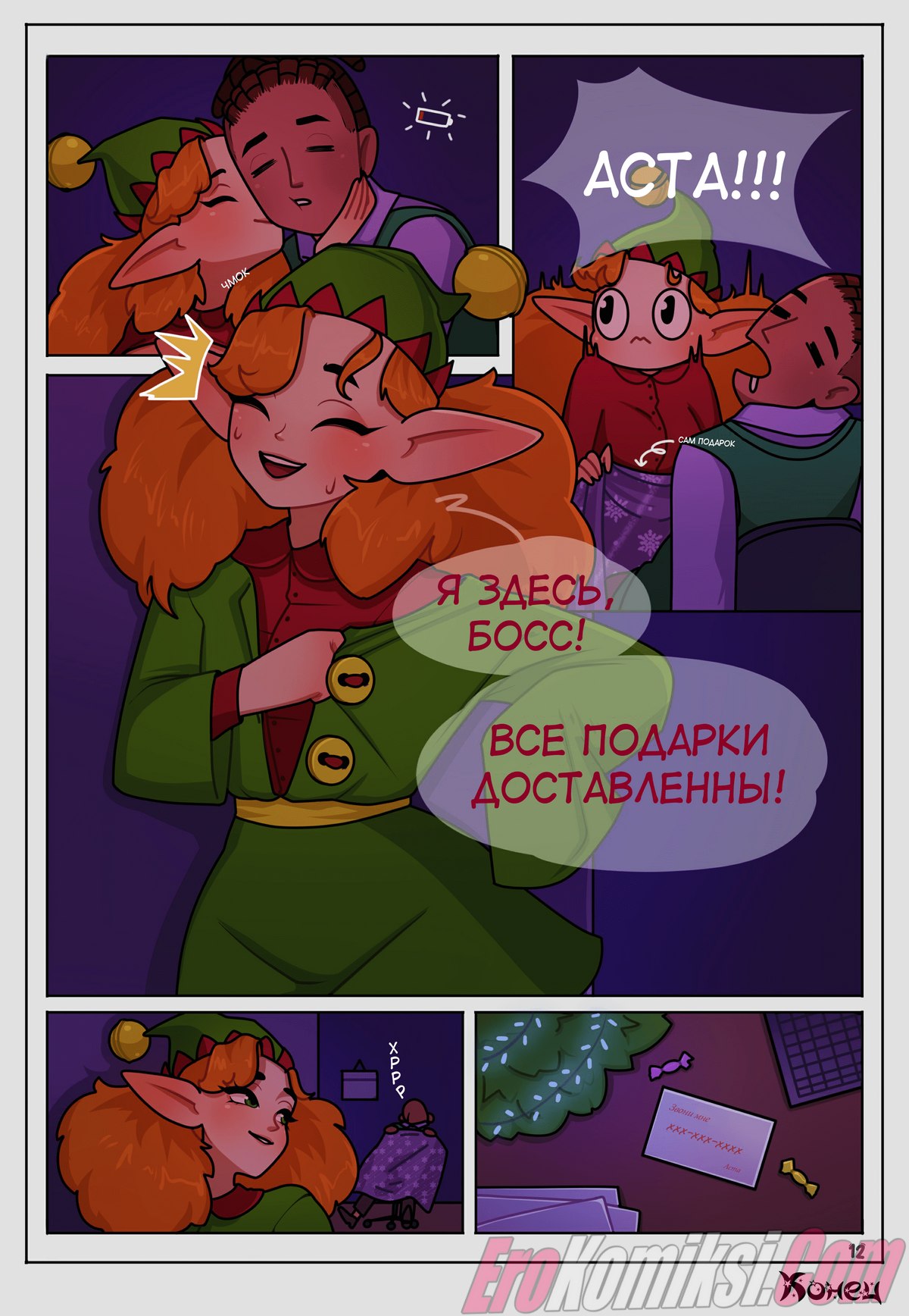 Порно комикс Подарок Асты. Дева-эльфийка, во время доставки, решила развлечься, ну так, на полставки. Герой же, возможность такую, за уши схватил, был в шланг свой укушен и руки скрестил. Слились они после в объятиях страсти, наохались, кончили, тут и кончились сласти. За Астой начальник во гневе пришёл, эльфийку окликнул и вспять уж увёл. На праздник, вот этот, хочу пожелать: чудес необычных и девиц симпатичных, денег побольше и не кончать уж подольше, комиксов классных и небес вам всем ясных!