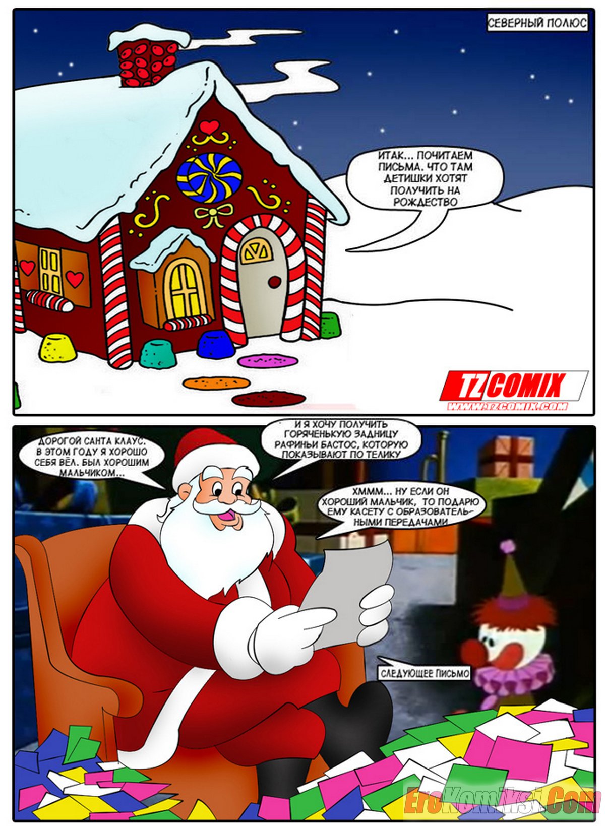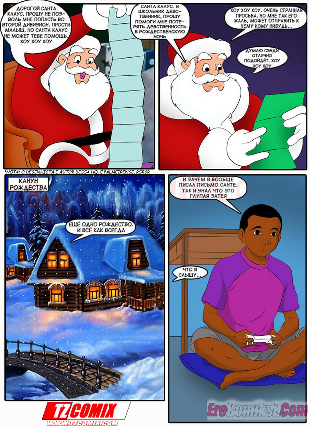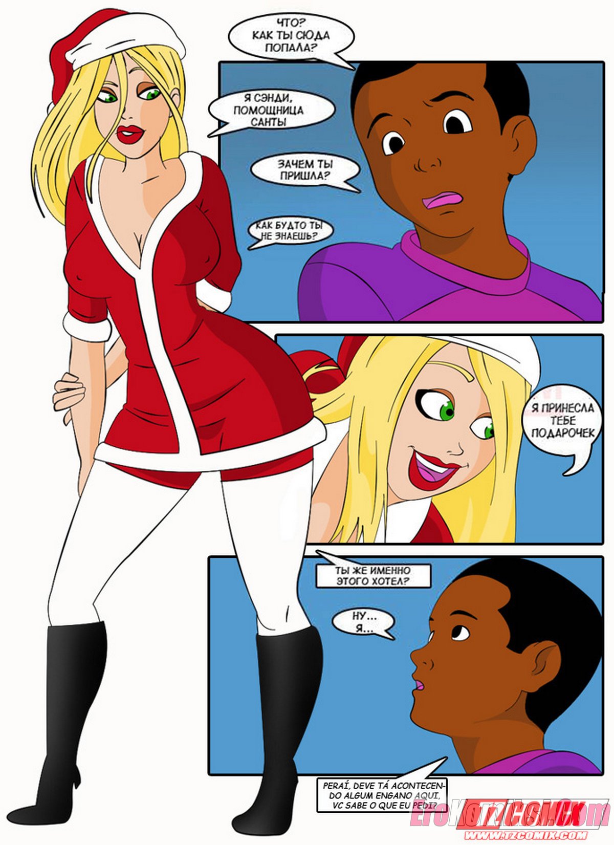 Порно комикс Подарок на рождество. Presente de Natal Сисястая блондинка милфа решила устроить темнокожему праню подарок на рождество. Она надела сексуальный костюм и стала соблазнять парня, после чего отсосала его большой хуй и дала ему себя выебать.