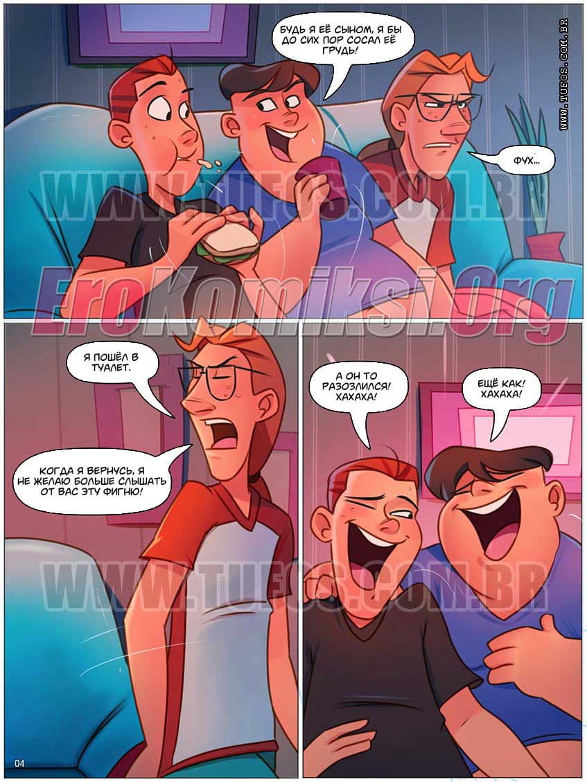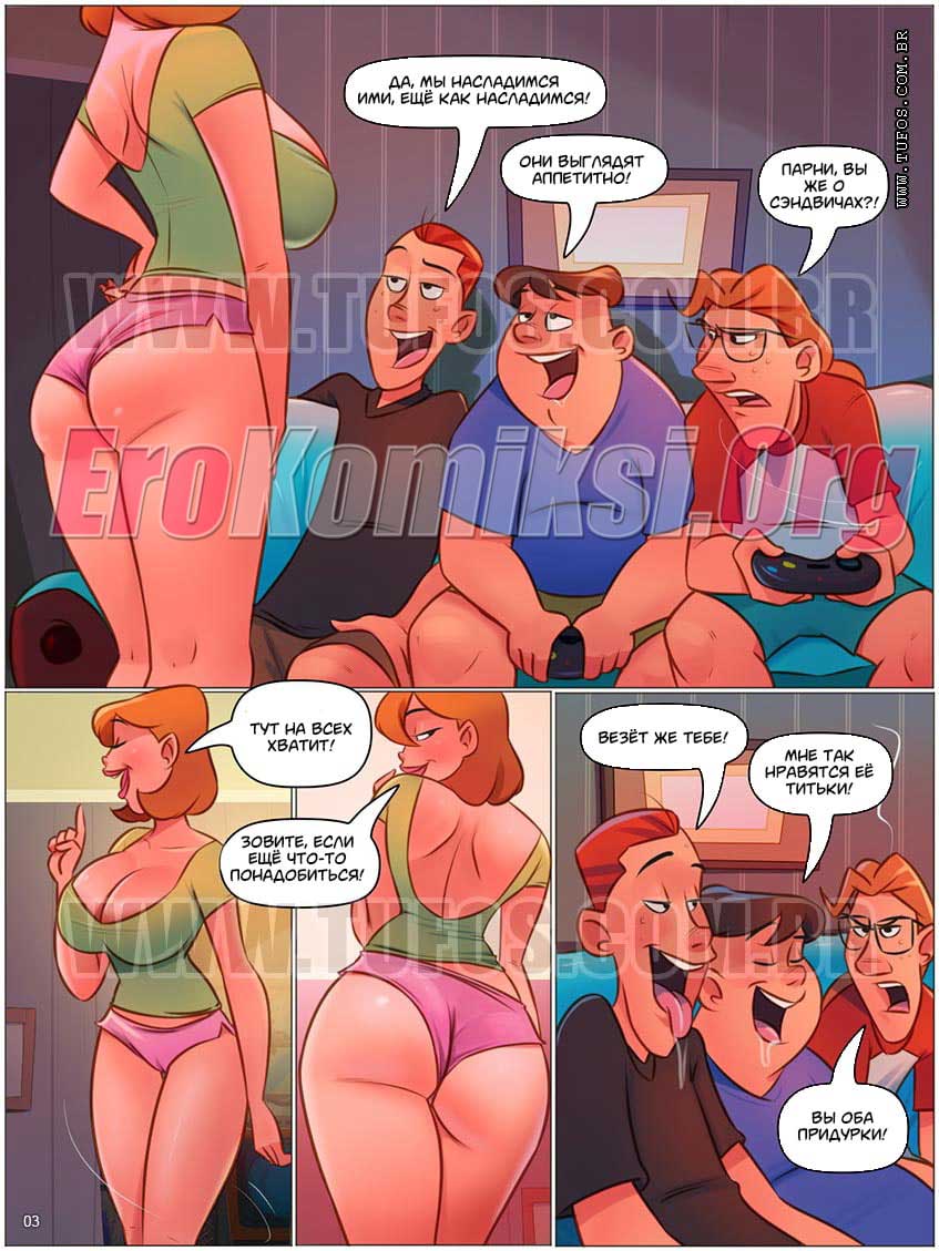 К Карлиньо в гости пришли его друзья, чтобы поиграть в видеоигры, они так долго играли, что проголодались. И его сексапильная мамаша приготовила всем покушать, она одела коротенькие шортики и топ прямо поверх своей большой груди, и соски торчали, а задница выпирала наружу. Когда она пришла в комнату к парням и принесла еду. Друзья её сына очень сильно возбудились при виде такой аппетитной женщины, и захотели поиметь её. После того как она ушла обратно на кухню, возбужденные парни последовали за ней и предложили заняться сексом. Женщине давно не предлагали секс молодые парни и она с удовольствием согласилась.