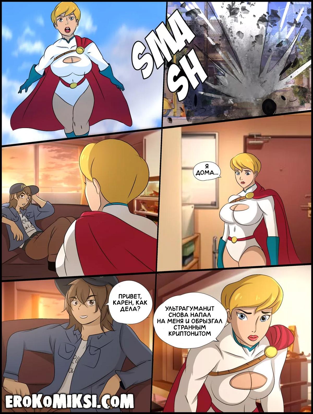 Порно комикс Power Girl. Карен снимает стресс. Карен возвращается домой после очередного спасения человечества, но подвергает воздействию криптонита, от чего у неё возникает стресс, который срочно нужно снять. На благо, дома её ожидает её друг, который как следует трахает красотку и избавляет от накопившегося стресса…