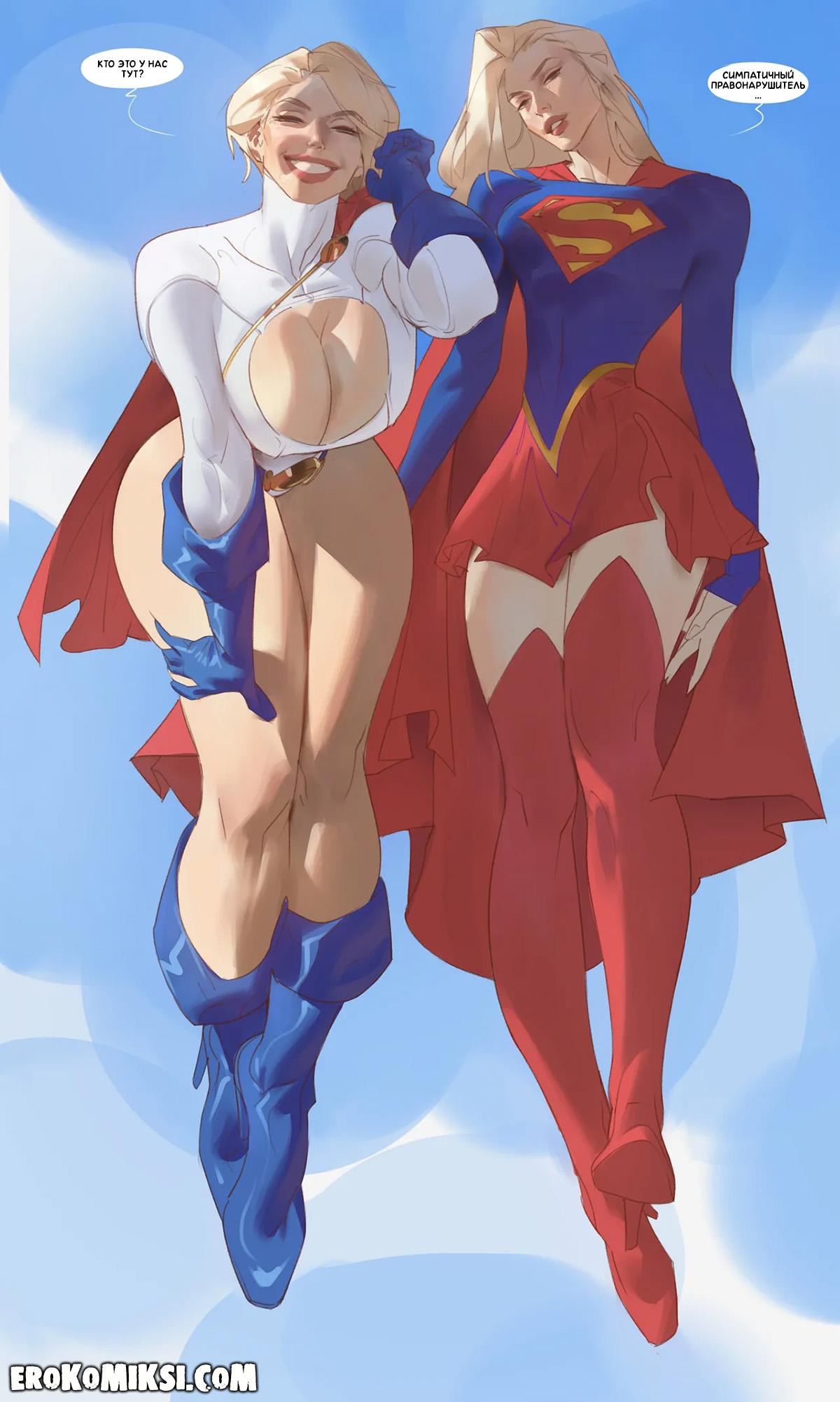 Порно комикс Power Girl & Super Girl. Командная работа. Пауэр-гёрл и Супер-гёрл патрулировали город и наткнулись на правонарушителя, но вместо того, чтобы вести его в полицию, решили немного с ним повеселиться и принялись сосать его огромный член, а затем дали оттрахать свои тугие киски.