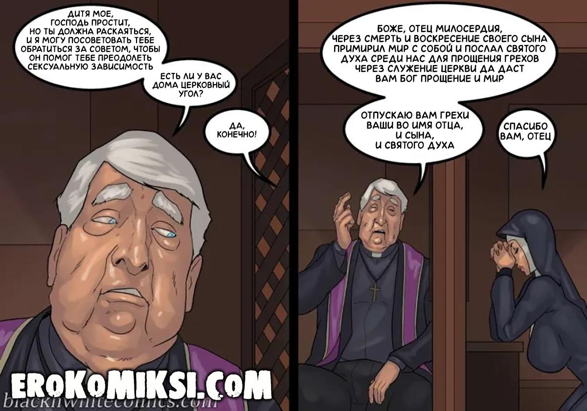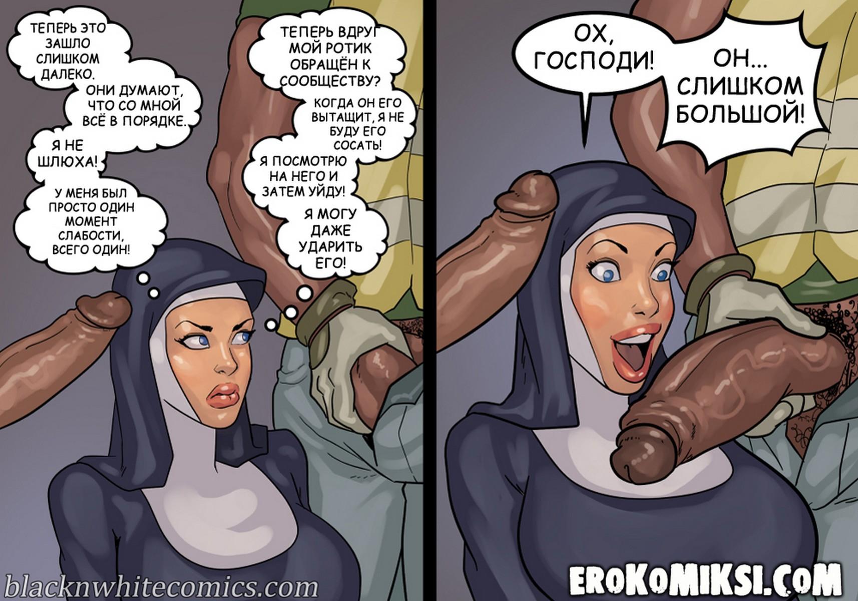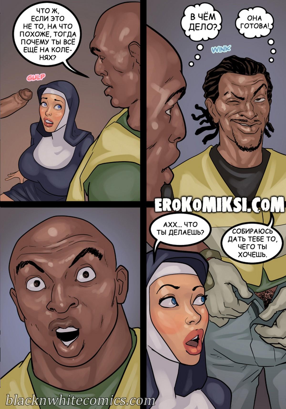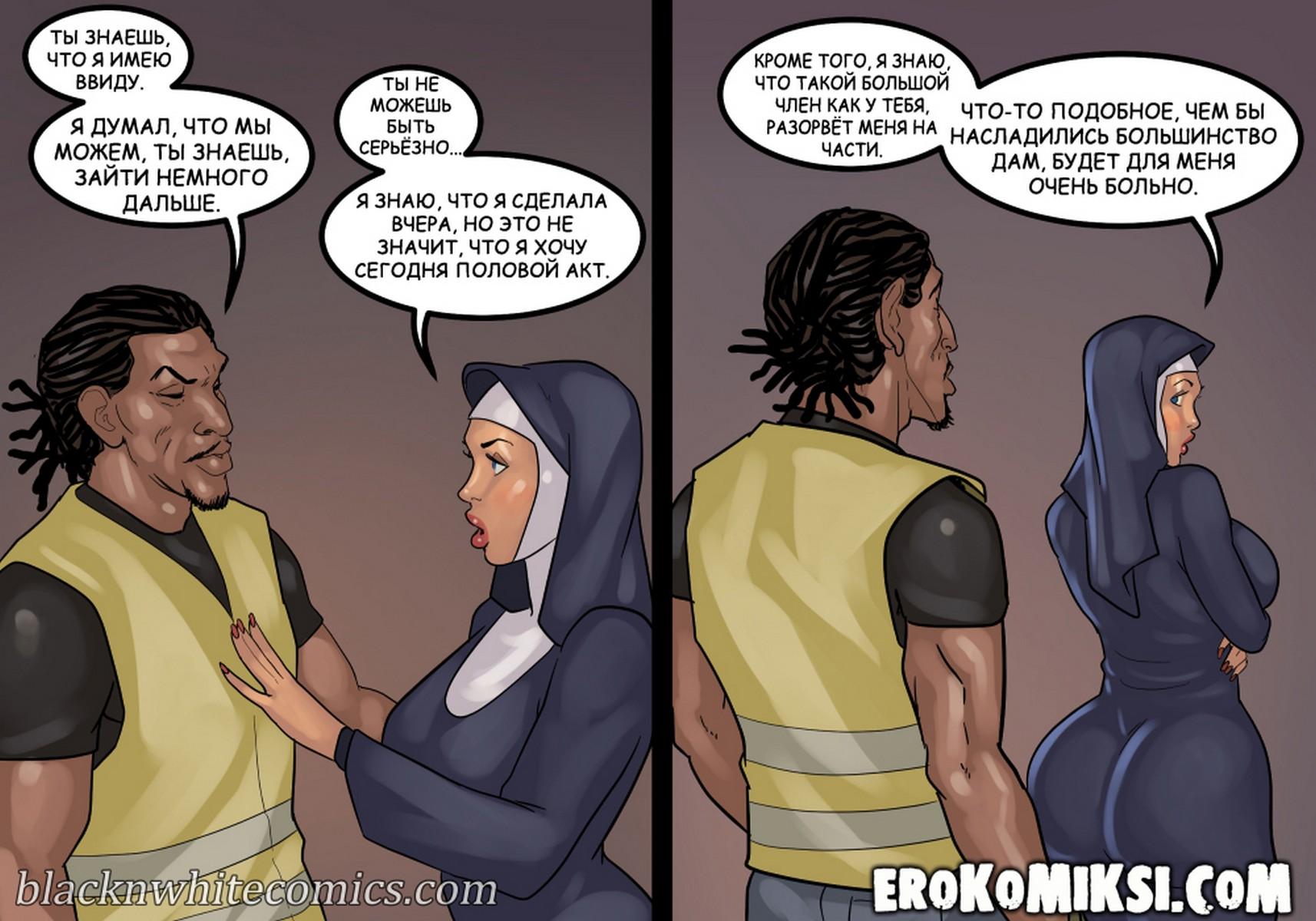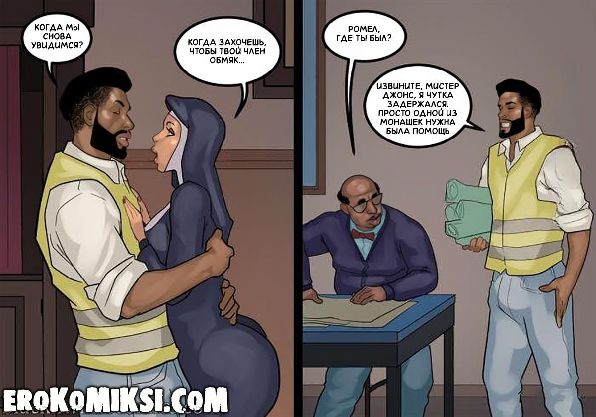 Порно комикс Преданность черным. Монашку Энн искушают грязные мысли. И будто этого мало, в церкви начался плановый ремонт. Девушку остановил рабочий и начал приставать к ней. Это завело Энн и она не может избавиться от страстных ощущений…