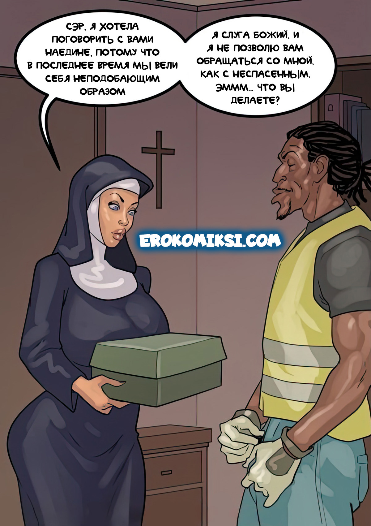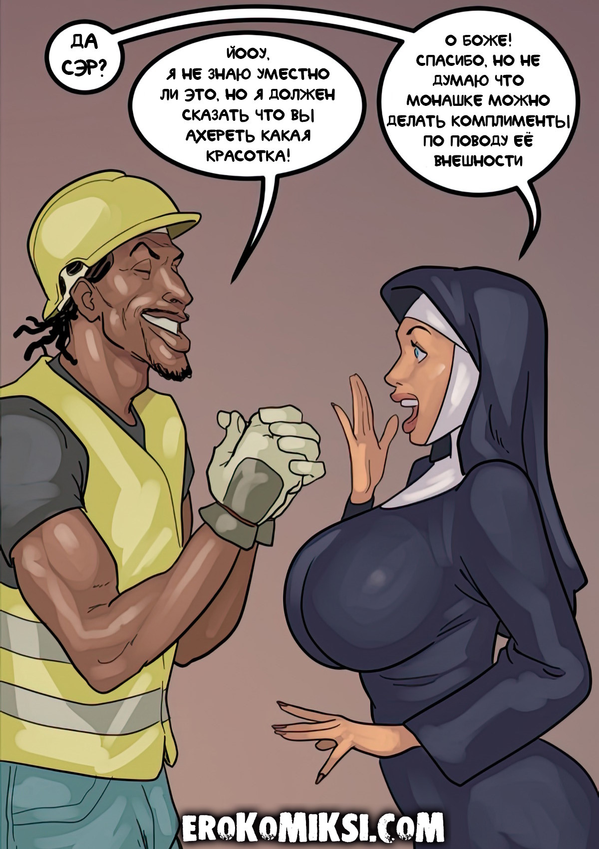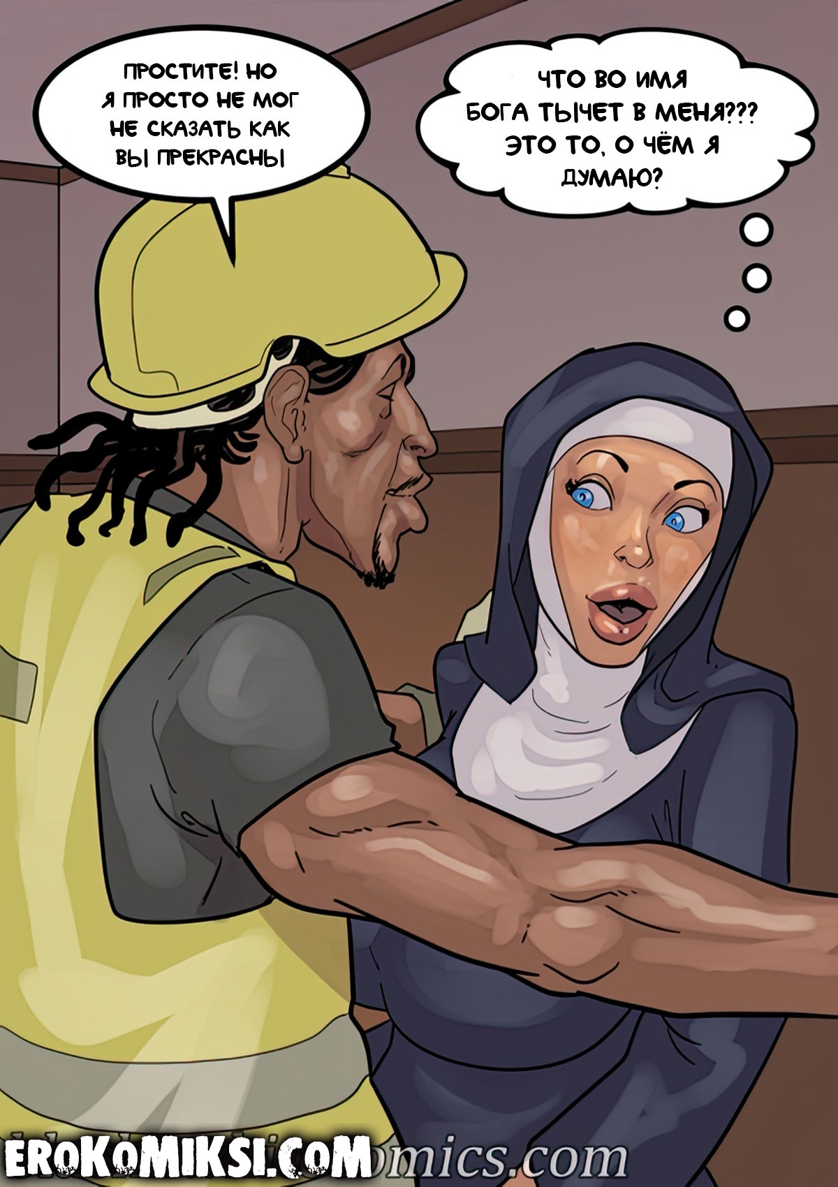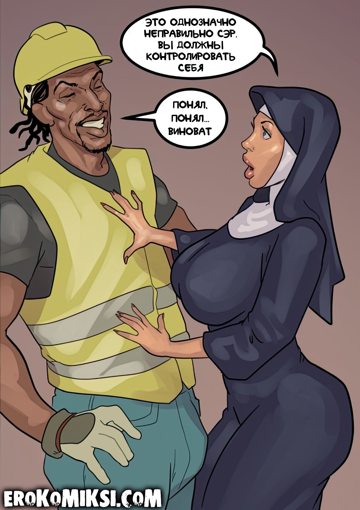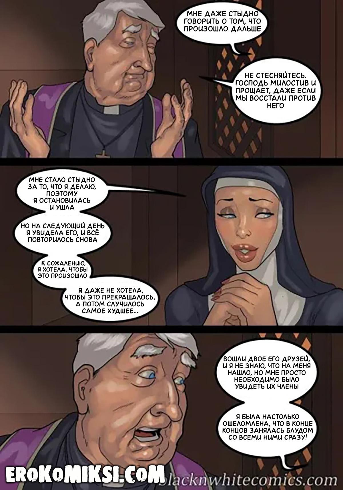 Порно комикс Преданность черным. Монашку Энн искушают грязные мысли. И будто этого мало, в церкви начался плановый ремонт. Девушку остановил рабочий и начал приставать к ней. Это завело Энн и она не может избавиться от страстных ощущений…