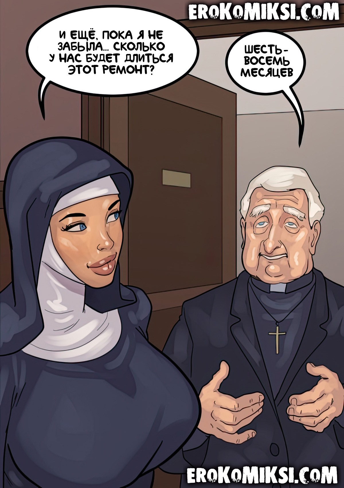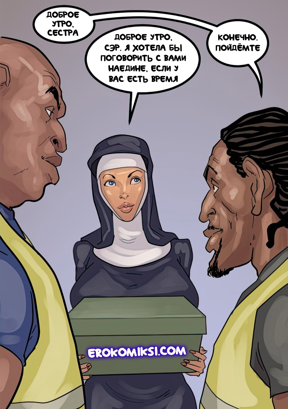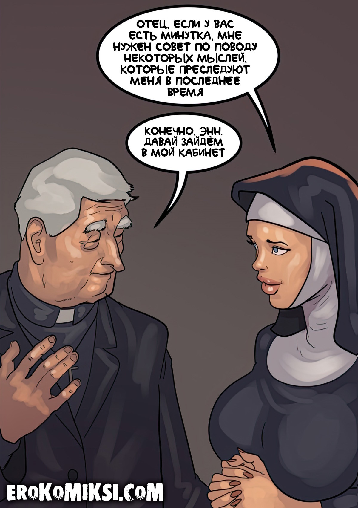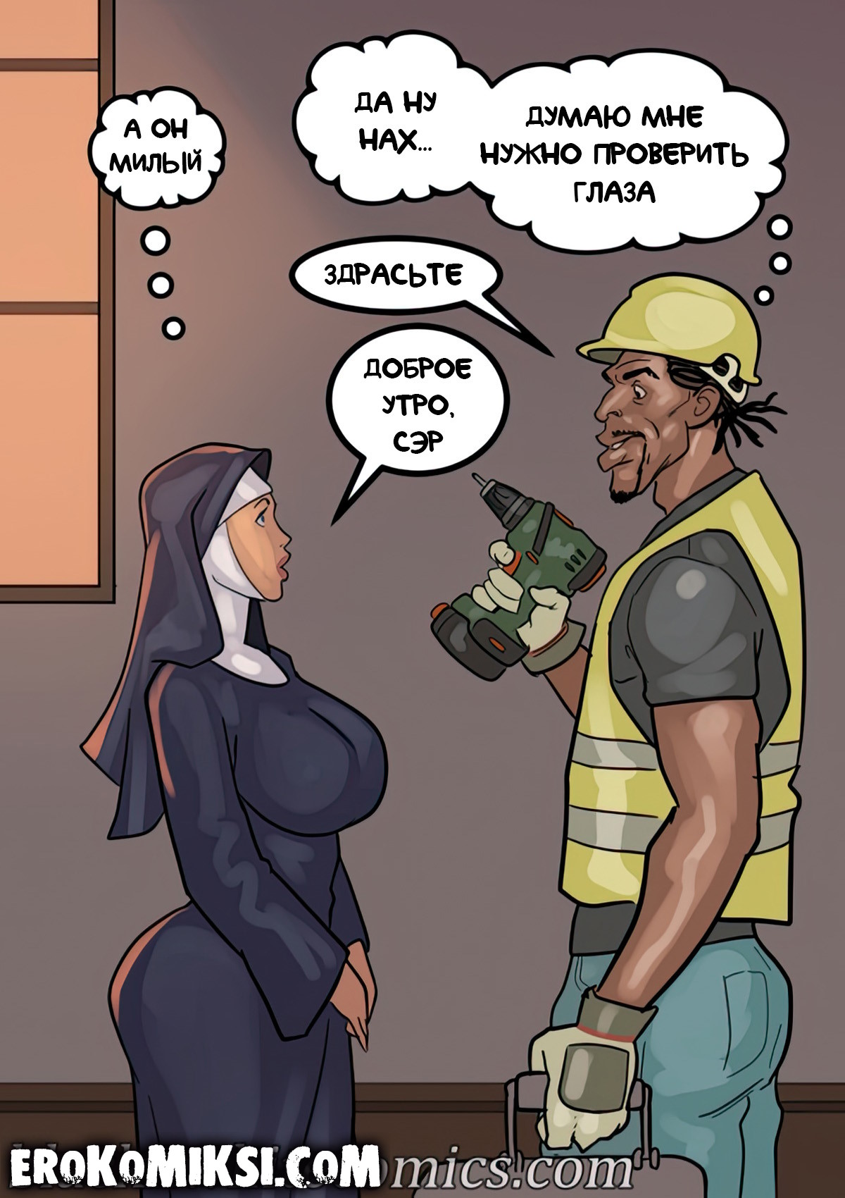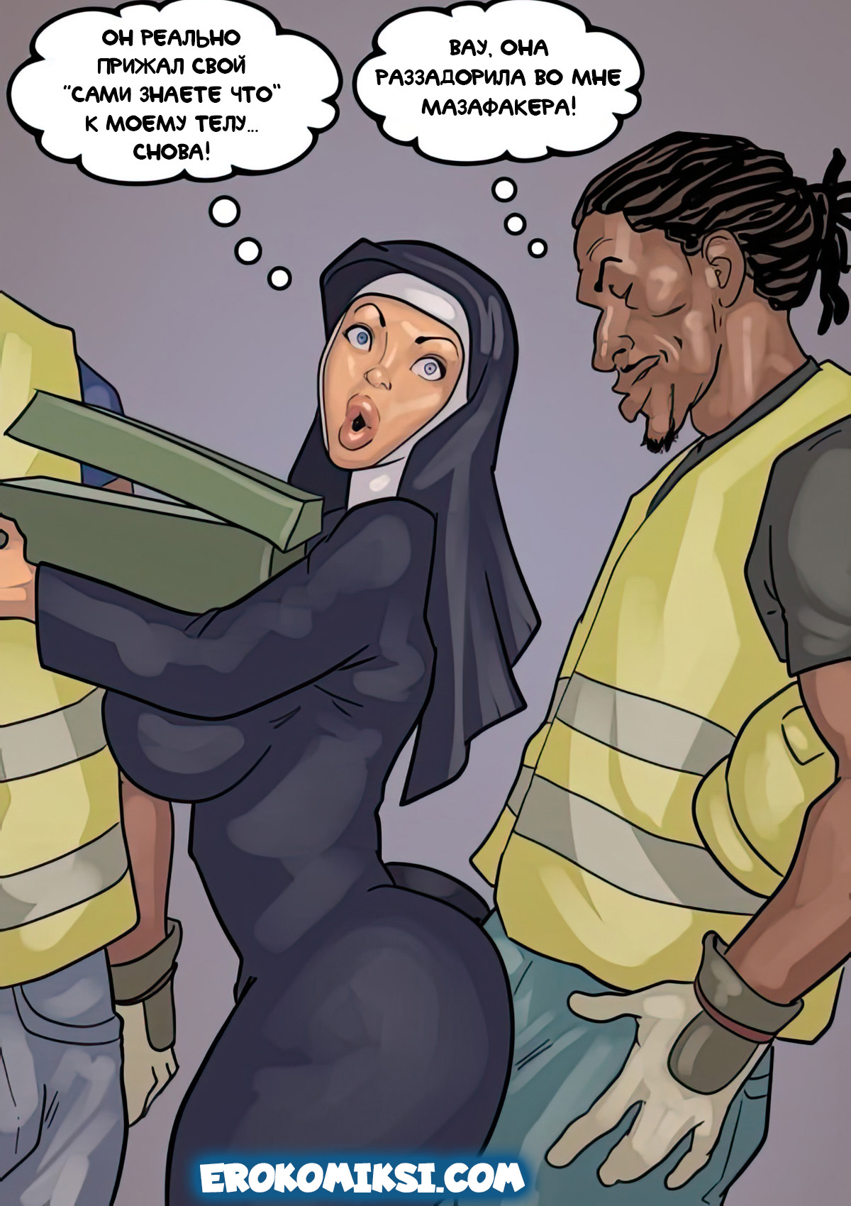 Порно комикс Преданность черным. Монашку Энн искушают грязные мысли. И будто этого мало, в церкви начался плановый ремонт. Девушку остановил рабочий и начал приставать к ней. Это завело Энн и она не может избавиться от страстных ощущений…