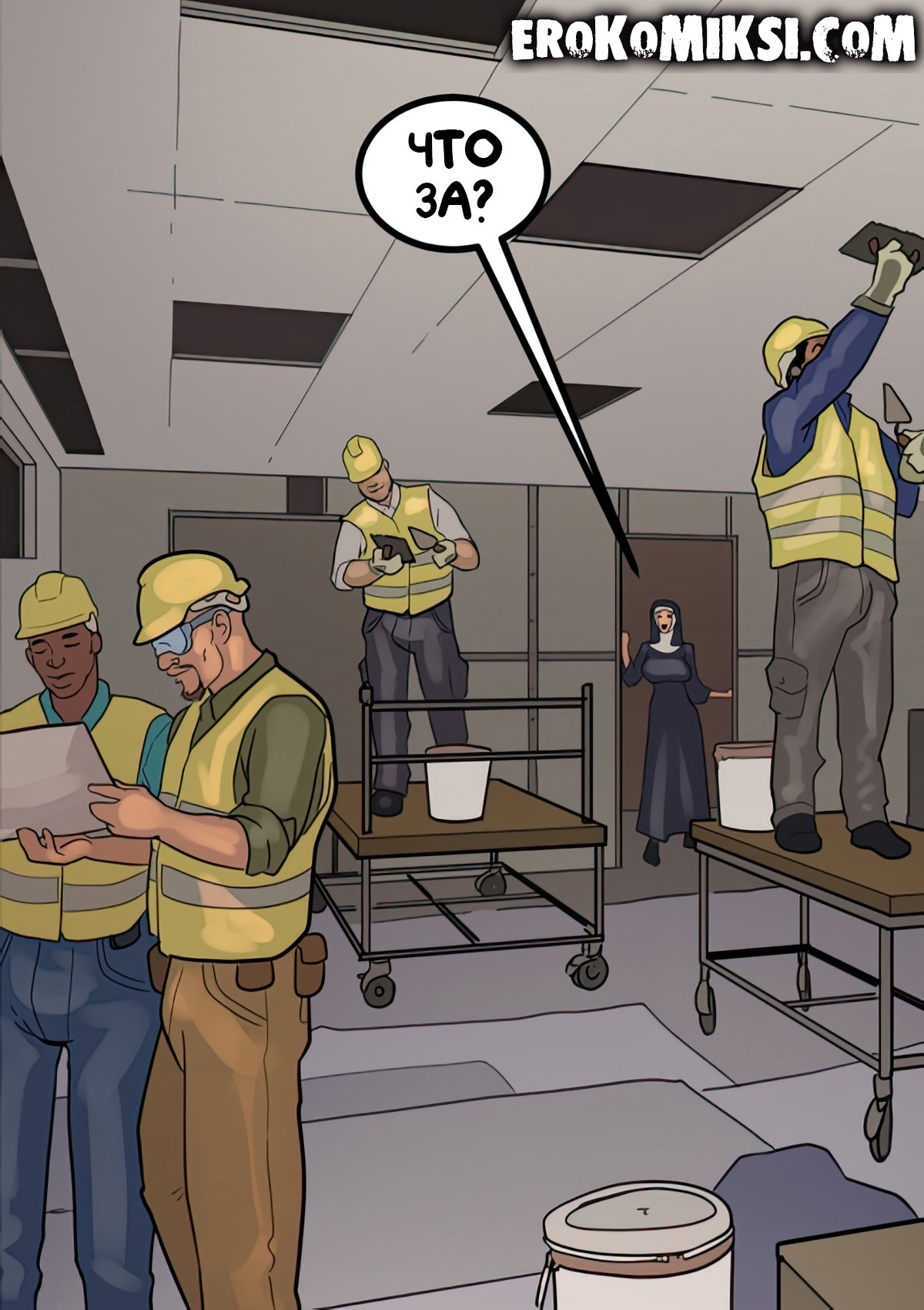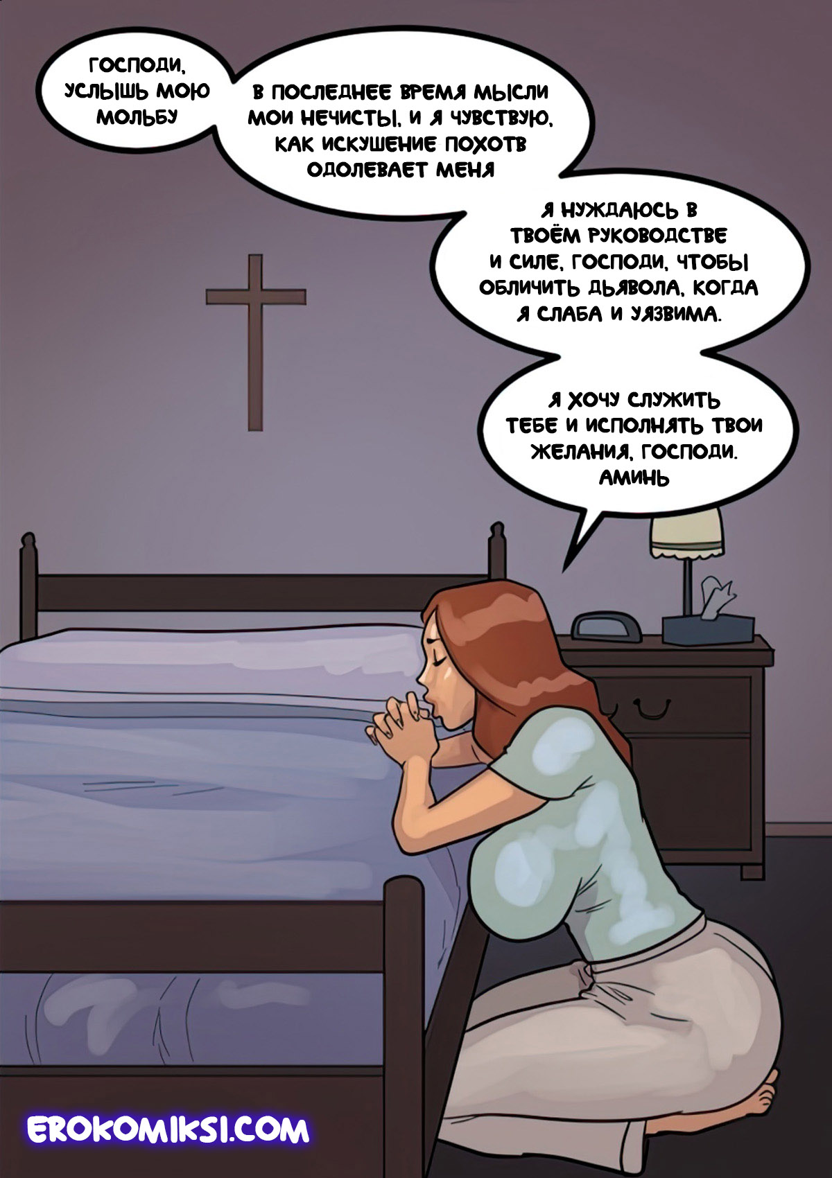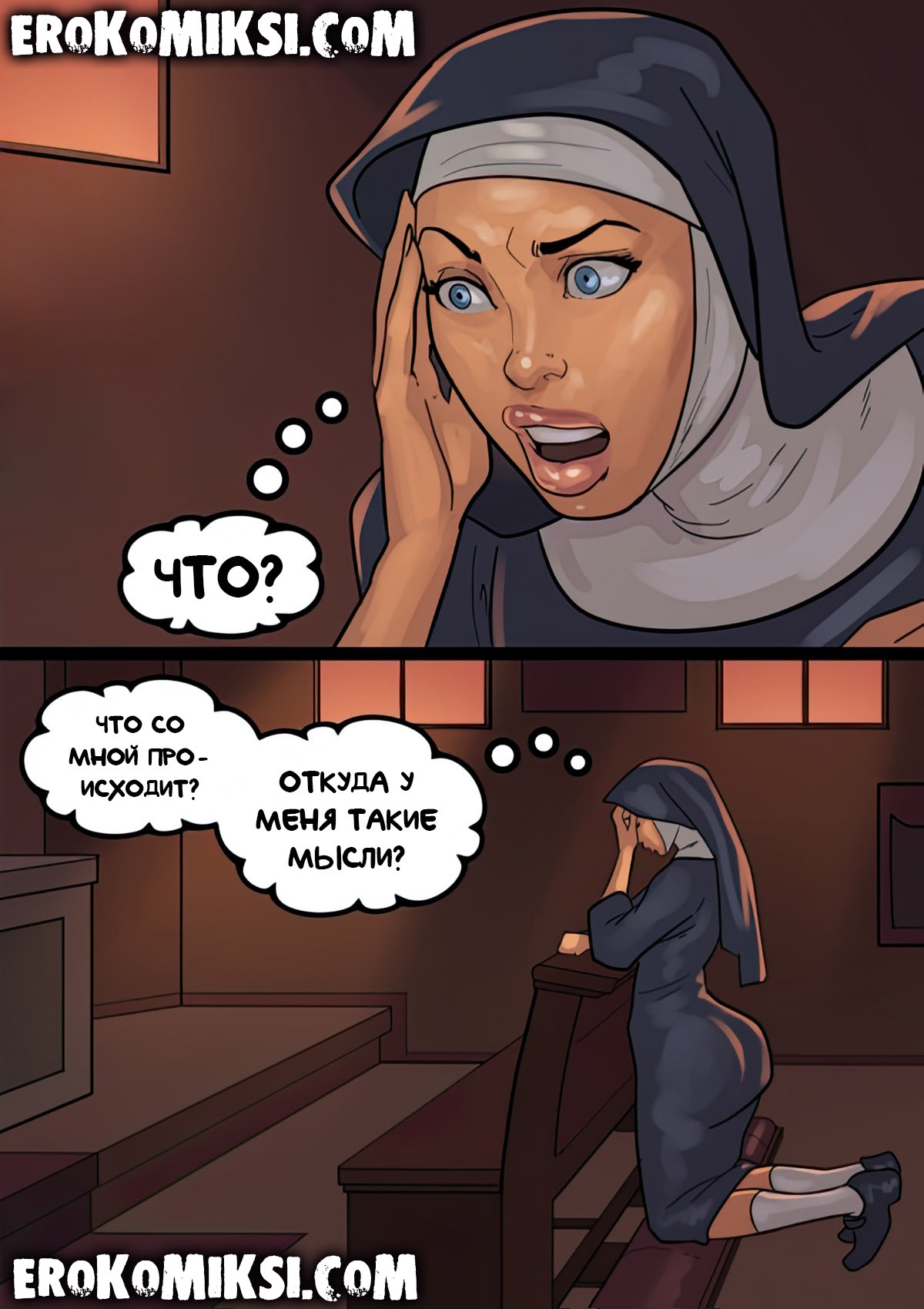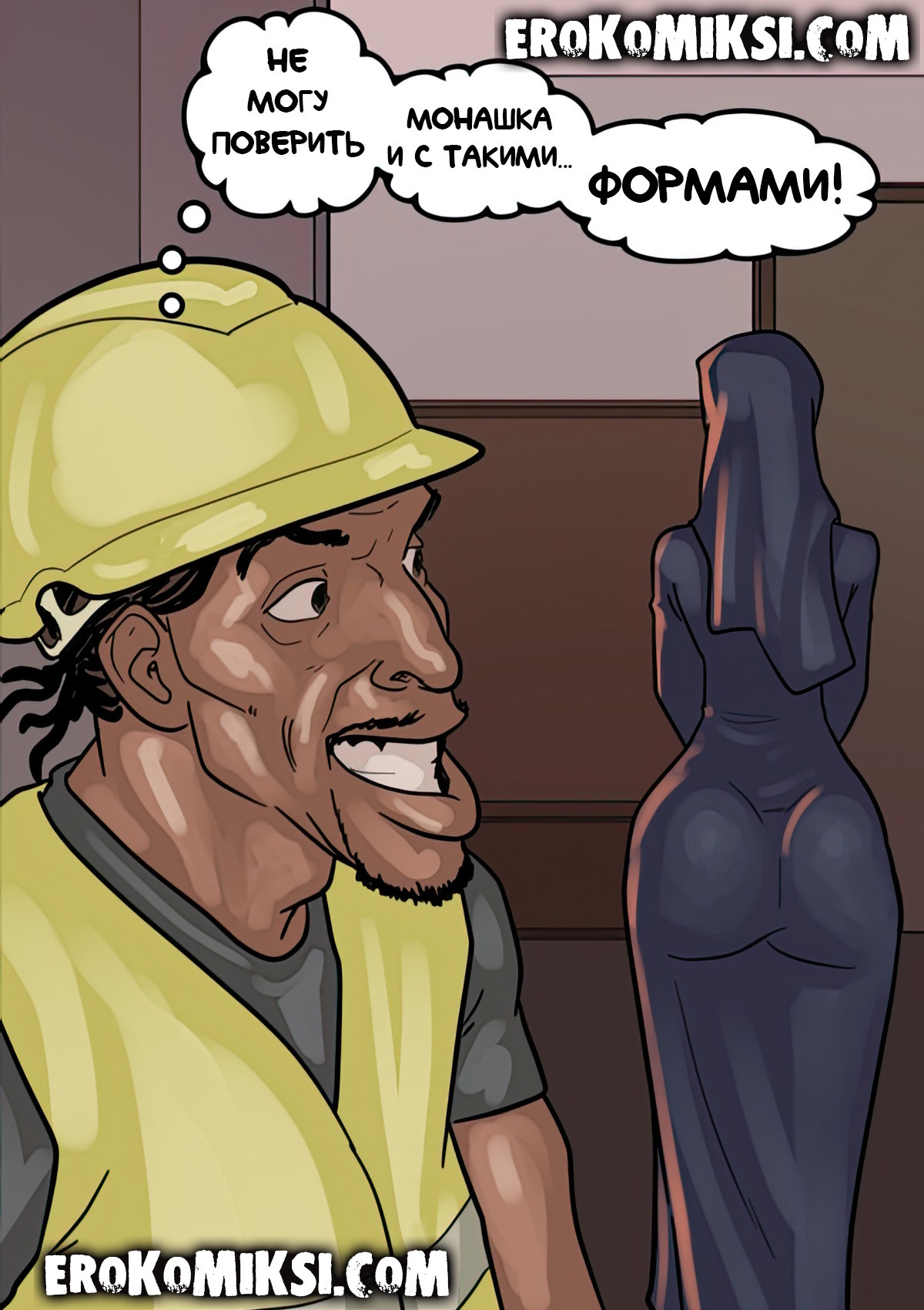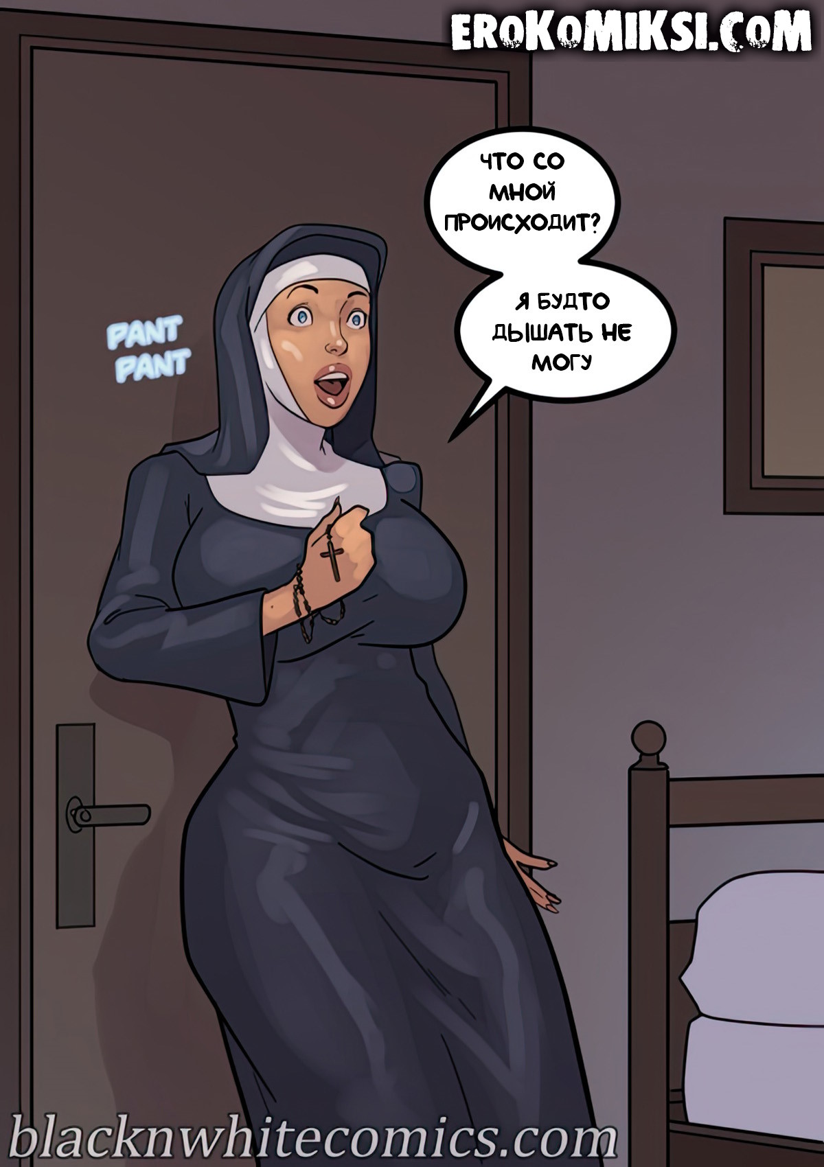 Порно комикс Преданность черным. Монашку Энн искушают грязные мысли. И будто этого мало, в церкви начался плановый ремонт. Девушку остановил рабочий и начал приставать к ней. Это завело Энн и она не может избавиться от страстных ощущений…