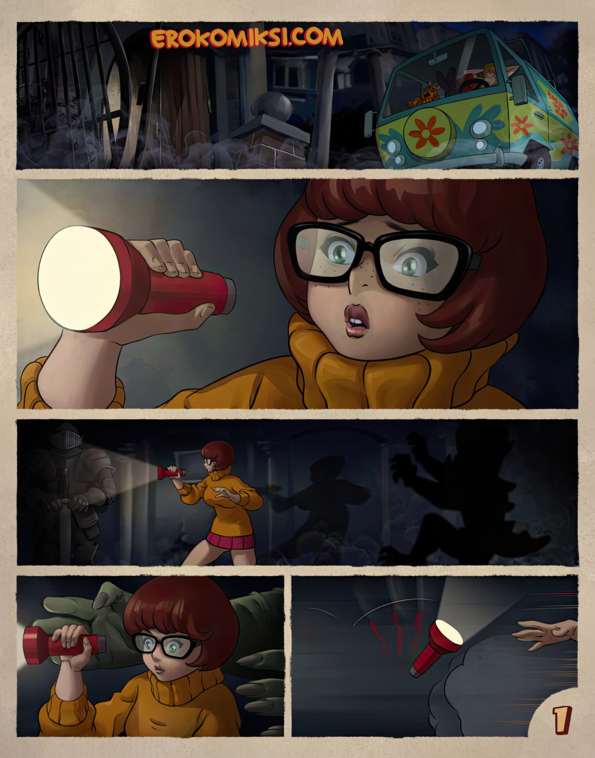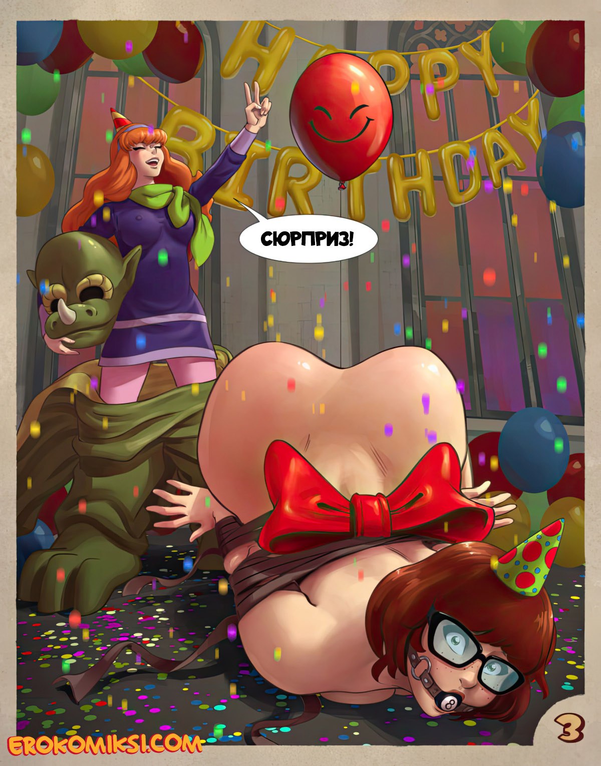 Порно комикс Приключения Велмы. День рождения. Дафна хочет устроить Велме вечеринку на день рождение. Но основным подарком для неё станет Фред, который воспользуется возможностью и однозначно оттрахает жопастую Велму…